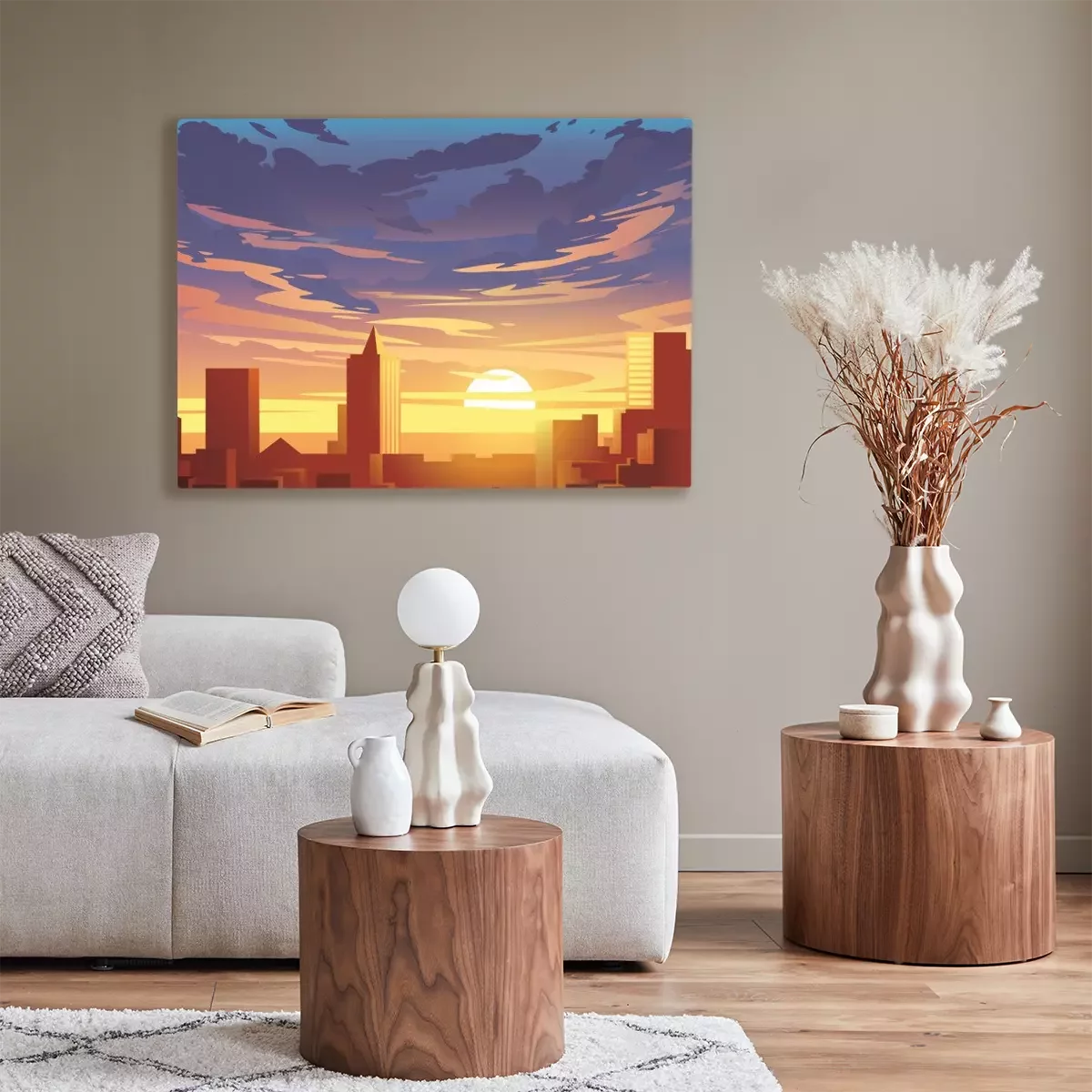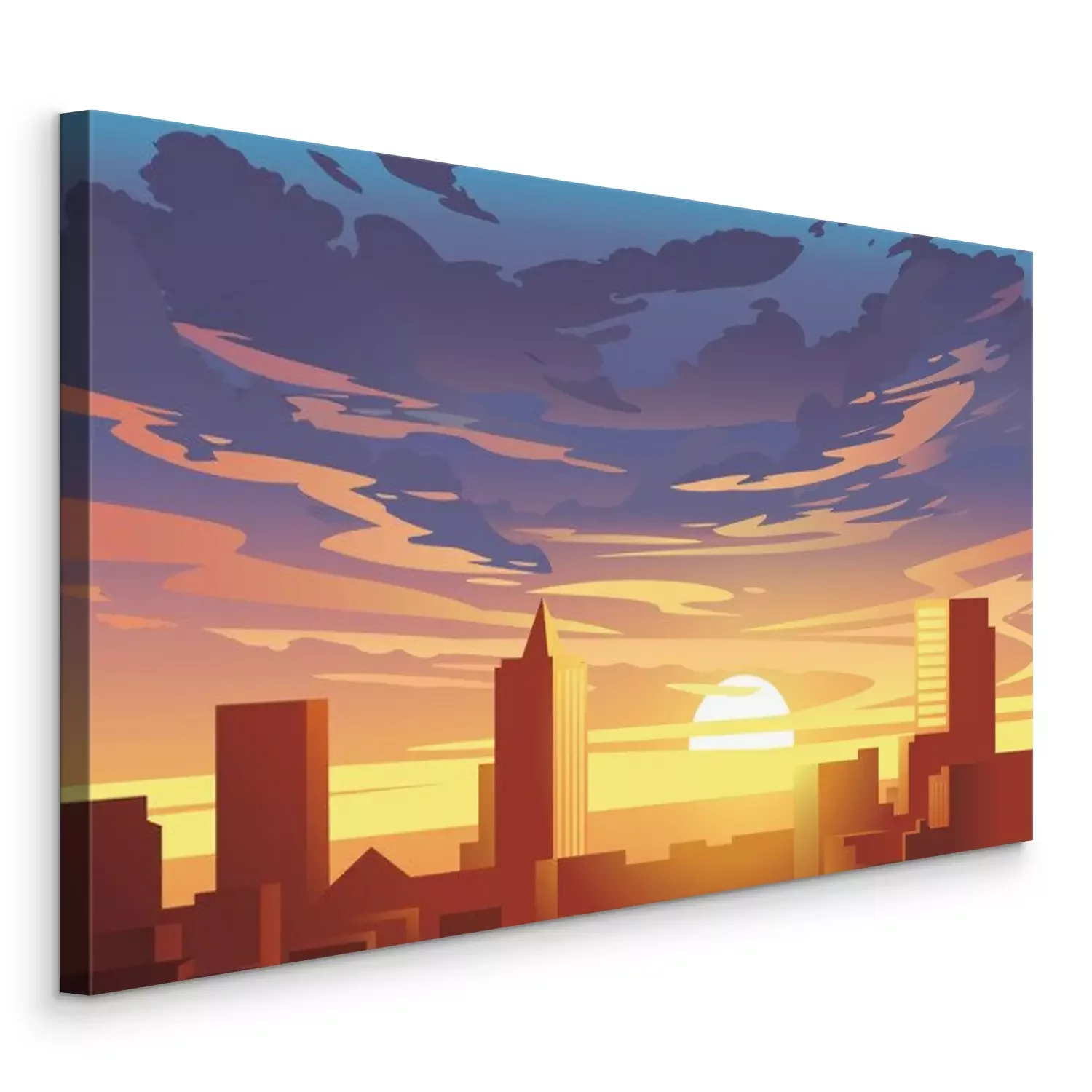 Canvas Evening city panorama, vector, sunset. Flat anime style