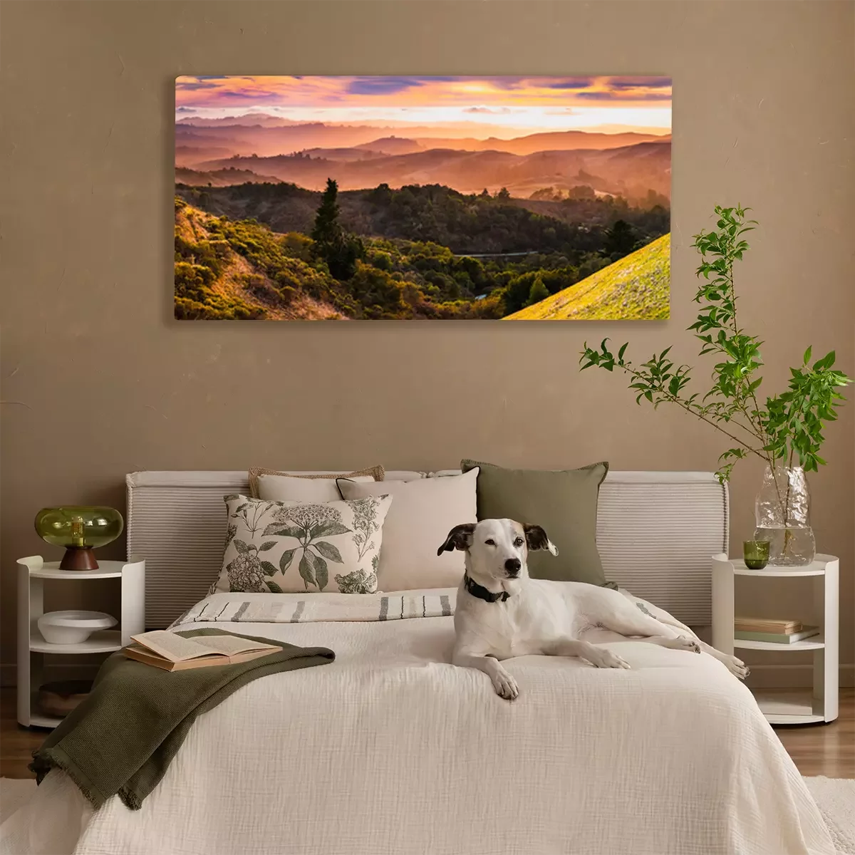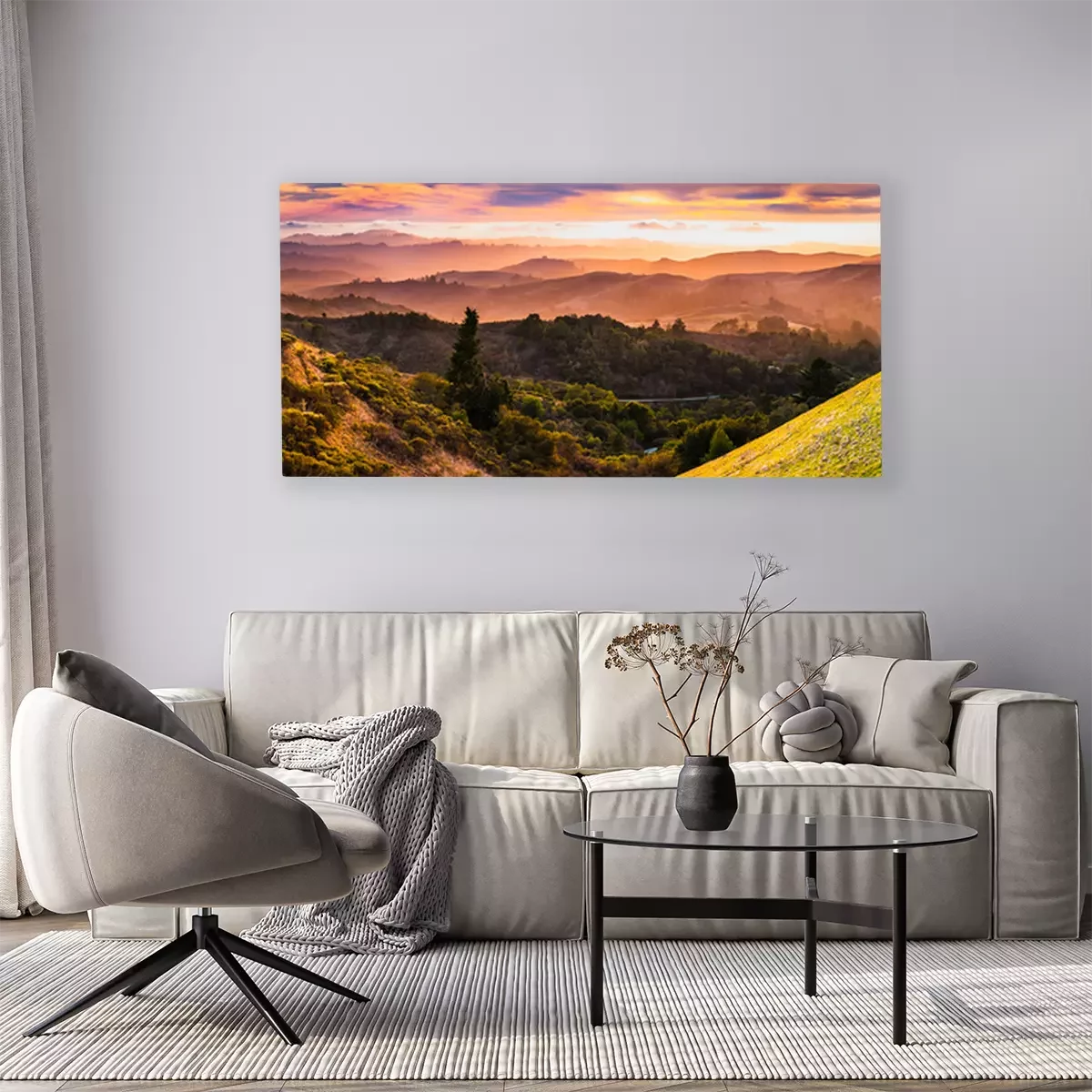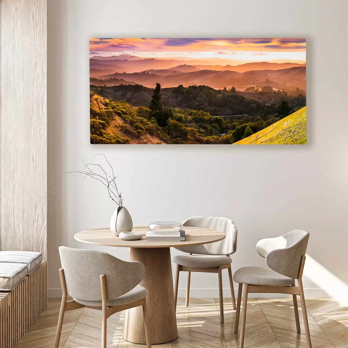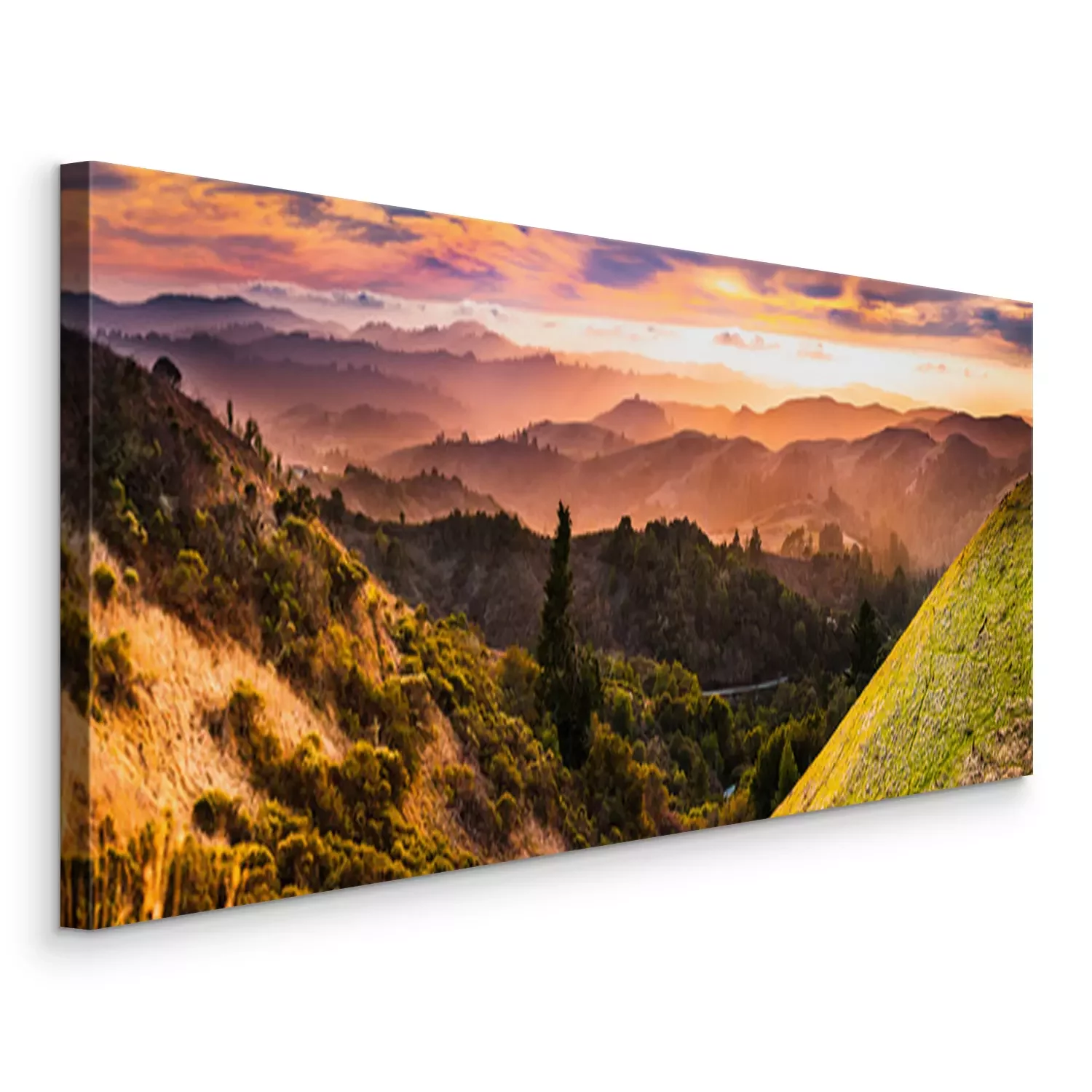 Canvas Expansive panorama in Santa Cruz mountains, with hills and valleys illuminated by the sunset light; San Francisco Bay Area, California
