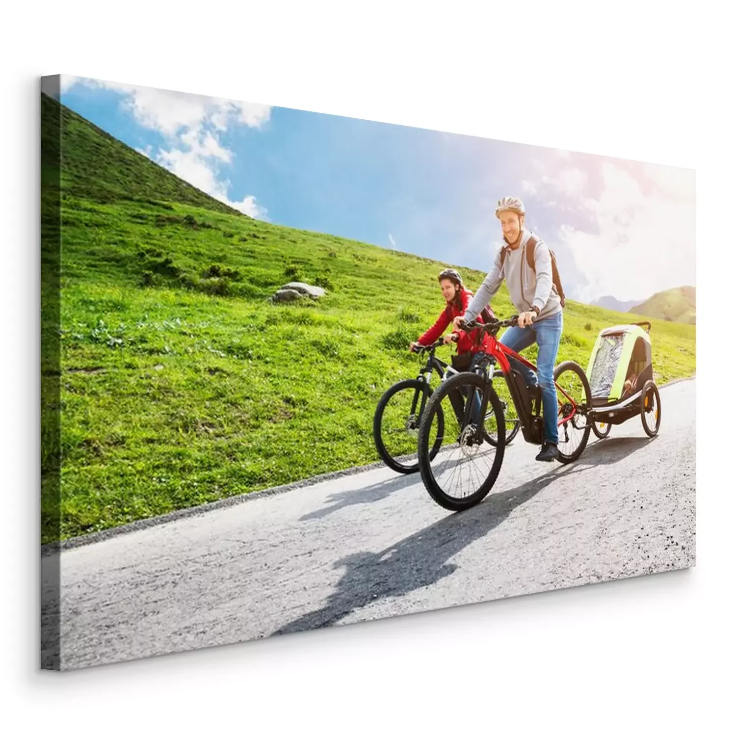 Canvas: Family With Child In Trailer Riding Mountain Bikes