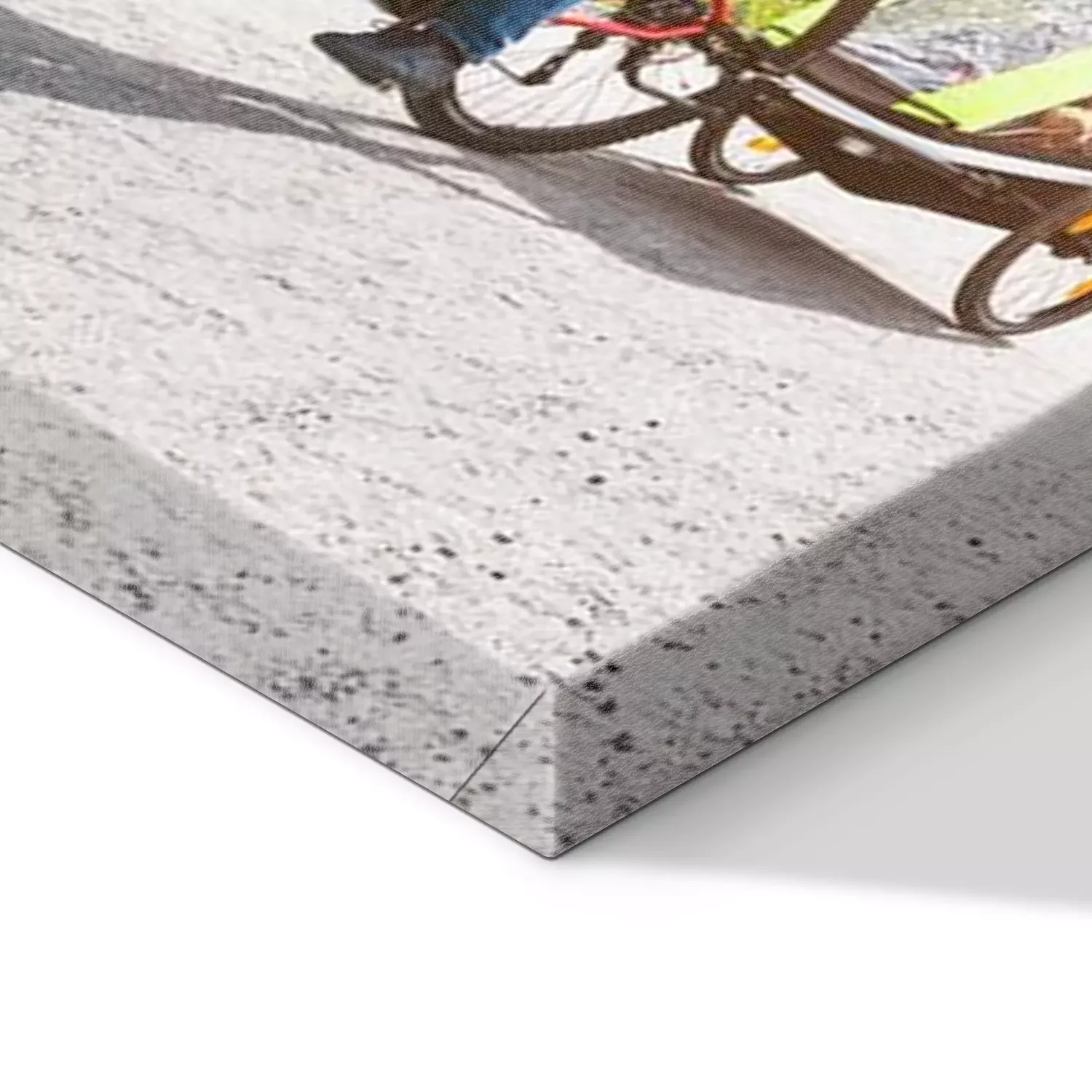 De print wordt aangebracht op hoogwaardig canvas dat op een schildersweefgetouw (spieraam) wordt gespannen. Omdat de print de zijranden bedekt, hoeft het ontwerp niet met een extra kader te worden omlijst. Wij raden ook composities aan die uit meerdere foto's bestaan en zo een coherente compositie vormen.