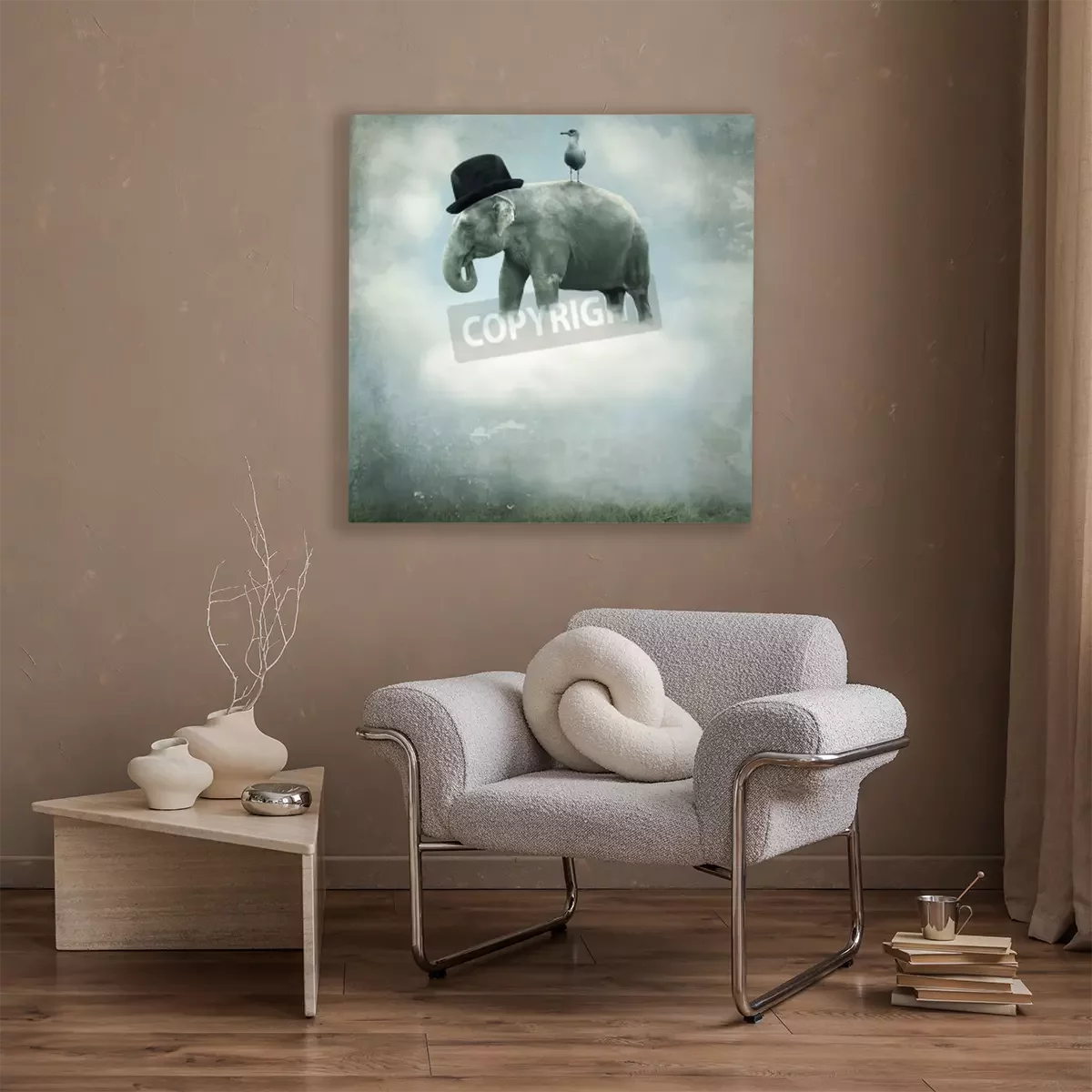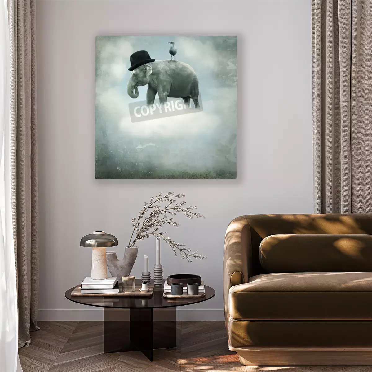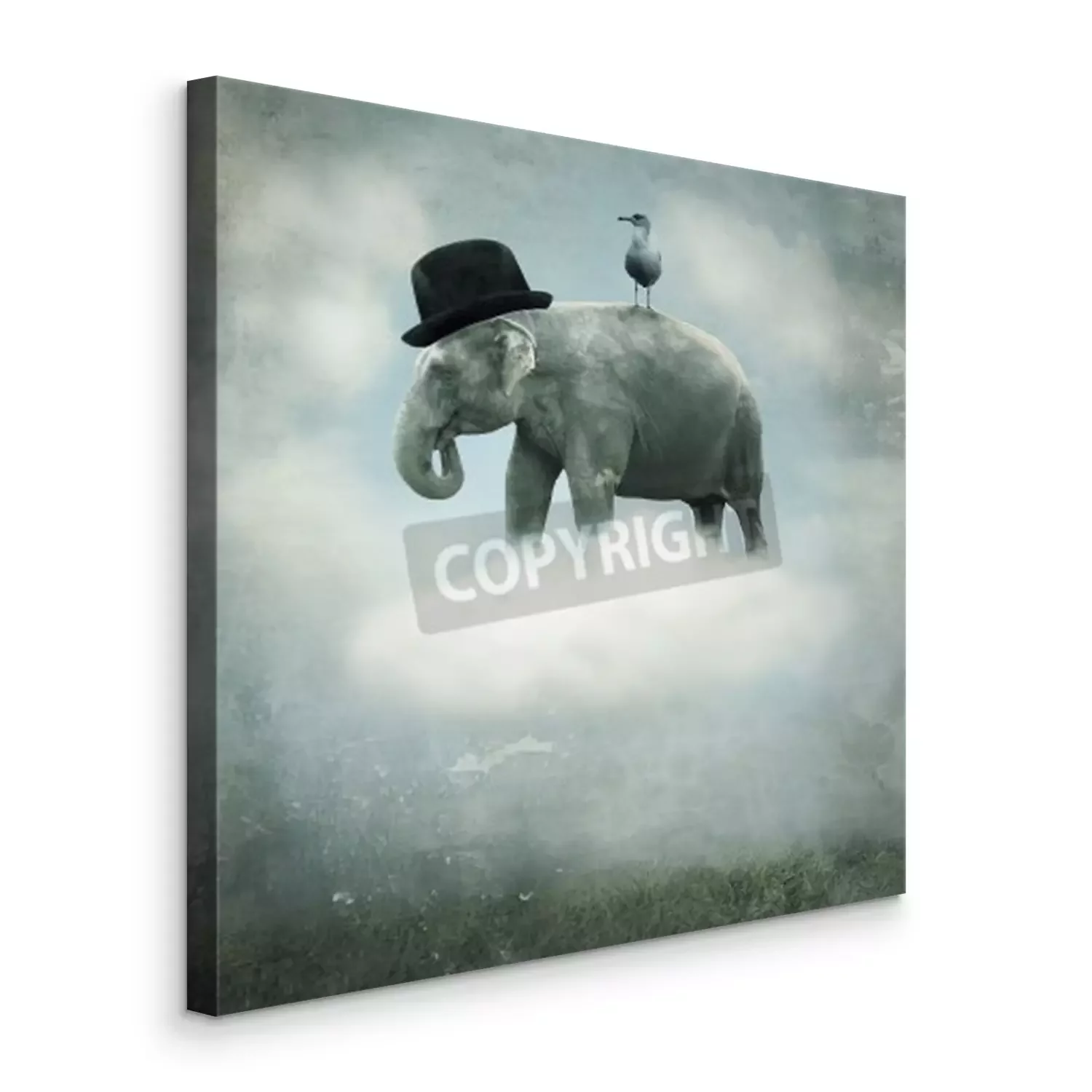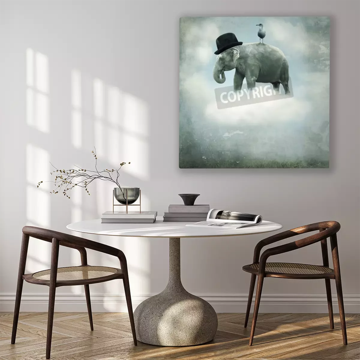 Canvas: Fantasy surrealistic background with an elephant with a hat and a gull that flying on a cloud in the sky