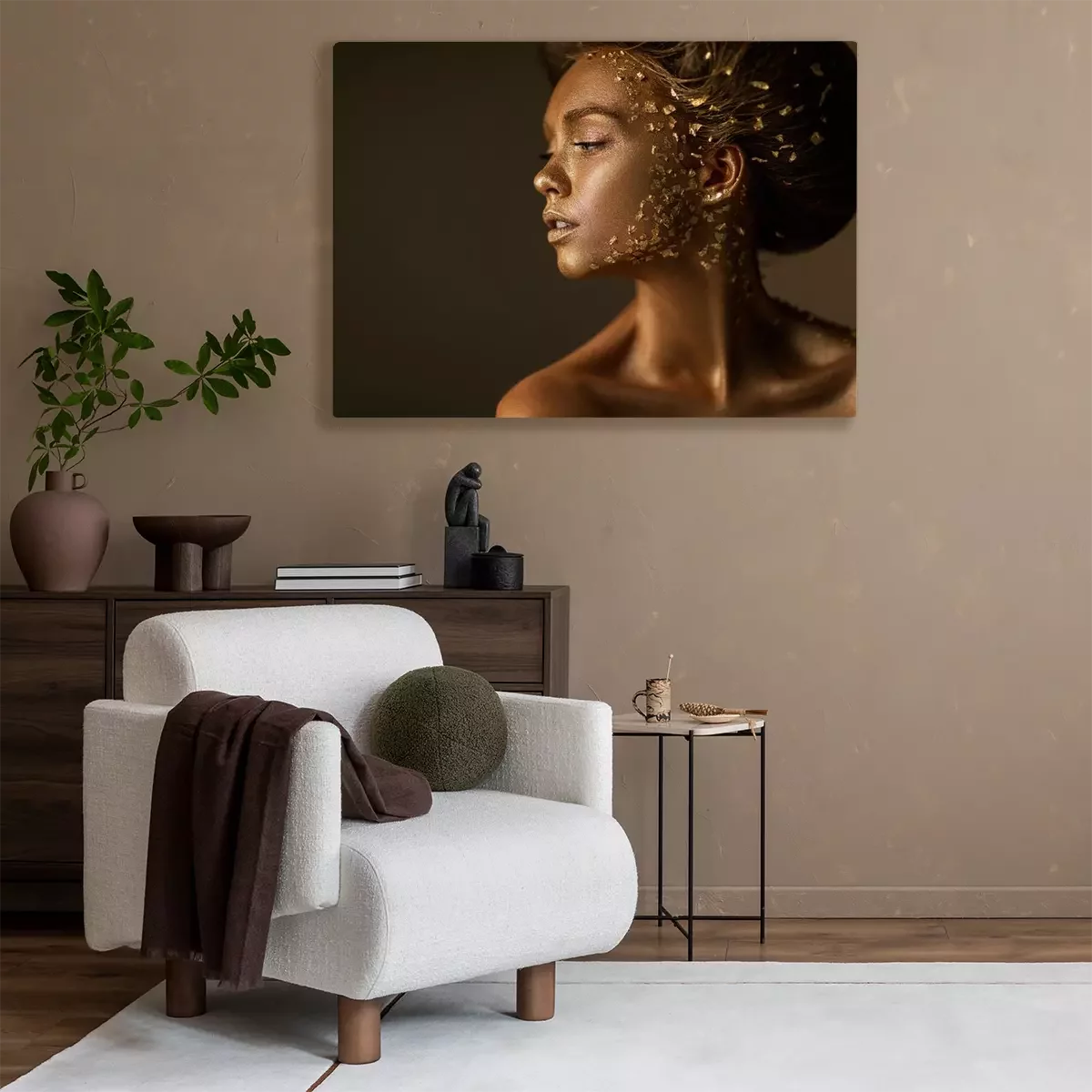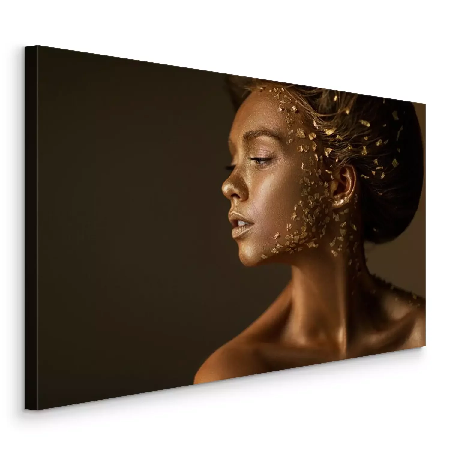 Canvas Fashion art portrait of model girl with holiday golden shiny professional makeup. beaty woman with gold metallic body and hair on dark background. Gold glowing skin. copy space