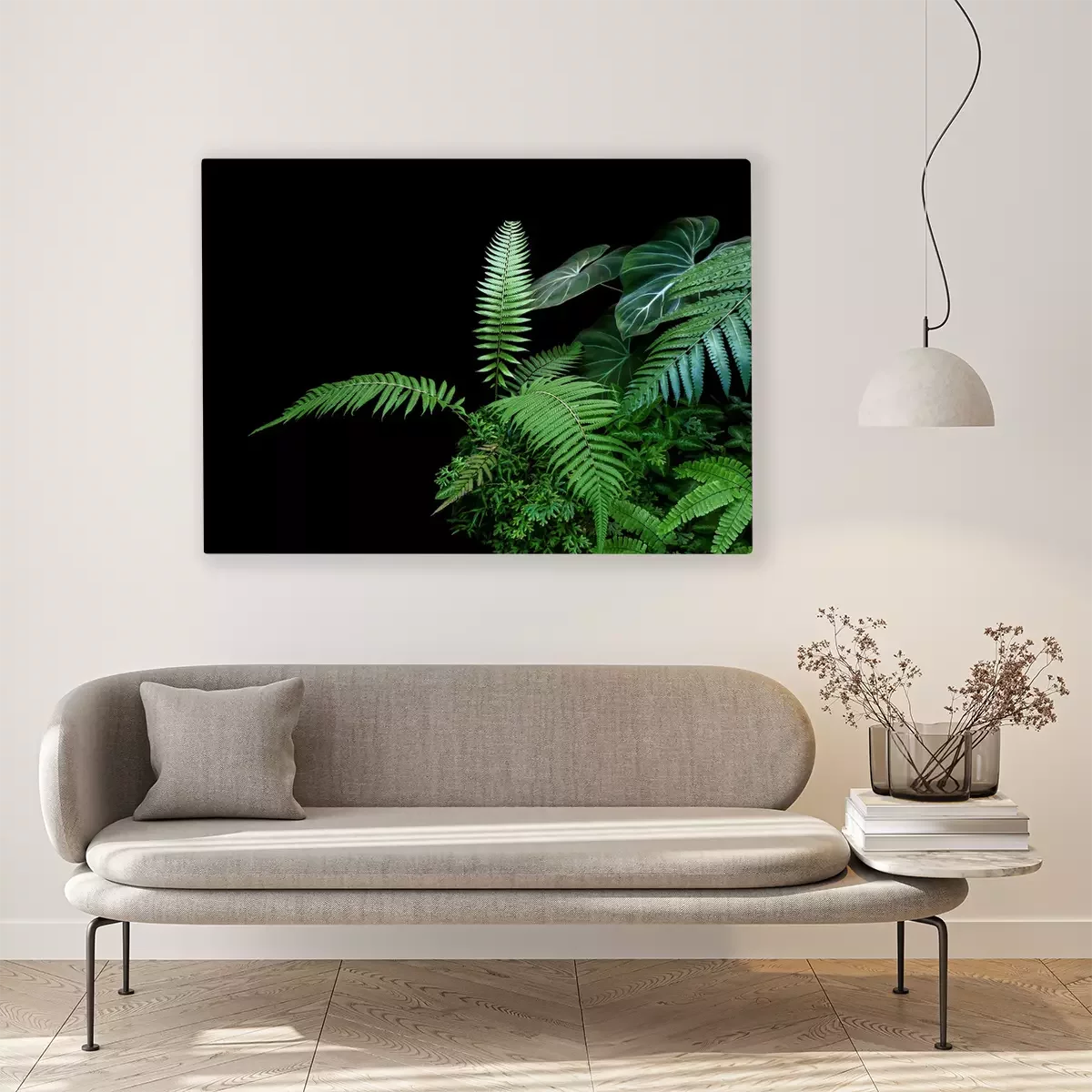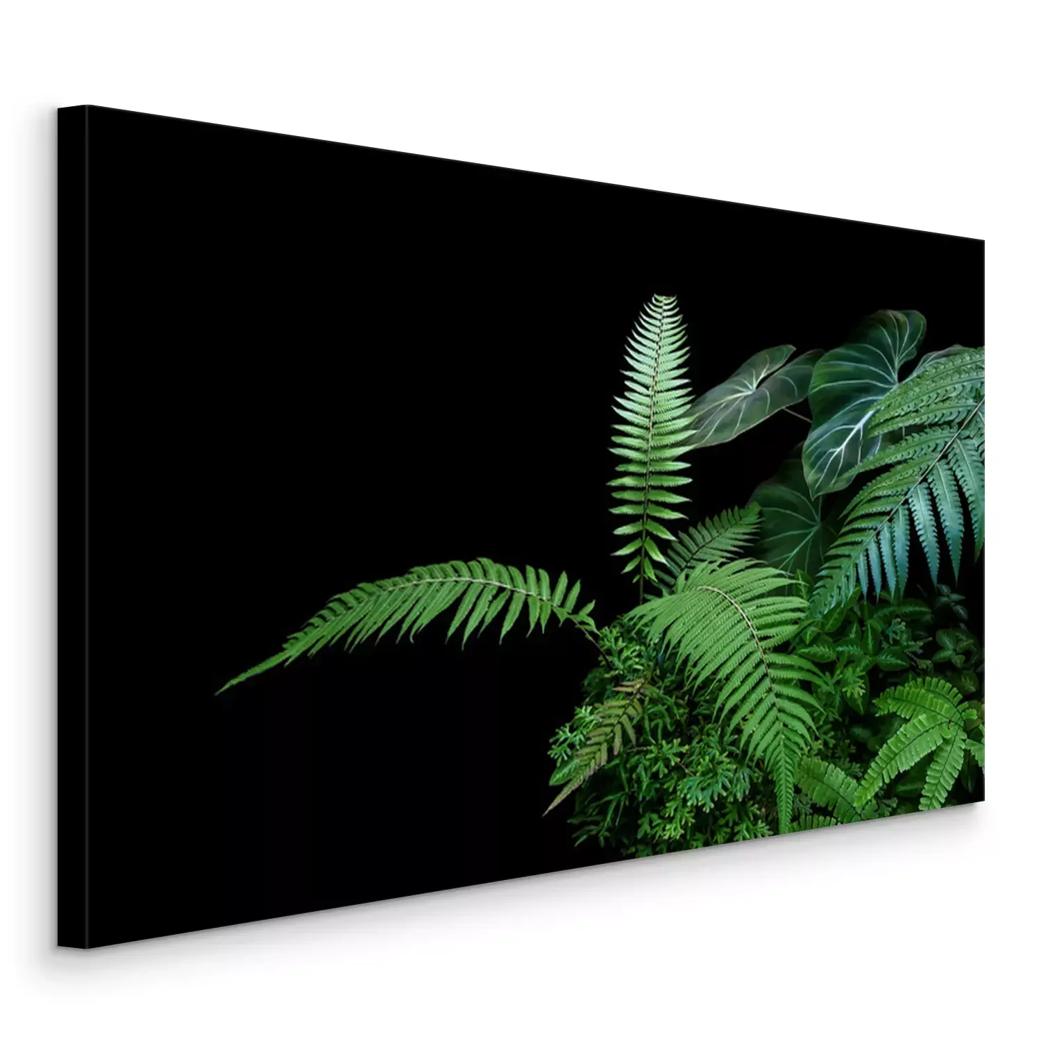 Canvas Fern fronds, philodendron leaves (Philodendron gloriosum) and tropical foliage rainforest plants bush on black background.