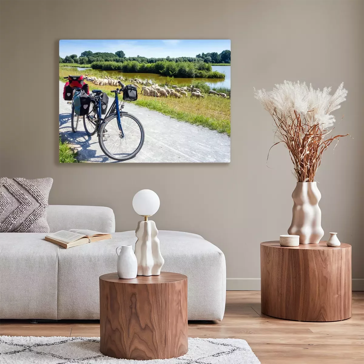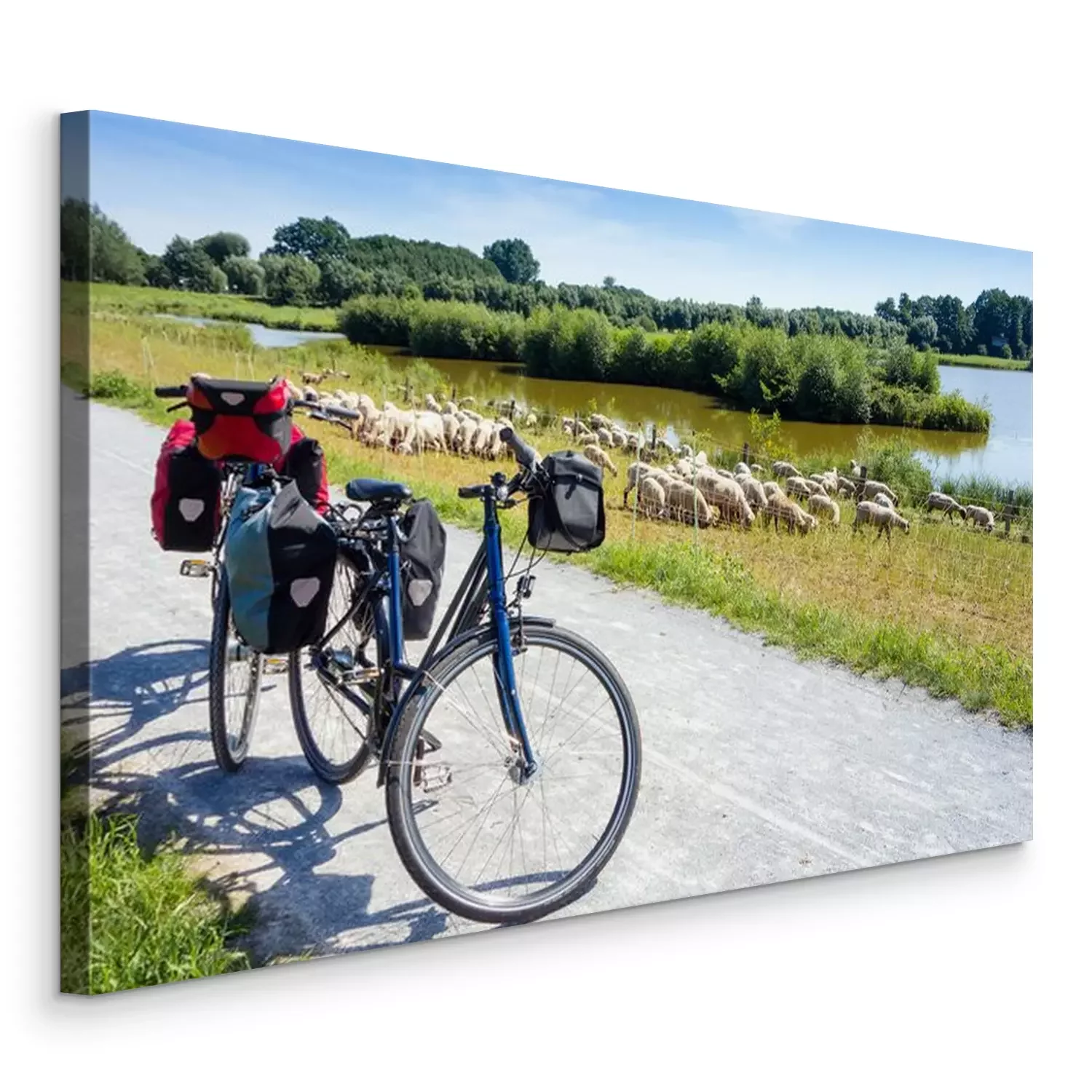 Canvas Fiets met bagage en schapen, EmsRadweg, Steinhorster pool, Duitsland