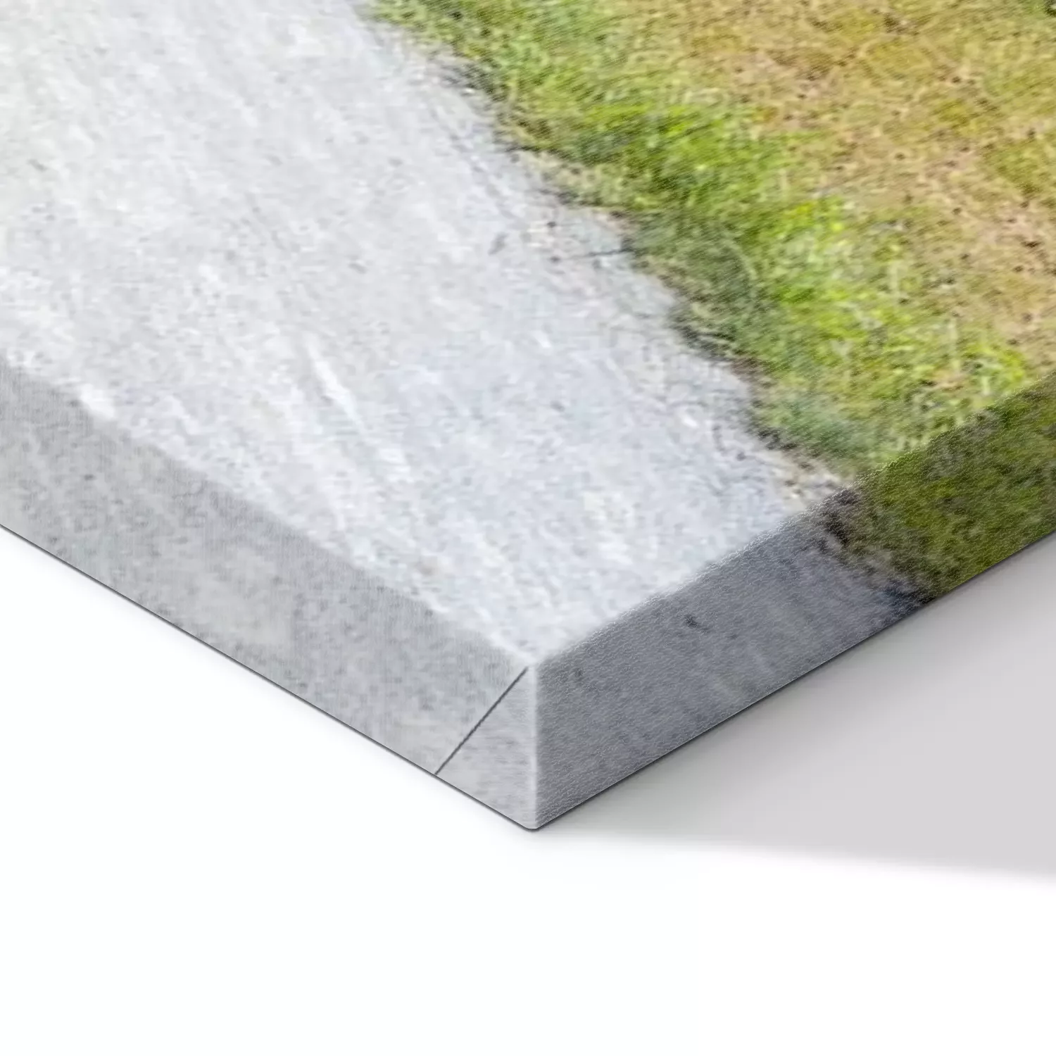 De print wordt aangebracht op hoogwaardig canvas dat op een schildersweefgetouw (spieraam) wordt gespannen. Omdat de print de zijranden bedekt, hoeft het ontwerp niet met een extra kader te worden omlijst. Wij raden ook composities aan die uit meerdere foto's bestaan en zo een coherente compositie vormen.