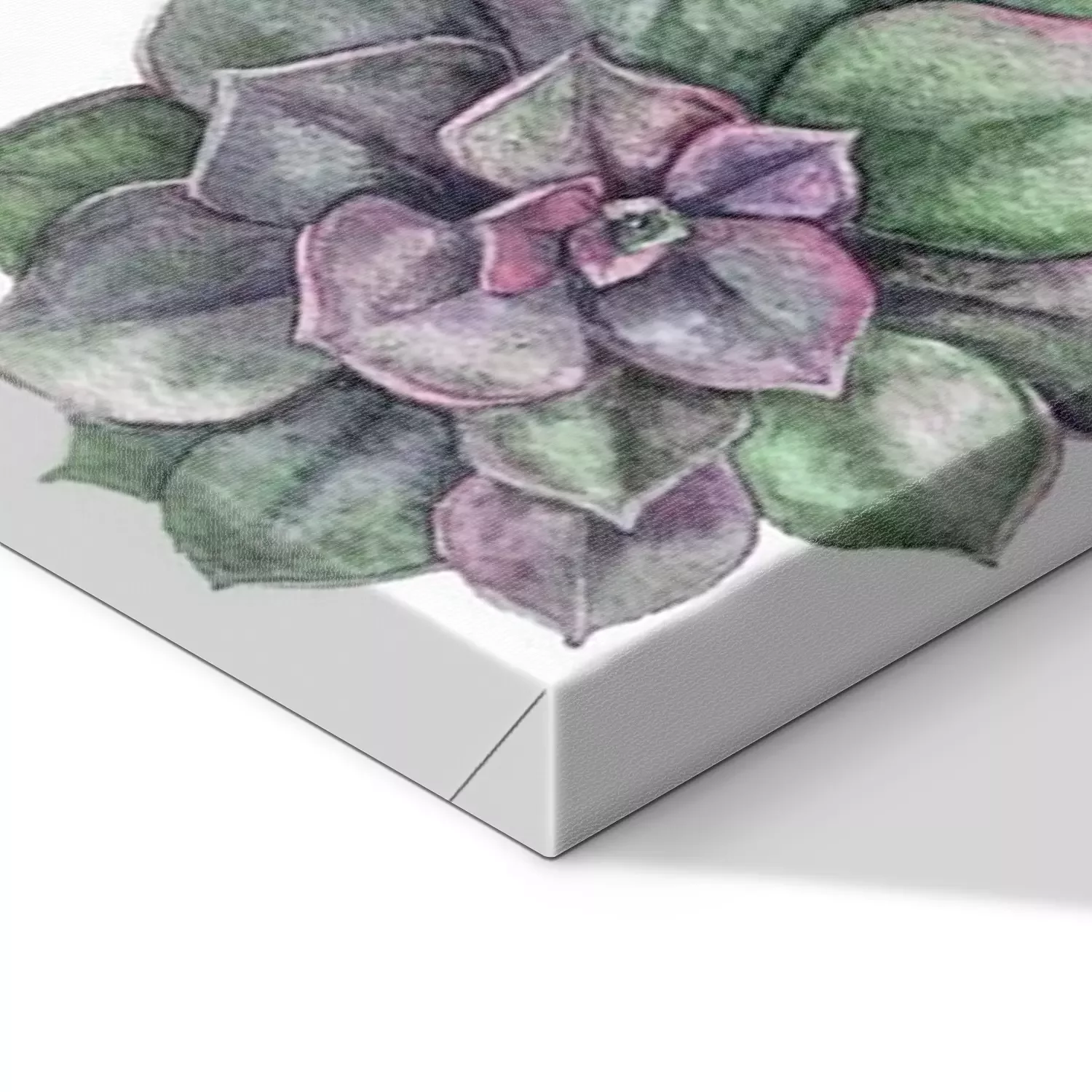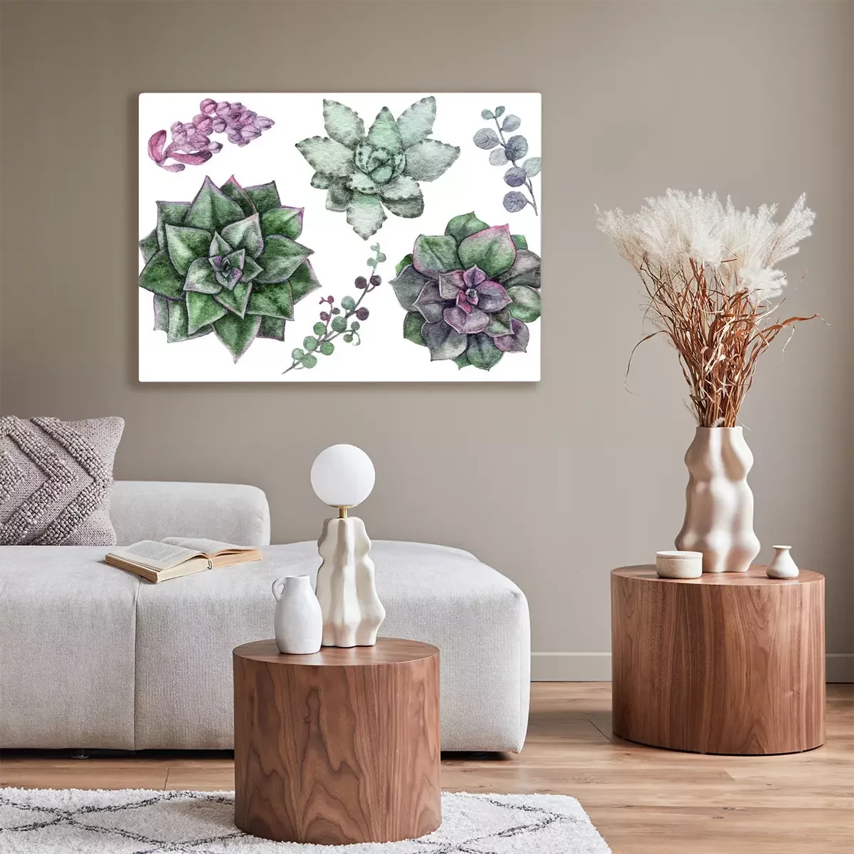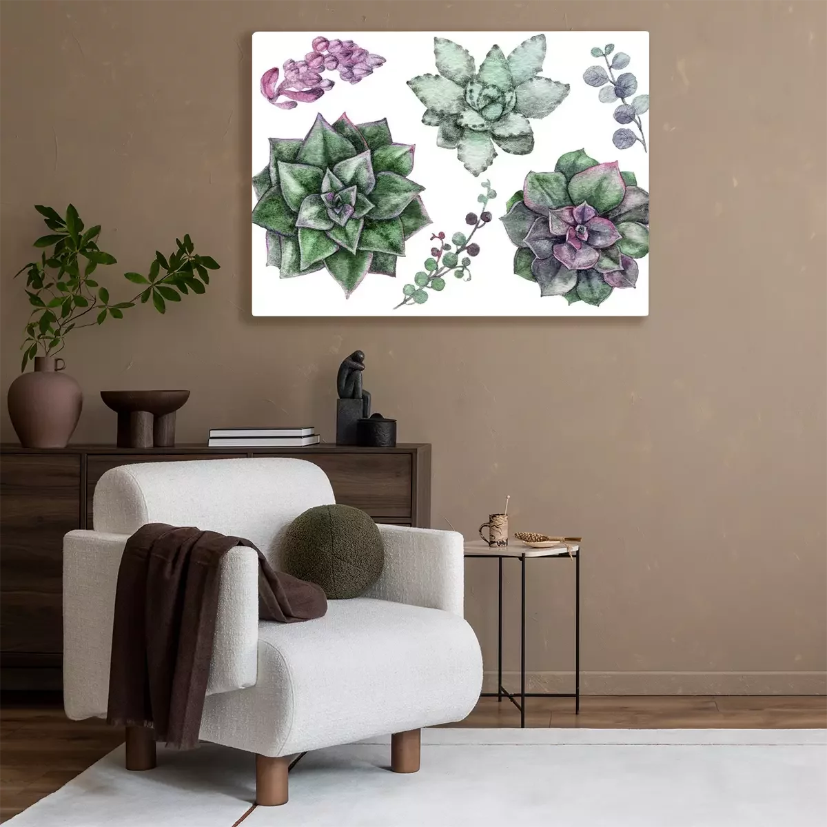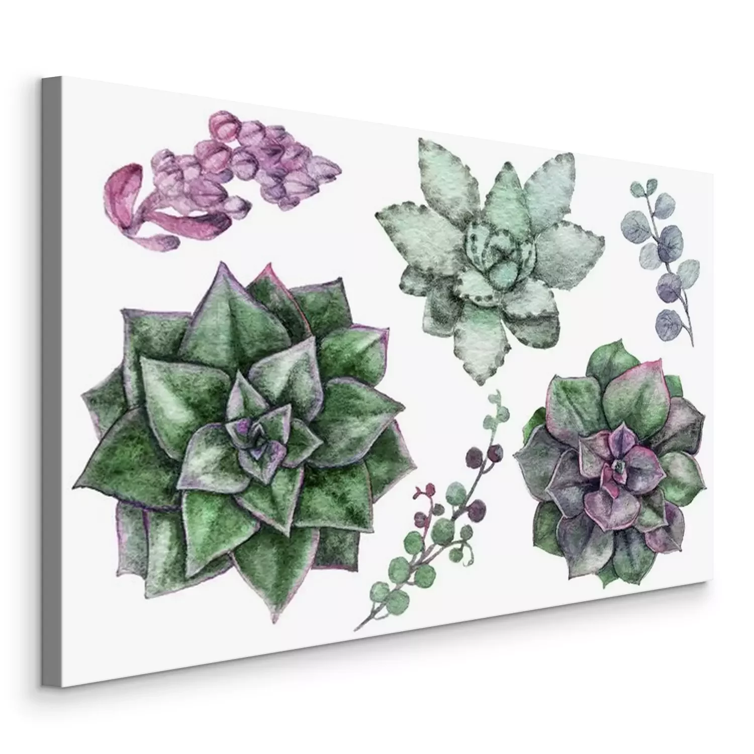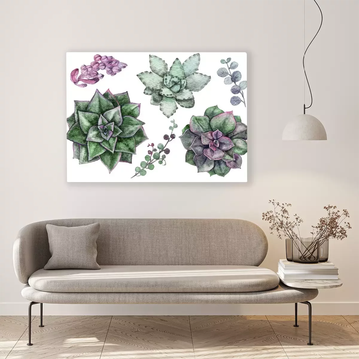Canvas: Fijne parel aquarel vetplanten in een lichte Scandinavische stijl.