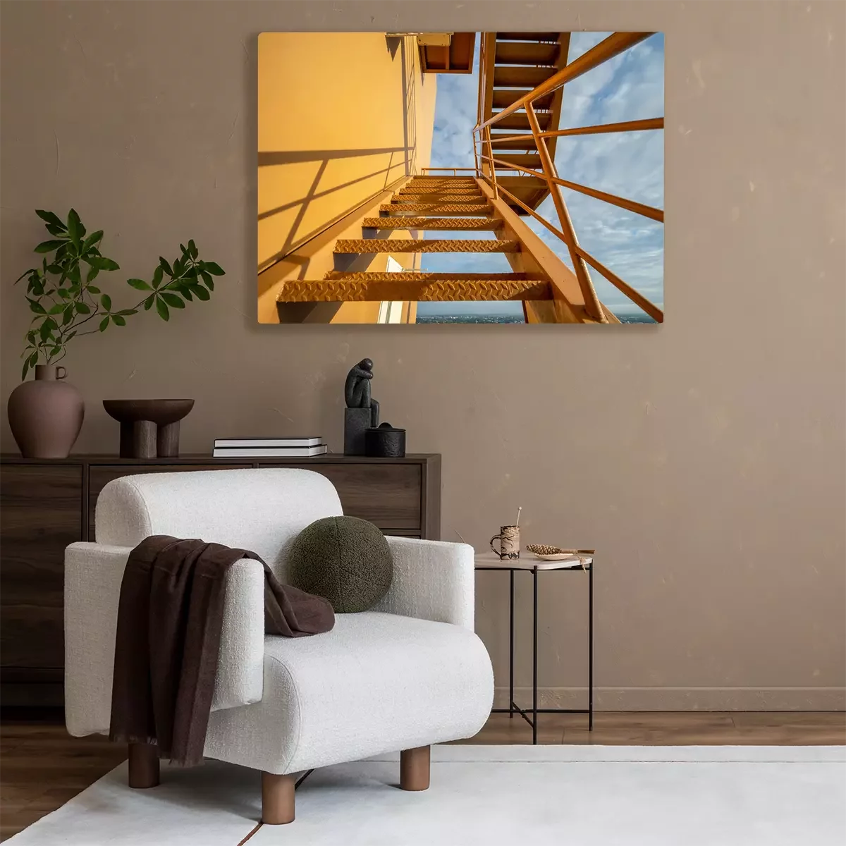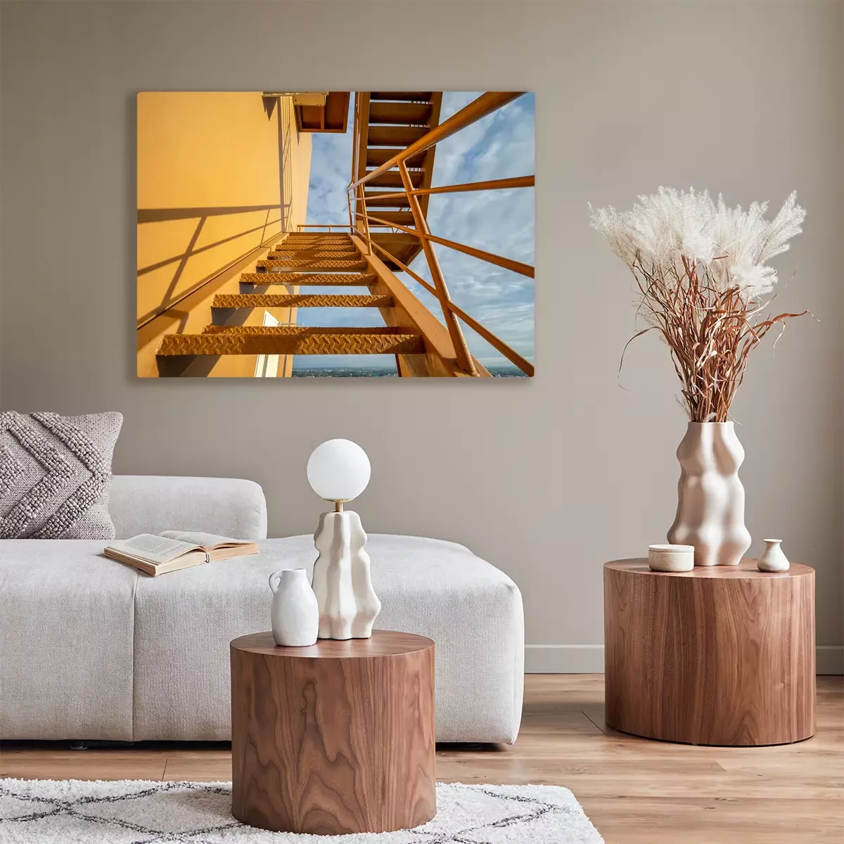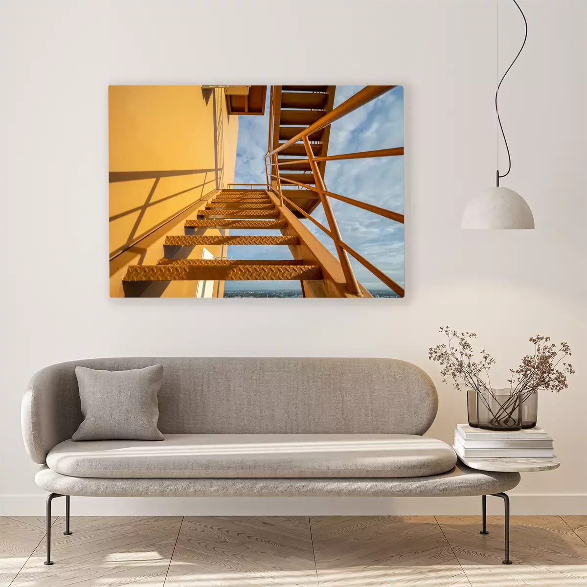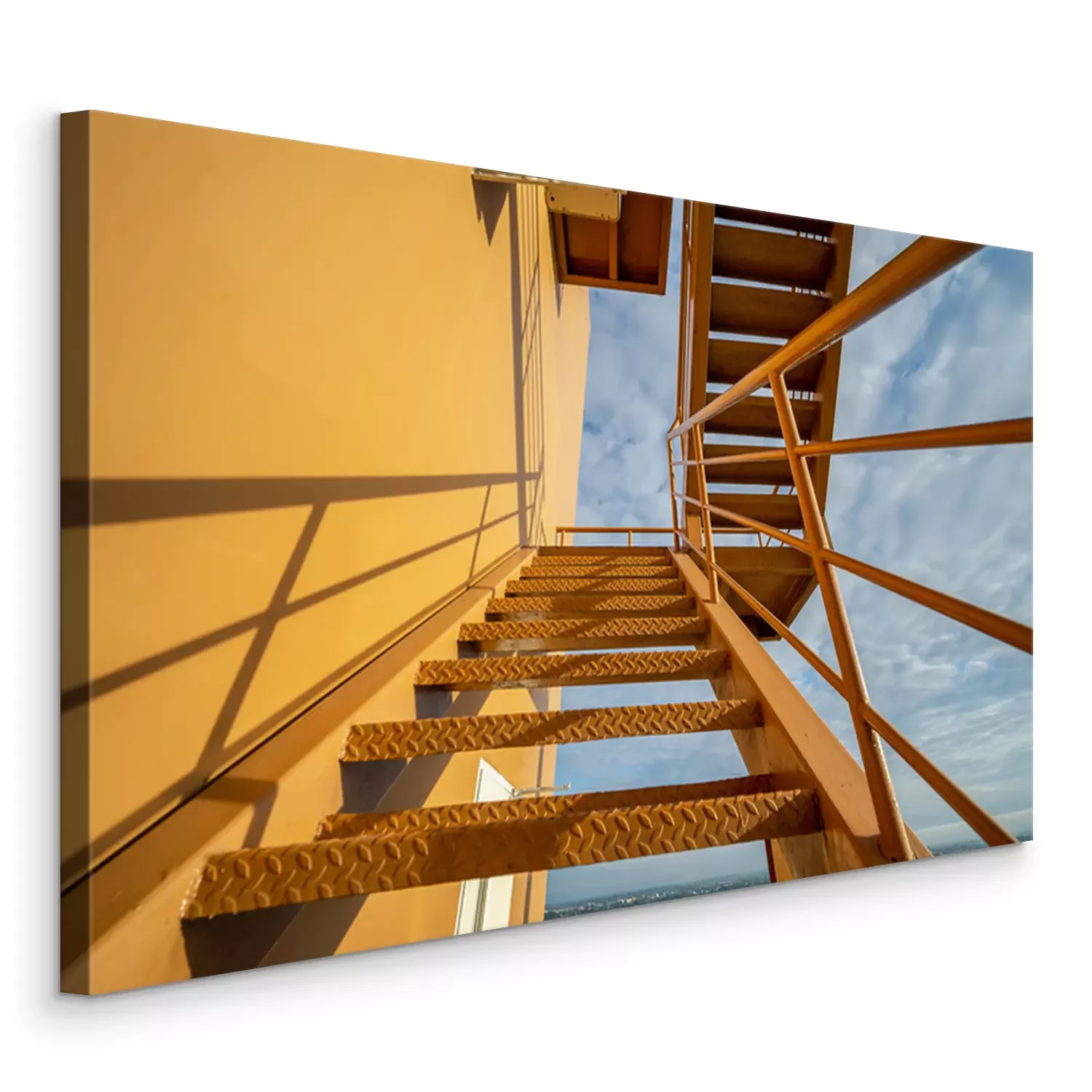Canvas: Fire escape stairs mounted to the outside, Emergency exit with yellow wall..