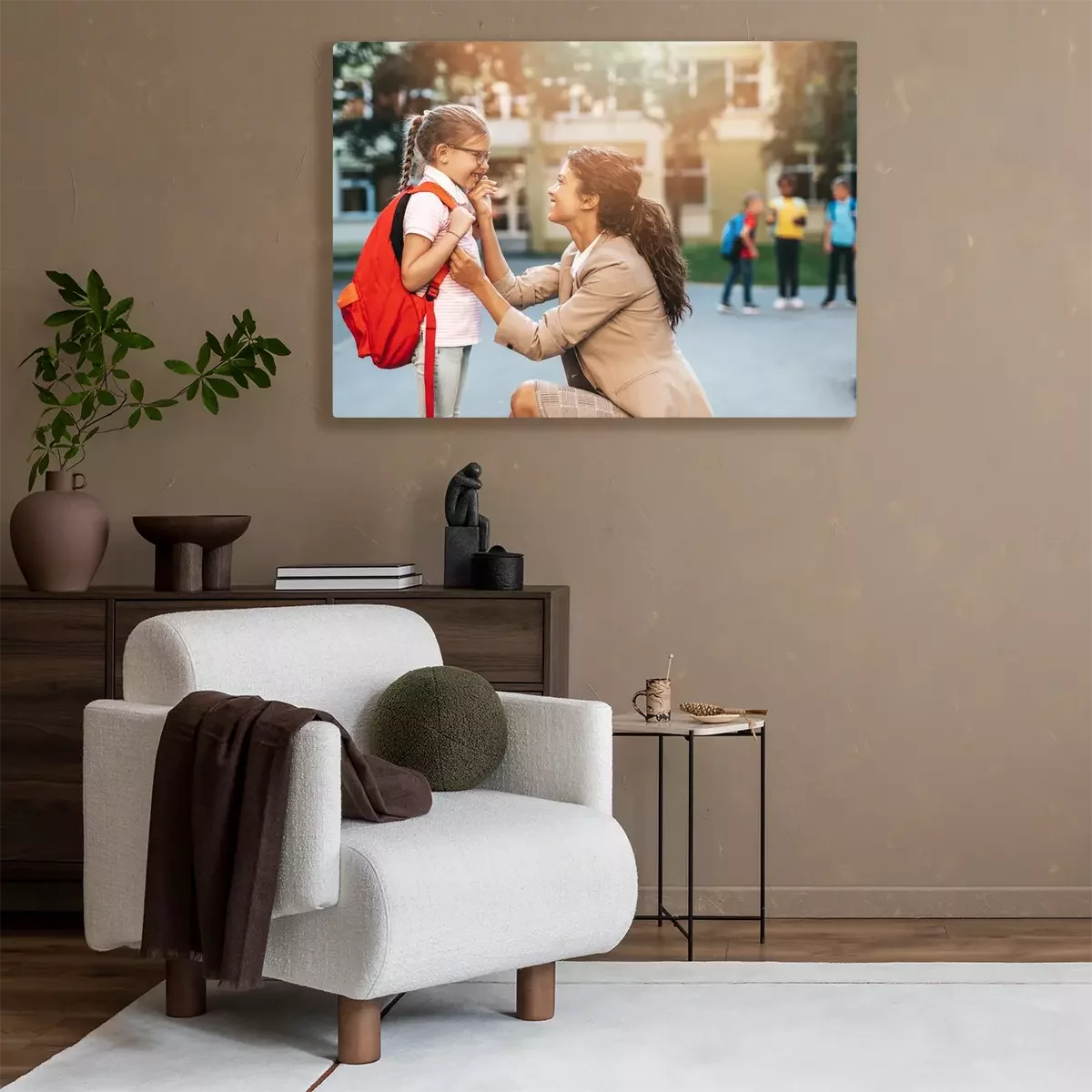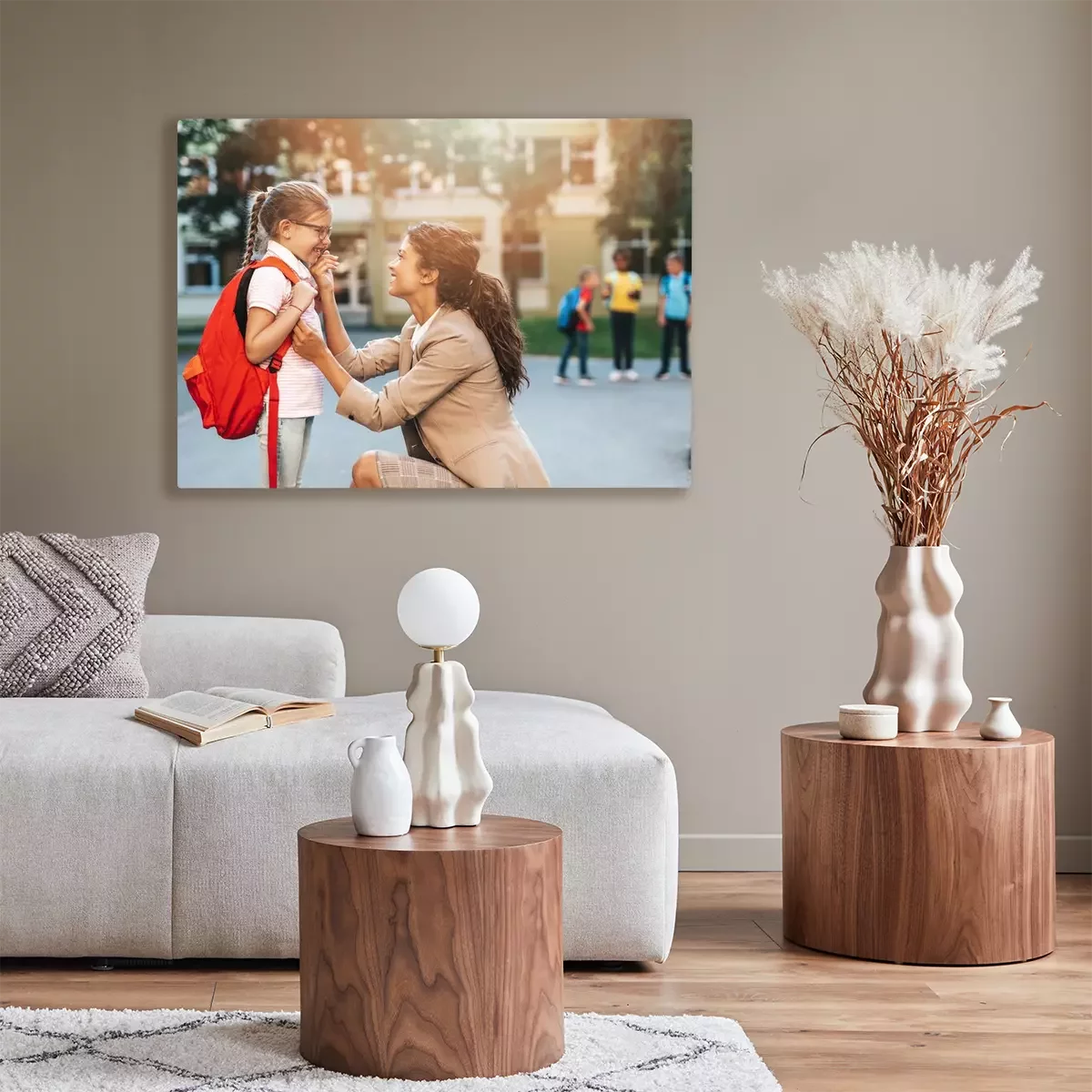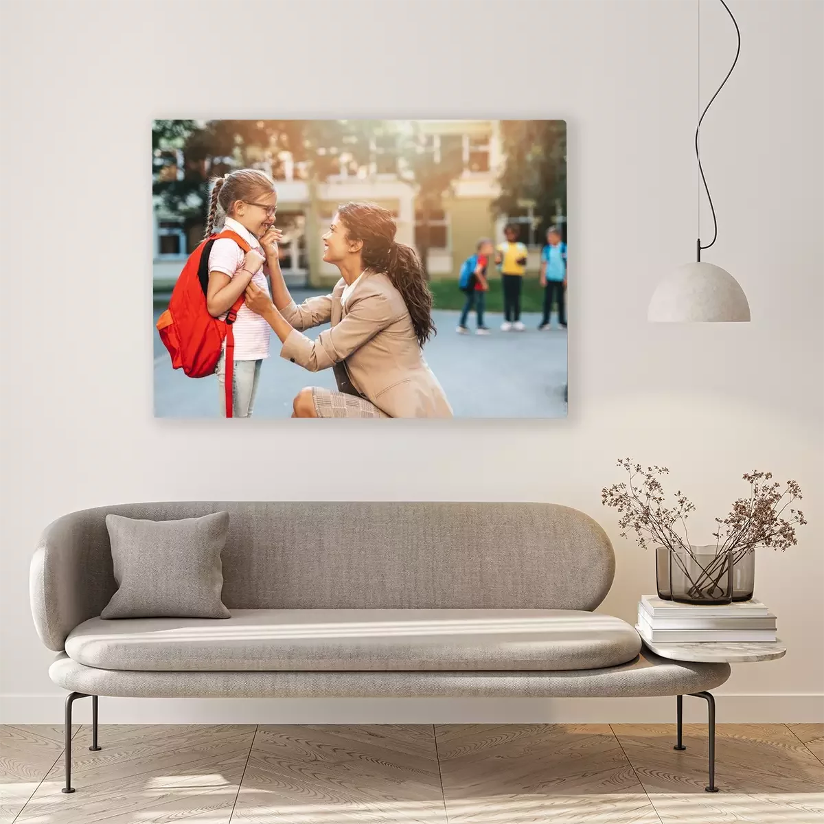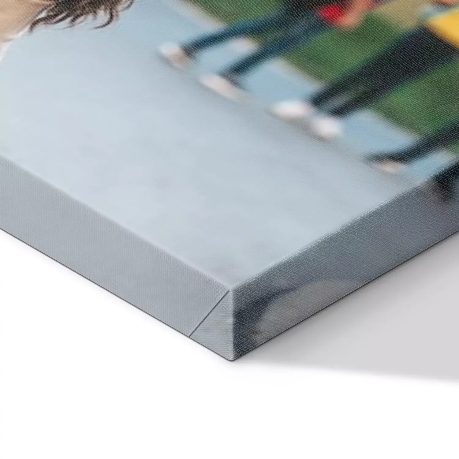 De print wordt aangebracht op hoogwaardig canvas dat op een schildersweefgetouw (spieraam) wordt gespannen. Omdat de print de zijranden bedekt, hoeft het ontwerp niet met een extra kader te worden omlijst. Wij raden ook composities aan die uit meerdere foto's bestaan en zo een coherente compositie vormen.