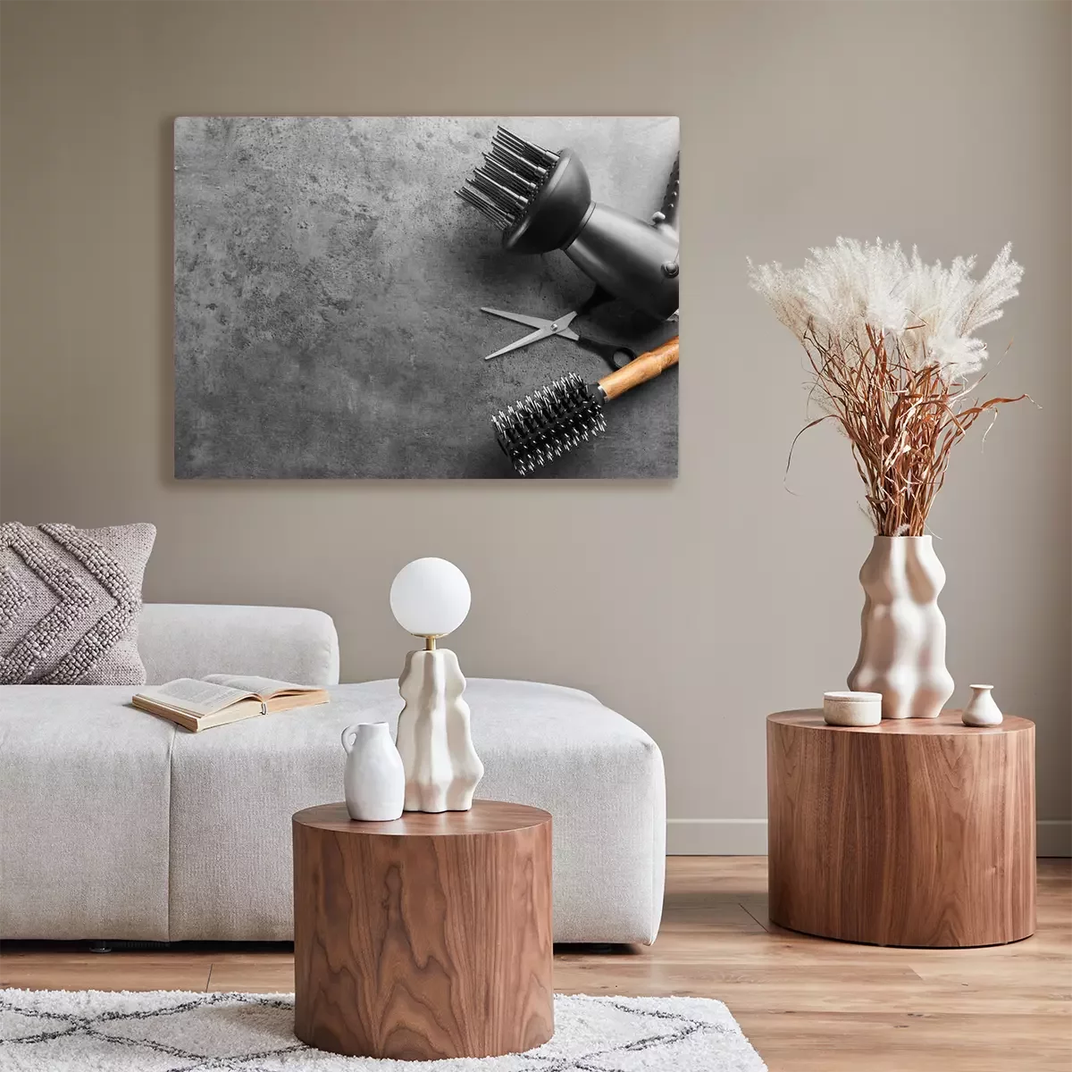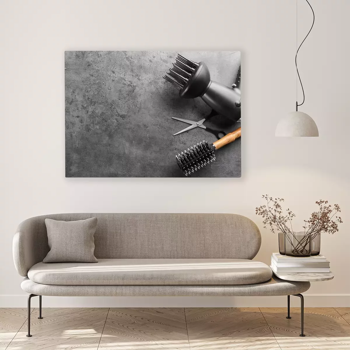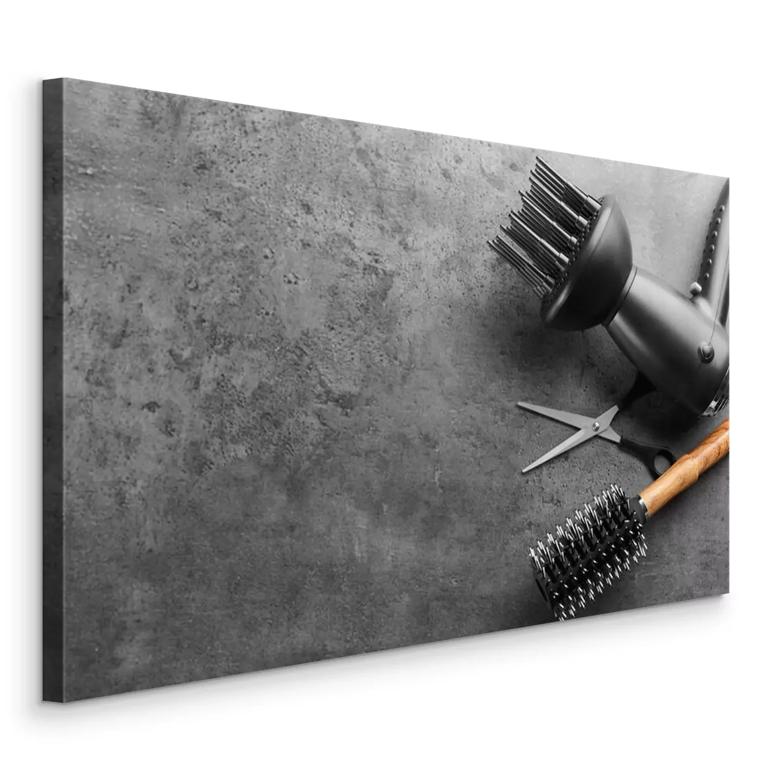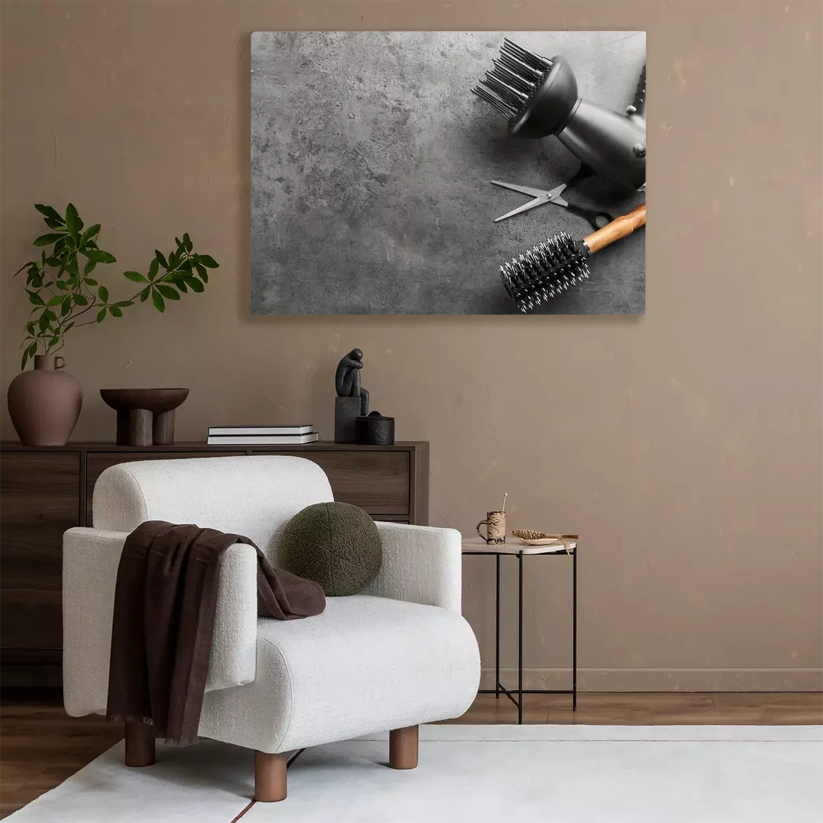 Canvas: Flat lay composition with set of hairdresser's tools on grey background