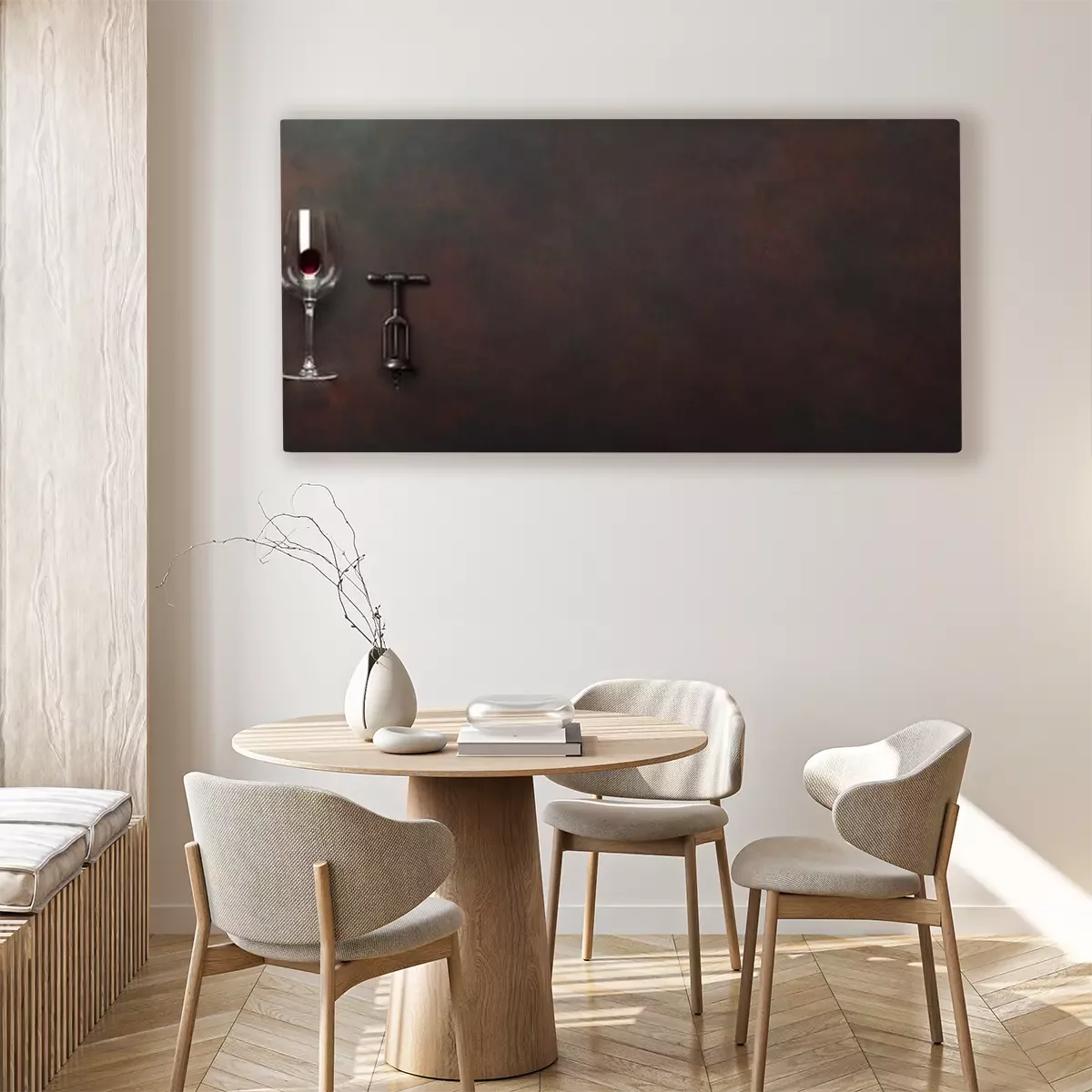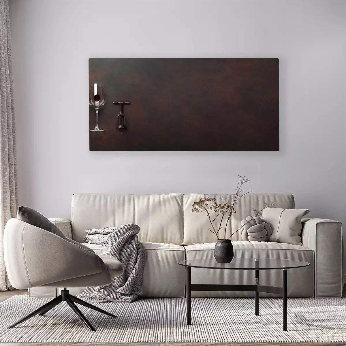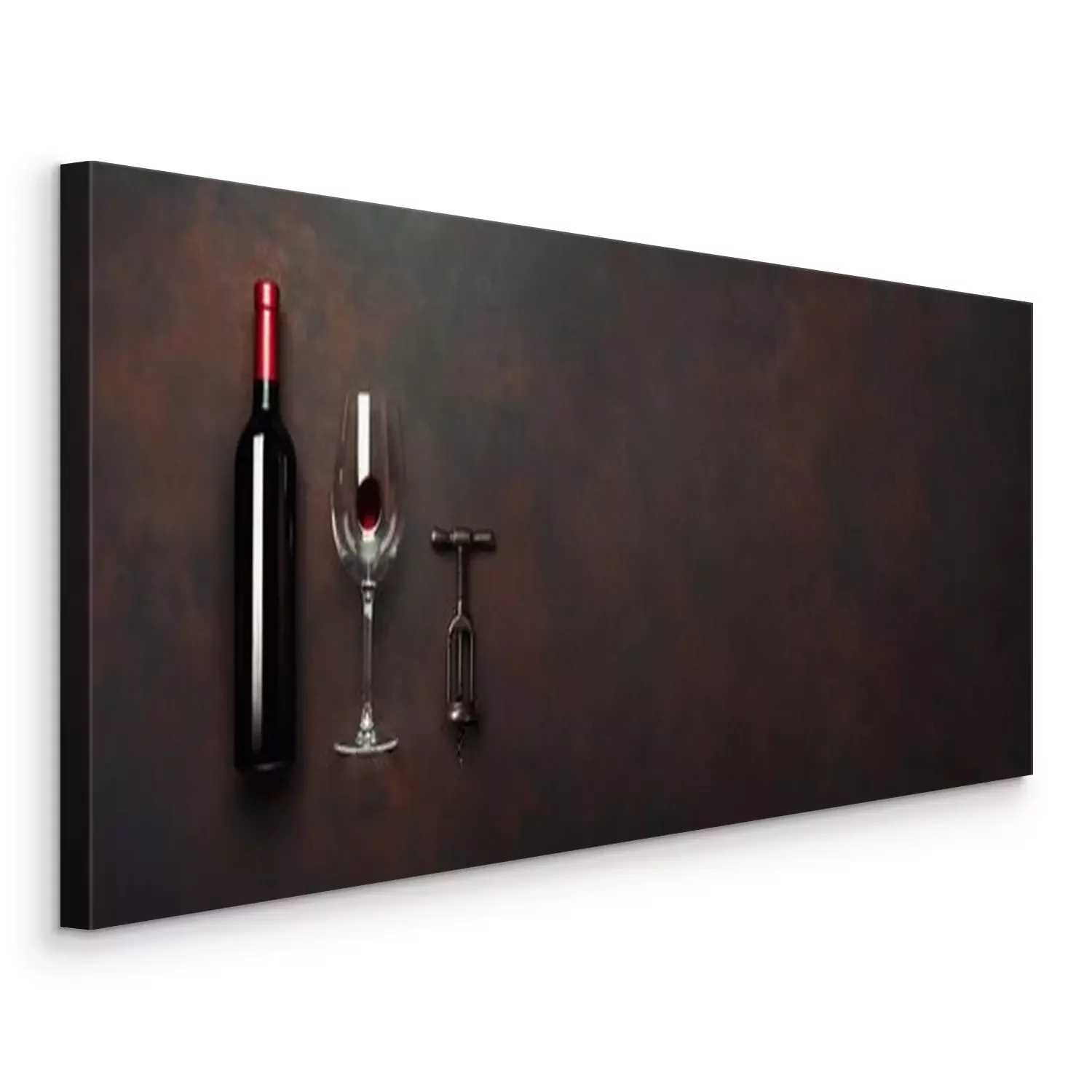 Canvas: Fles wijn met wijnglas en kurketrekker op roestige bruine achtergrond. Panoramisch bovenaanzicht met ruimte voor uw tekst