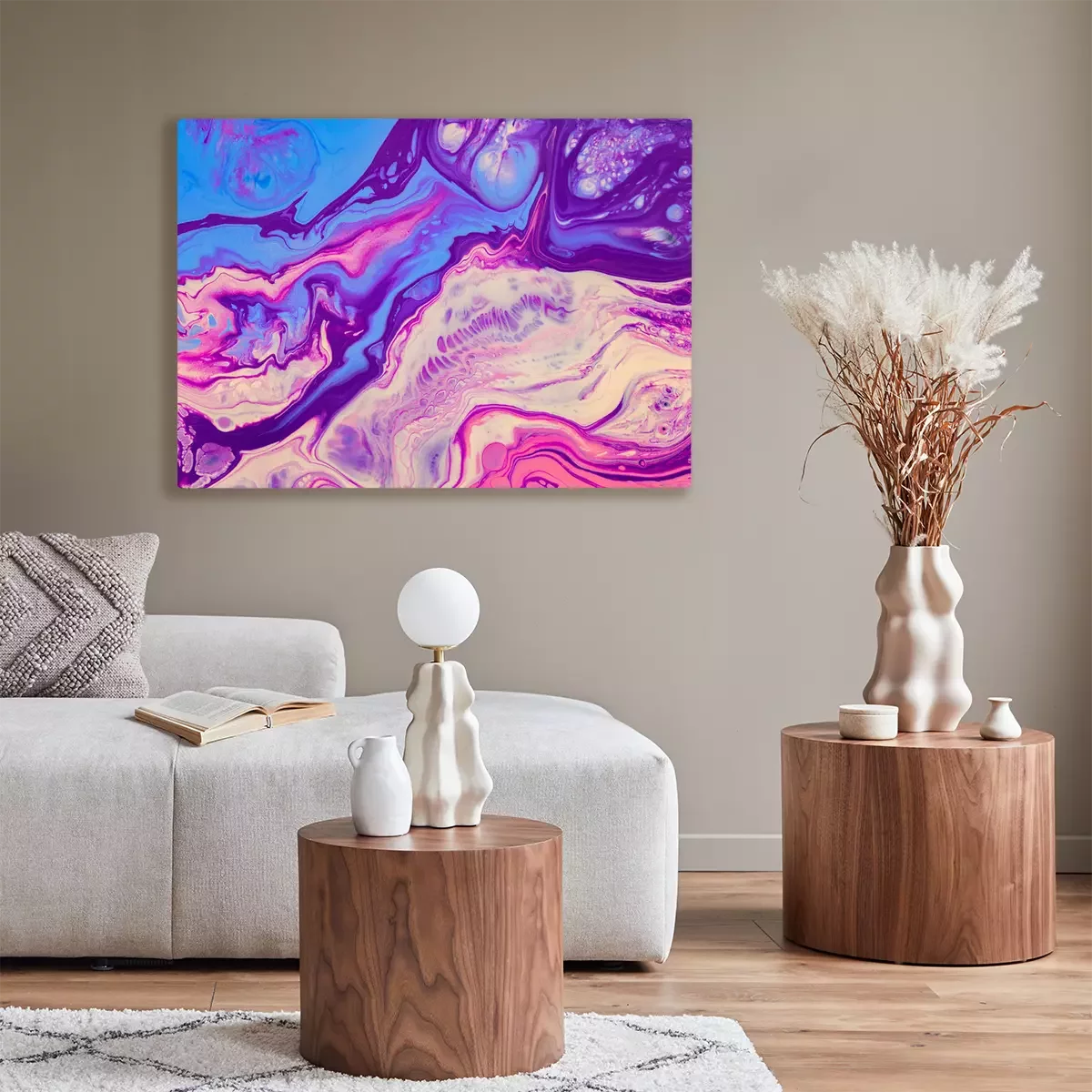 Canvas: Fluid art texture. Abstract backdrop with iridescent paint effect. Liquid acrylic artwork with flows and splashes. Mixed paints for website background. Purple, pink, blue and white overflowing colors