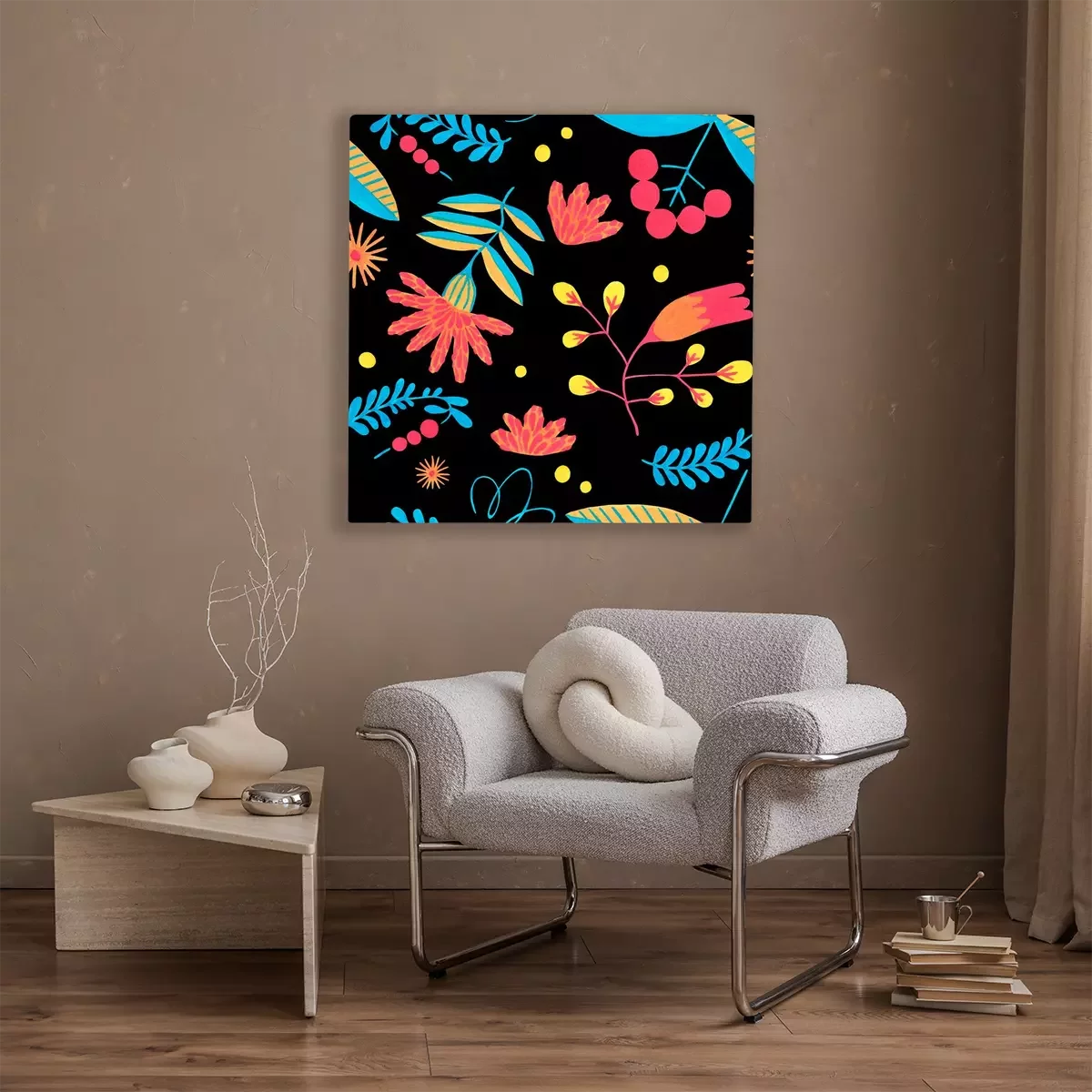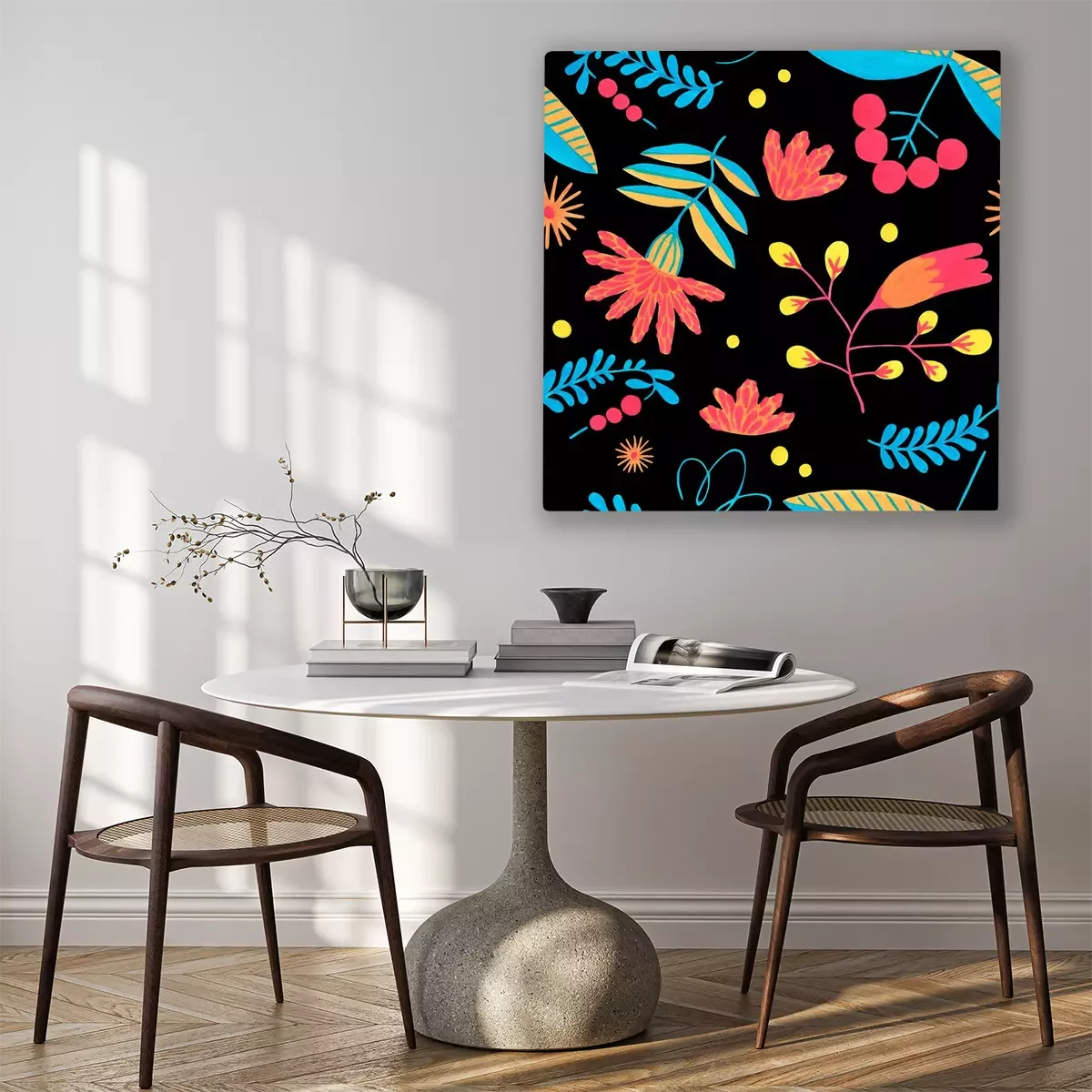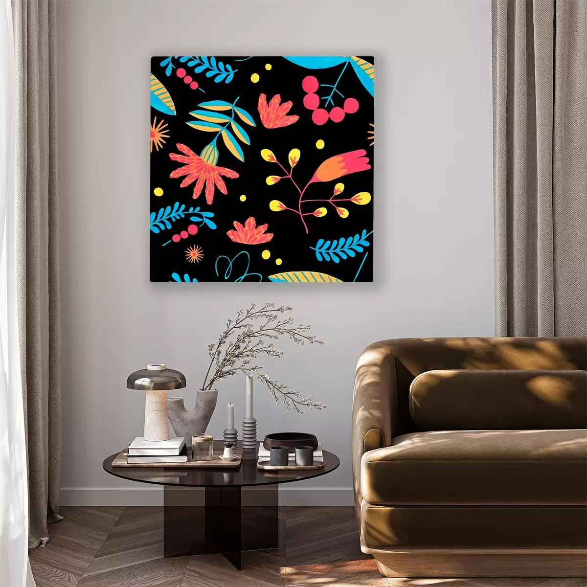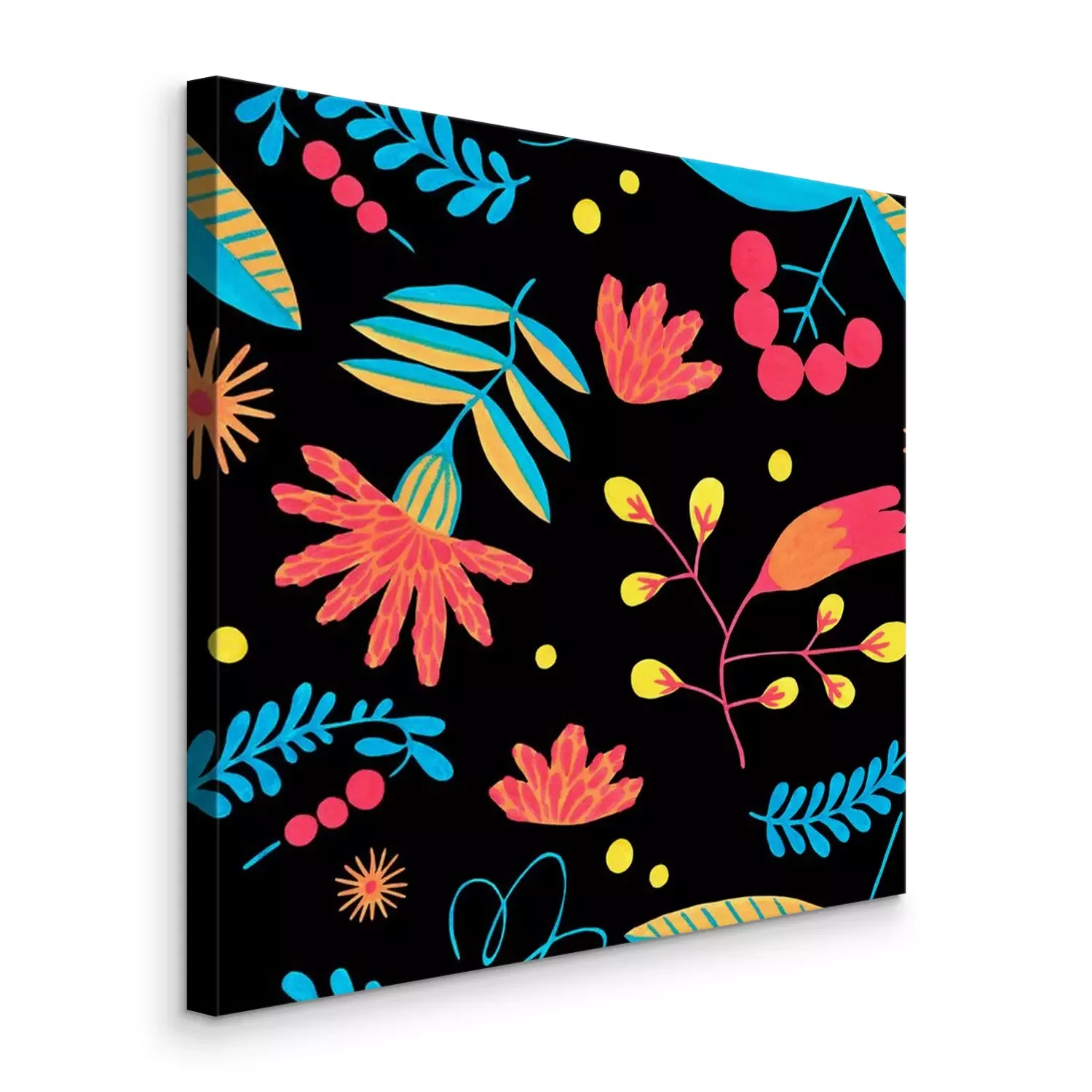 Canvas: Folk seamless pattern in minimal floral style with gouache flower elements on black background. Bright herbal pattern for scrapbooking, wrapping paper, textile, fabric or ditsy print.