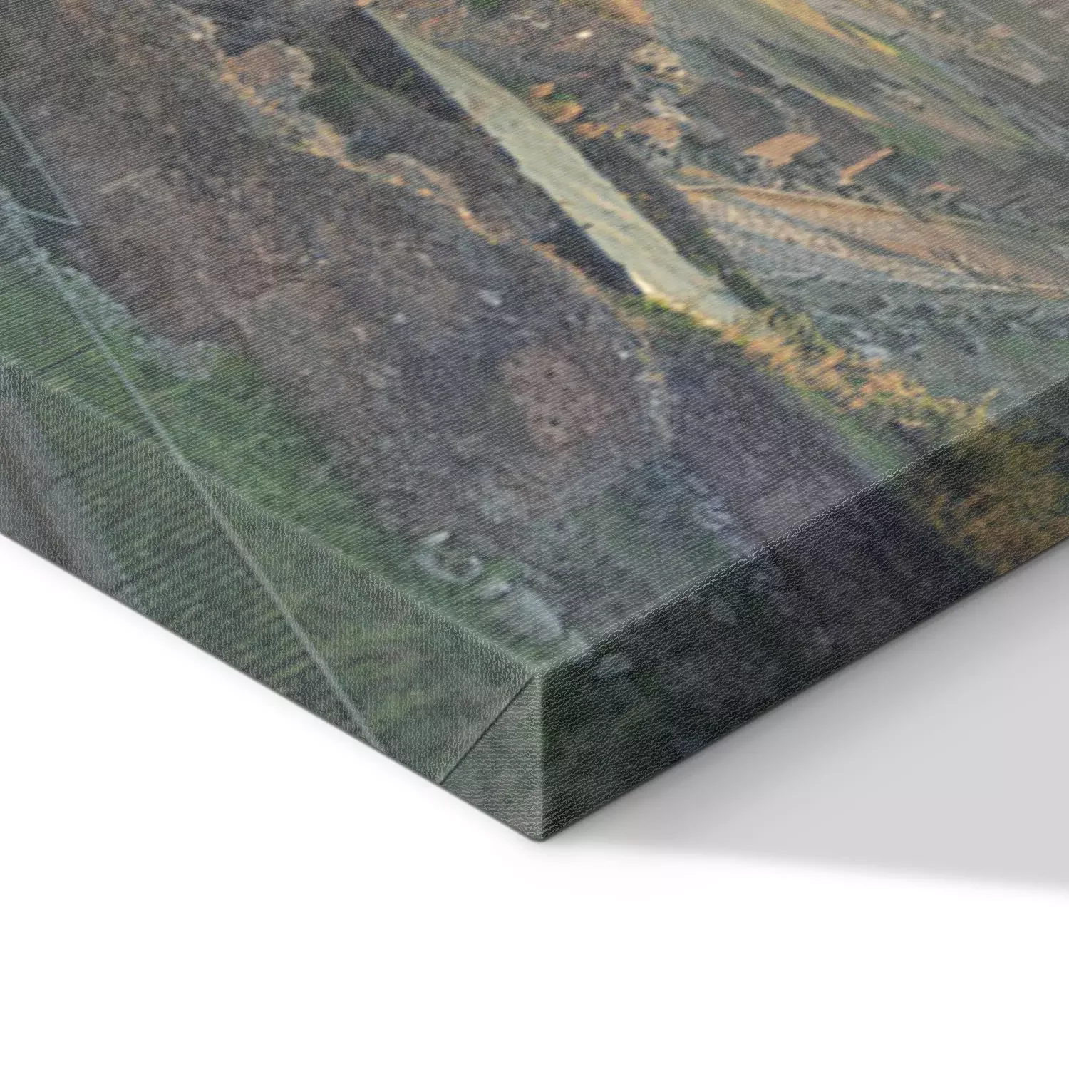 De print wordt aangebracht op hoogwaardig canvas dat op een schildersweefgetouw (spieraam) wordt gespannen. Omdat de print de zijranden bedekt, hoeft het ontwerp niet met een extra kader te worden omlijst. Wij raden ook composities aan die uit meerdere foto's bestaan en zo een coherente compositie vormen.