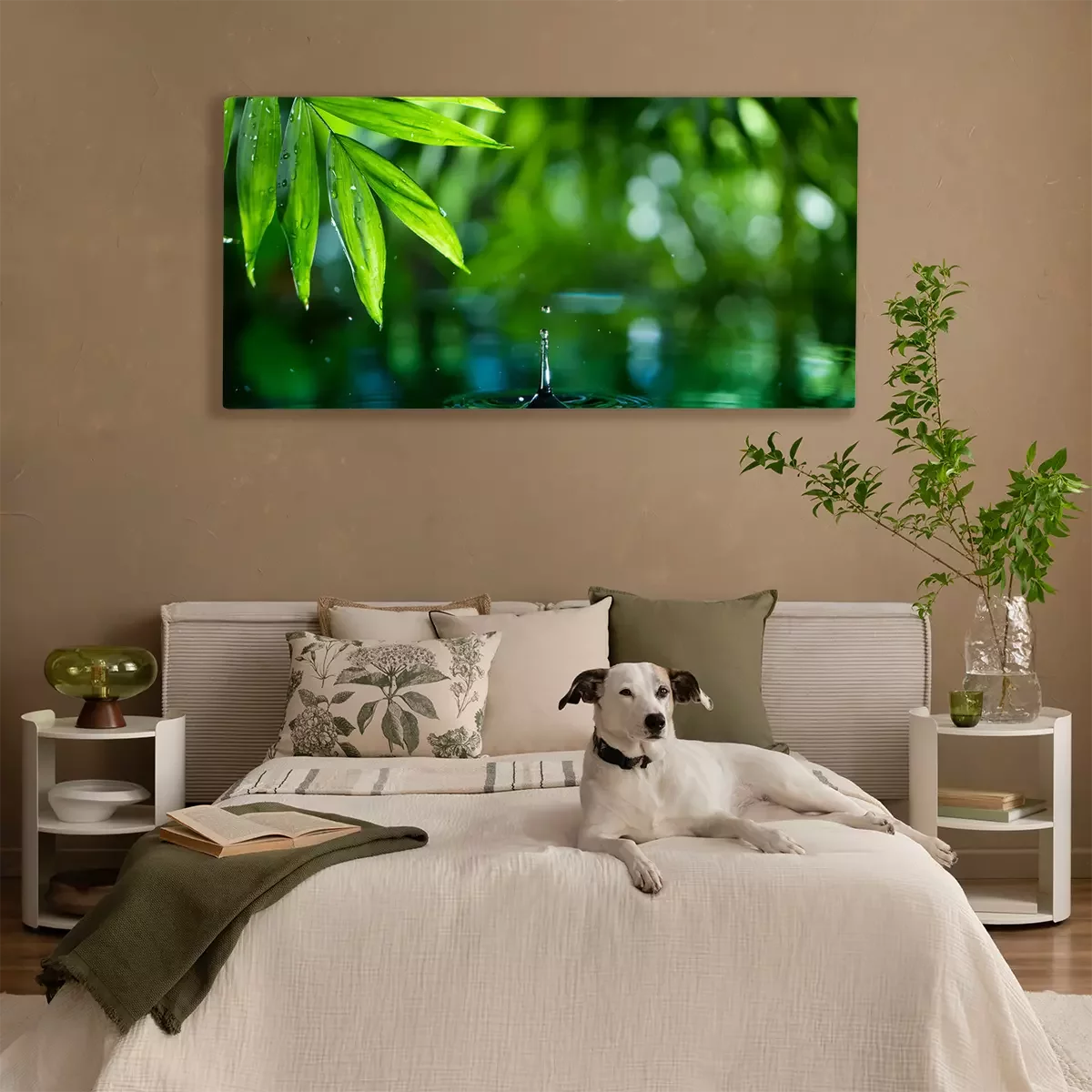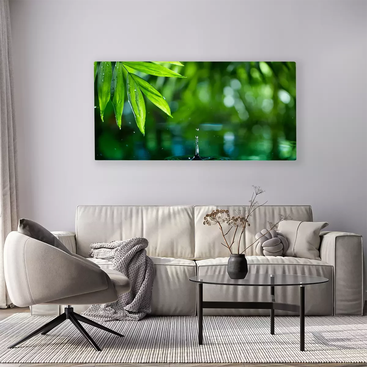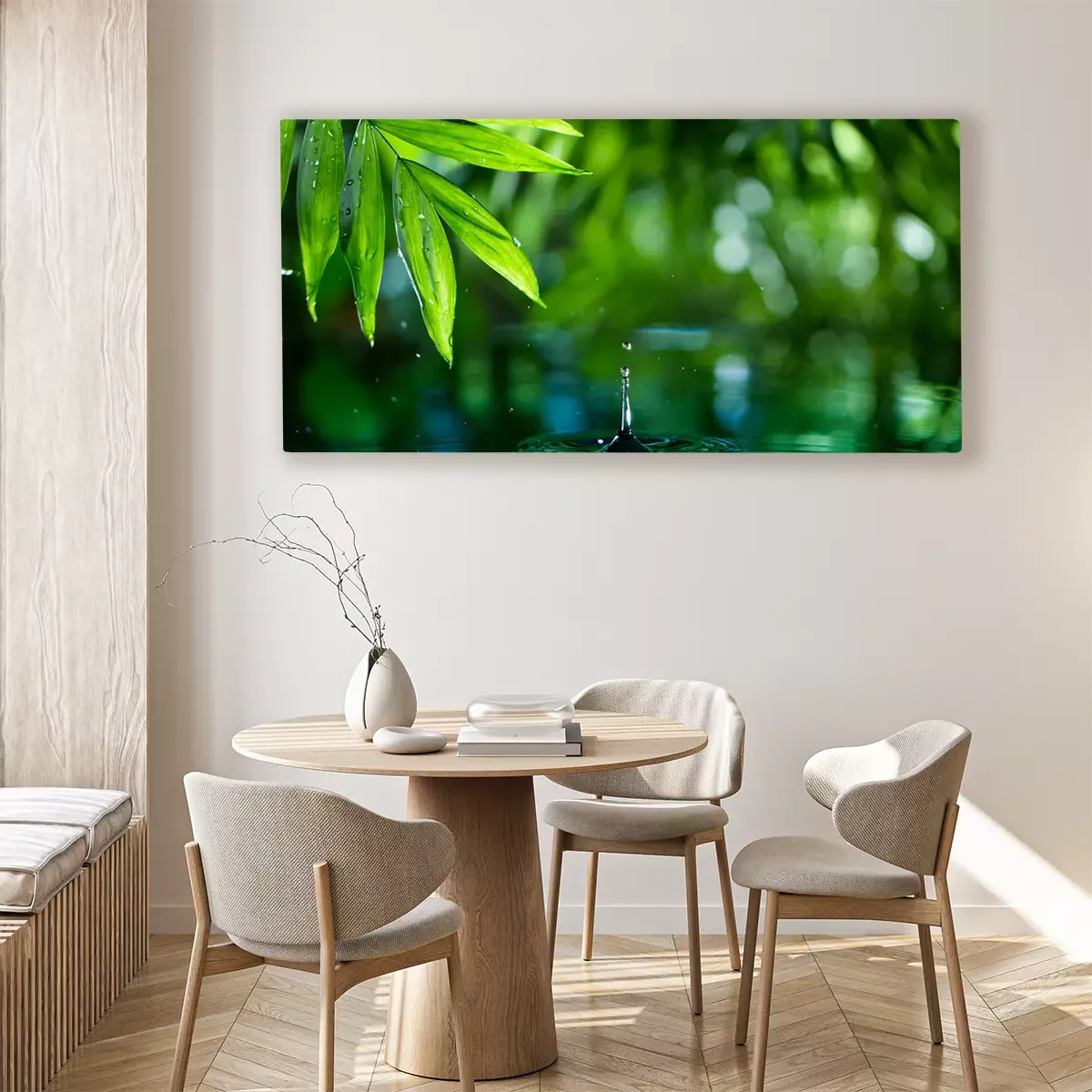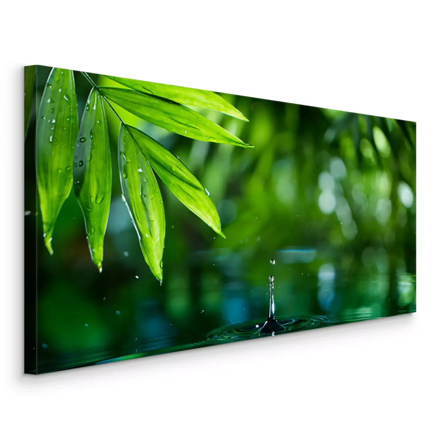 Canvas: fresh green leaves with water drops over the water , relaxation with water ripple drops concept