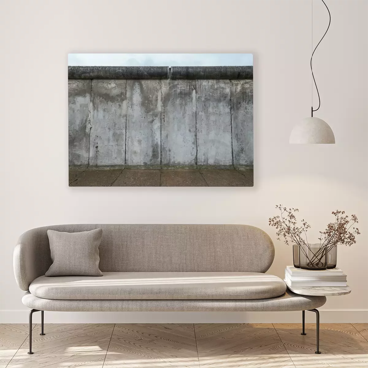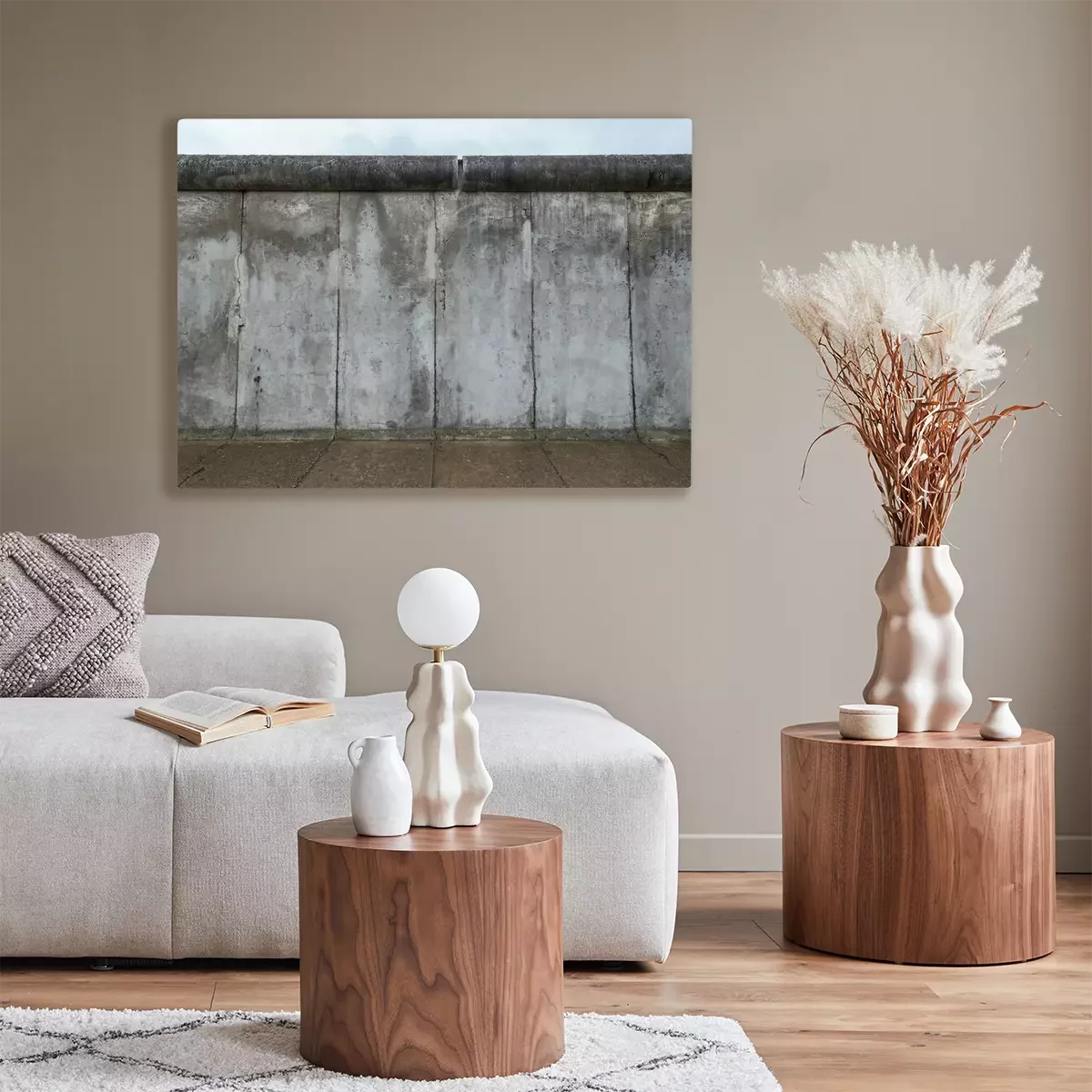 Canvas: Front view of a section of the original Berlin Wall at the Berlin Wall Memorial (Berliner Mauer) in Berlin, Germany, on a cloudy day.