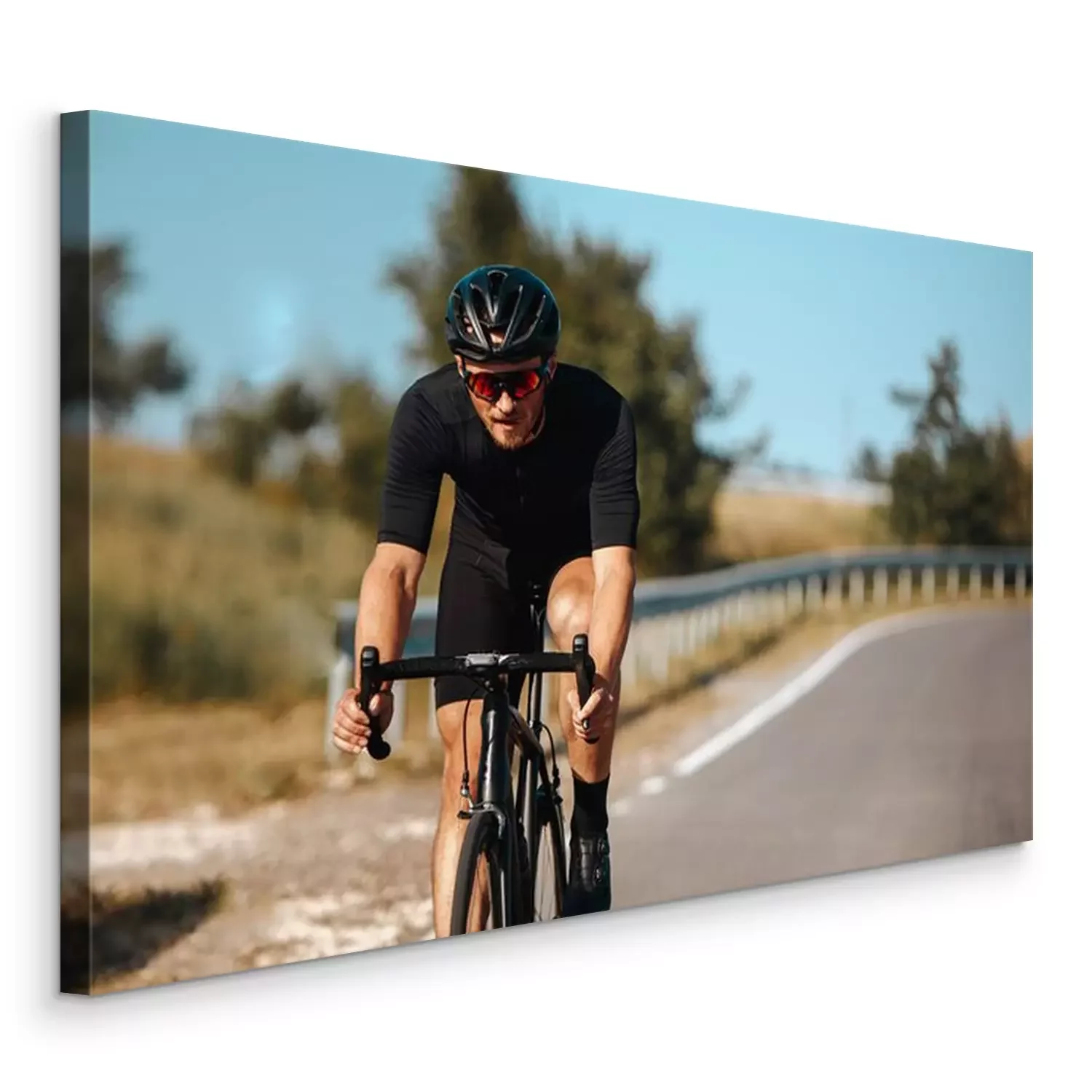 Canvas Front view of professional cyclist in sport outfit practising in cycling with blur background of green nature. Concept of summer activity and healthy lifestyle