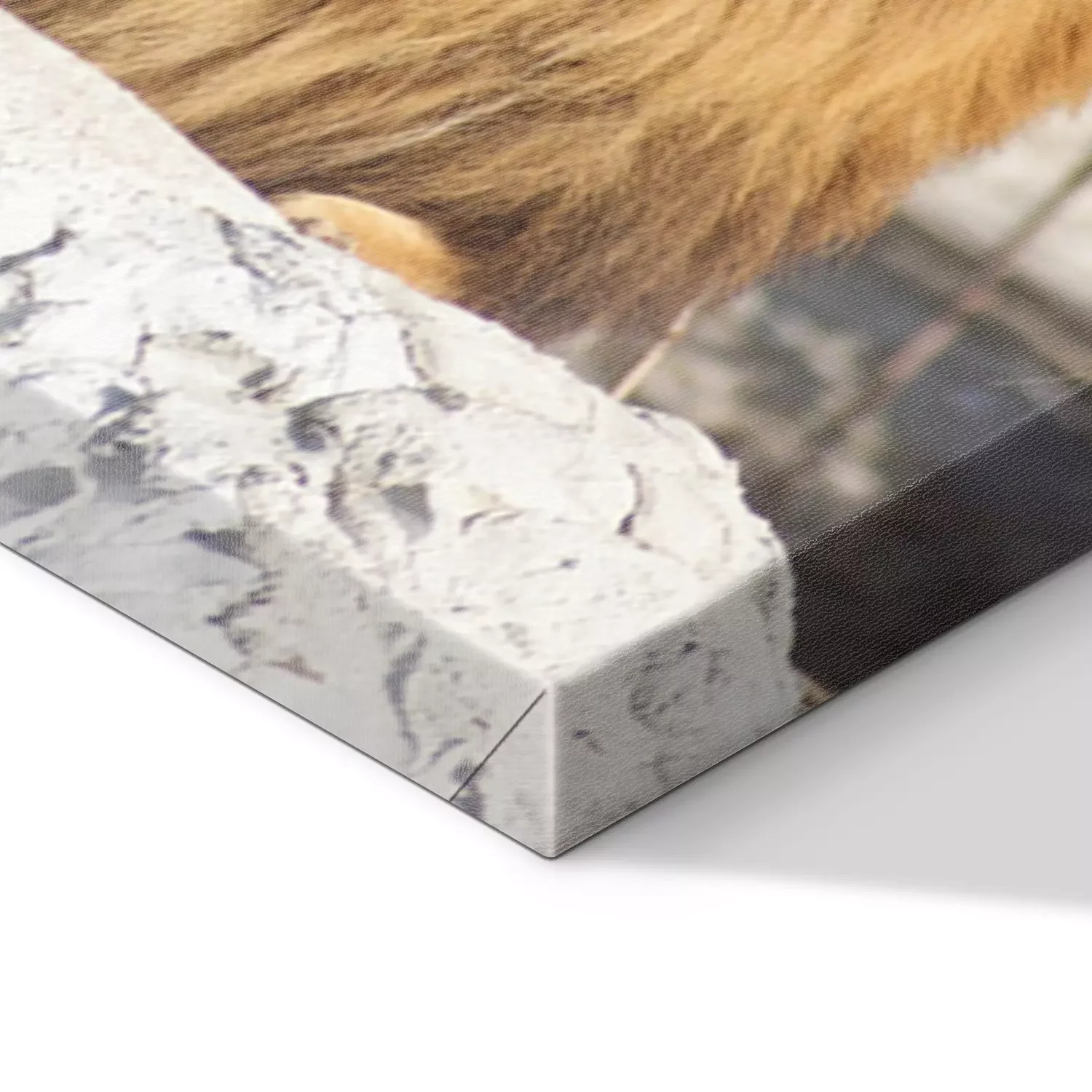 De print wordt aangebracht op hoogwaardig canvas dat op een schildersweefgetouw (spieraam) wordt gespannen. Omdat de print de zijranden bedekt, hoeft het ontwerp niet met een extra kader te worden omlijst. Wij raden ook composities aan die uit meerdere foto's bestaan en zo een coherente compositie vormen.