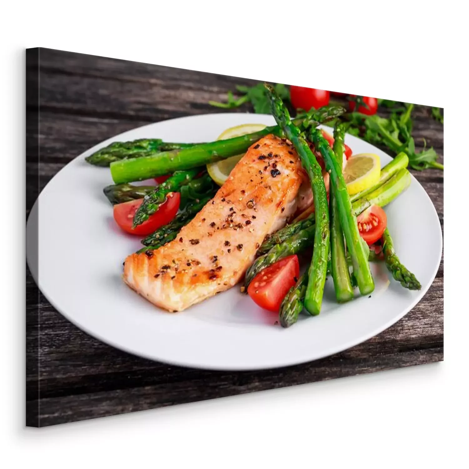 Canvas Gebakken zalm met asperges, tomaten, citroen, geel limoen op een witte plaat