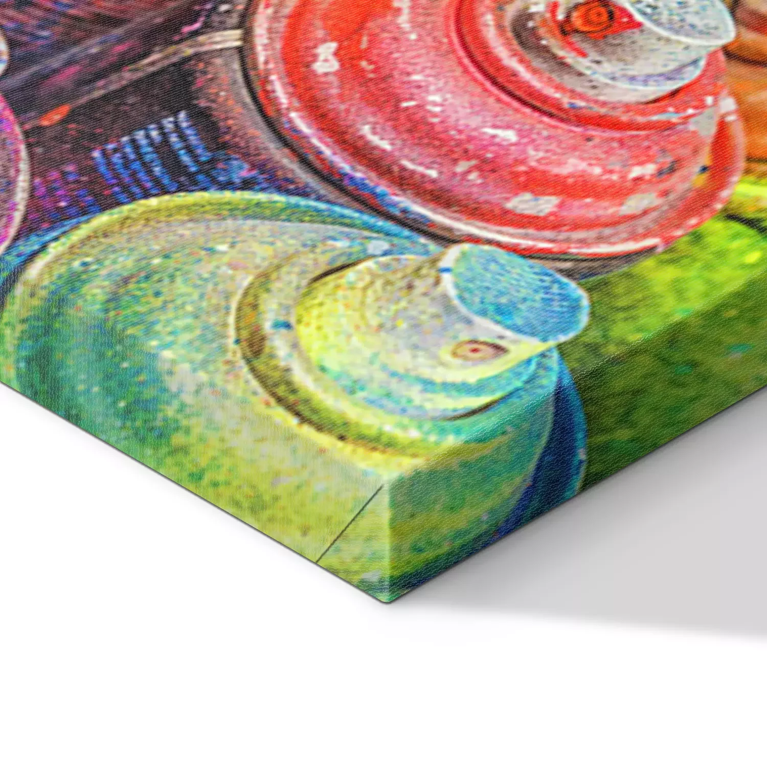 De print wordt aangebracht op hoogwaardig canvas dat op een schildersweefgetouw (spieraam) wordt gespannen. Omdat de print de zijranden bedekt, hoeft het ontwerp niet met een extra kader te worden omlijst. Wij raden ook composities aan die uit meerdere foto's bestaan en zo een coherente compositie vormen.