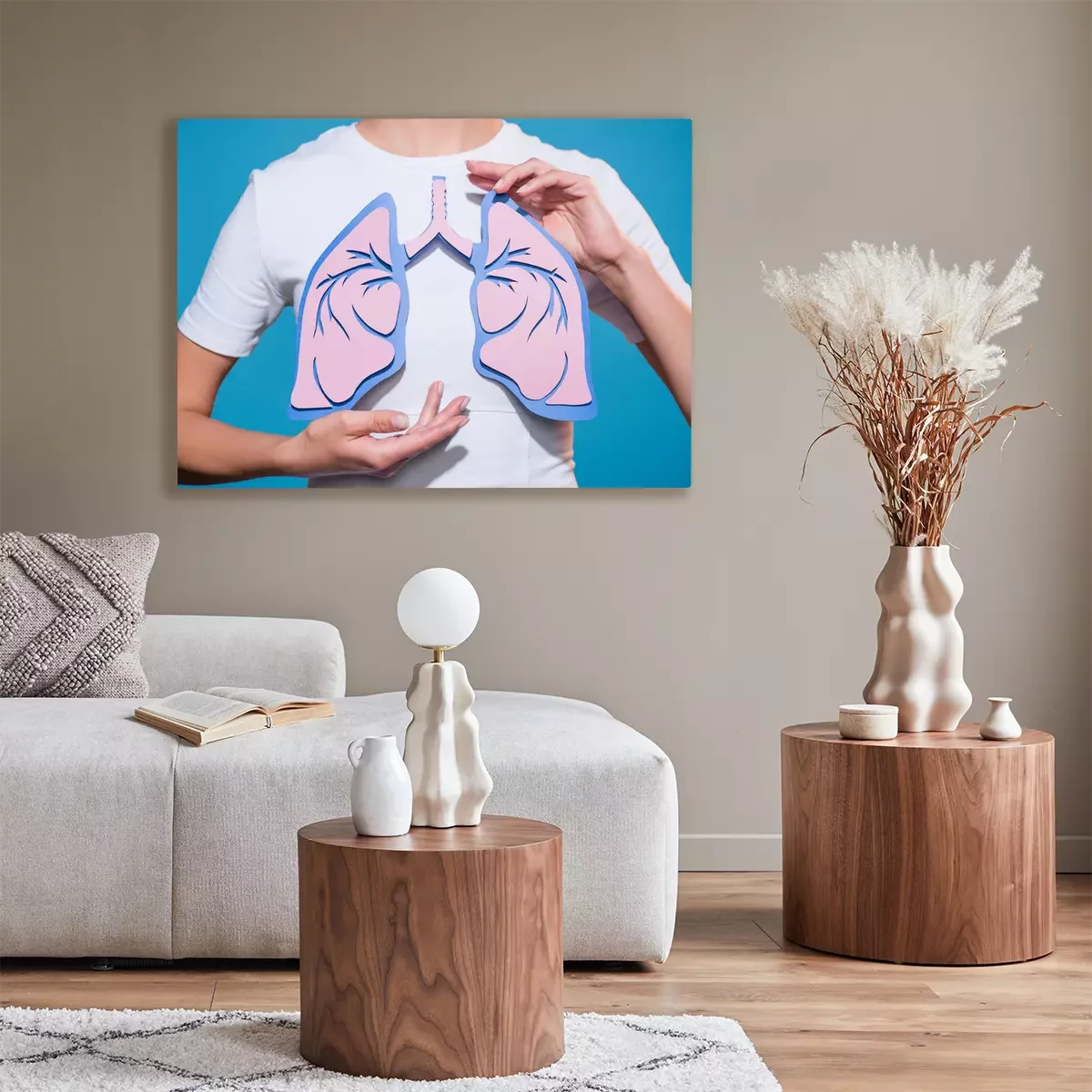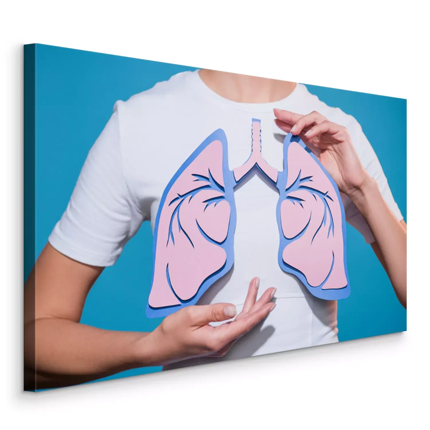 Canvas: gedeeltelijke weergave van de vrouw in witte t-shirt met papier vervaardigde longen op blauwe achtergrond