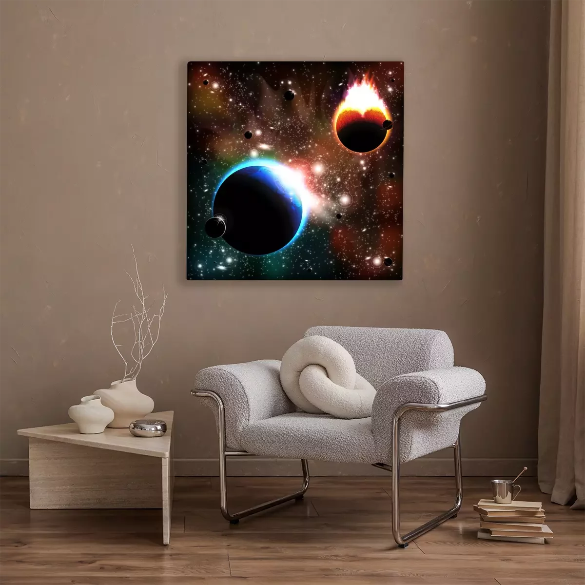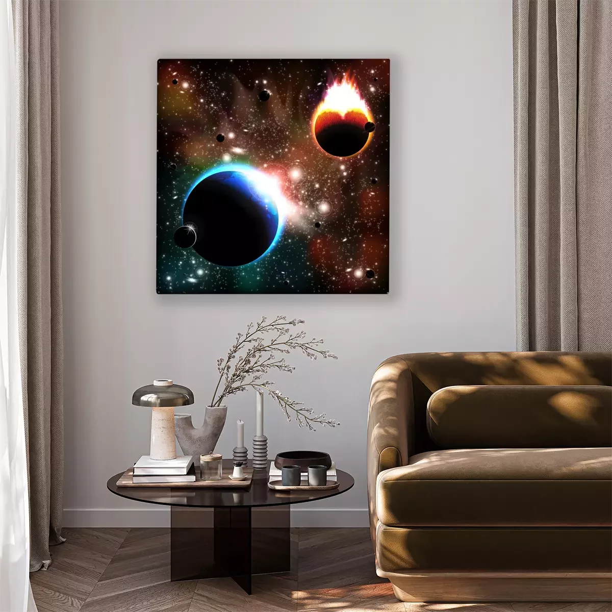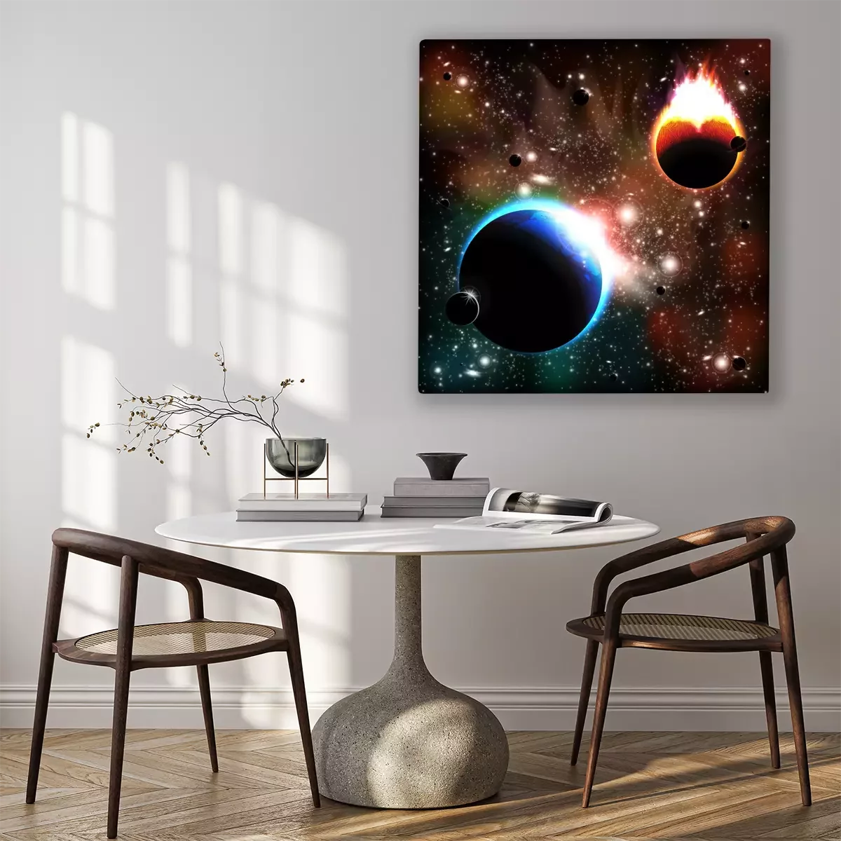 De print wordt aangebracht op hoogwaardig canvas dat op een schildersweefgetouw (spieraam) wordt gespannen. Omdat de print de zijranden bedekt, hoeft het ontwerp niet met een extra kader te worden omlijst. Wij raden ook composities aan die uit meerdere foto's bestaan en zo een coherente compositie vormen.
