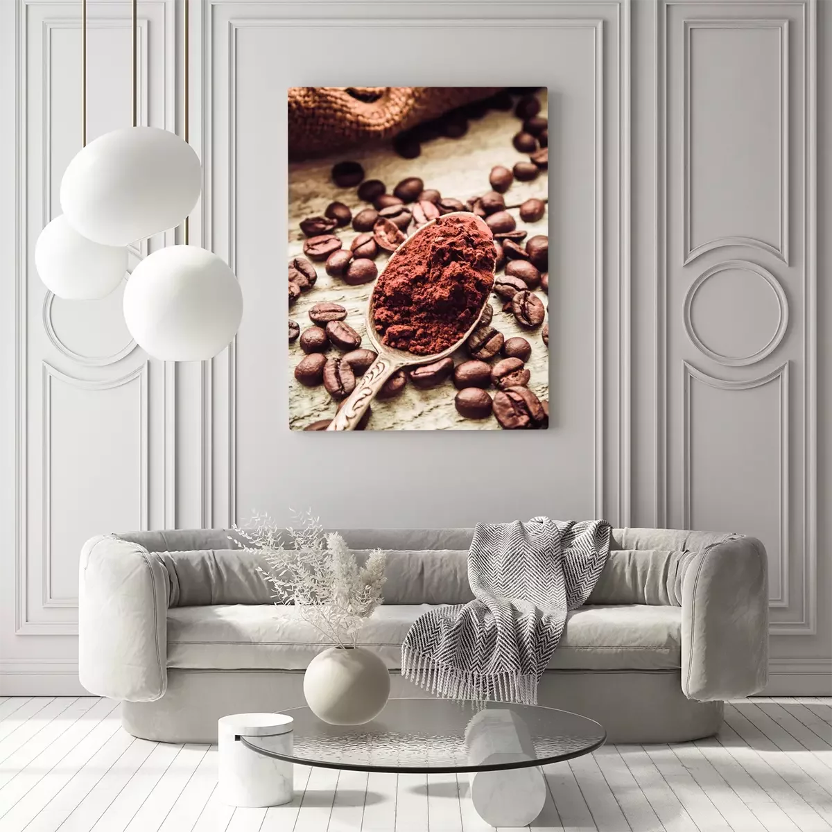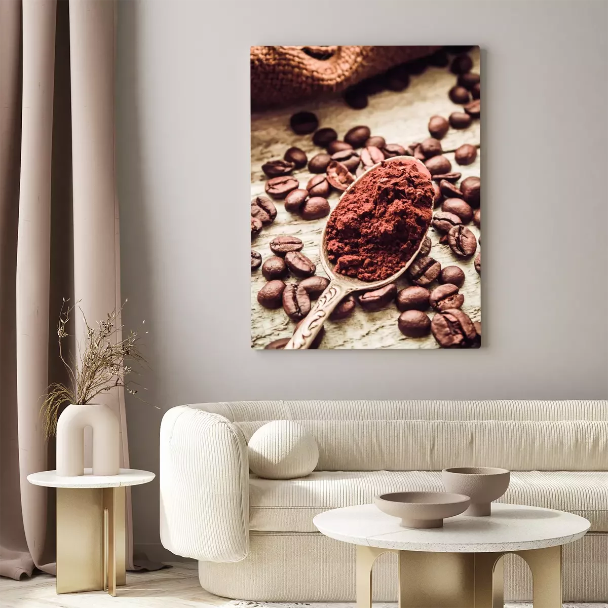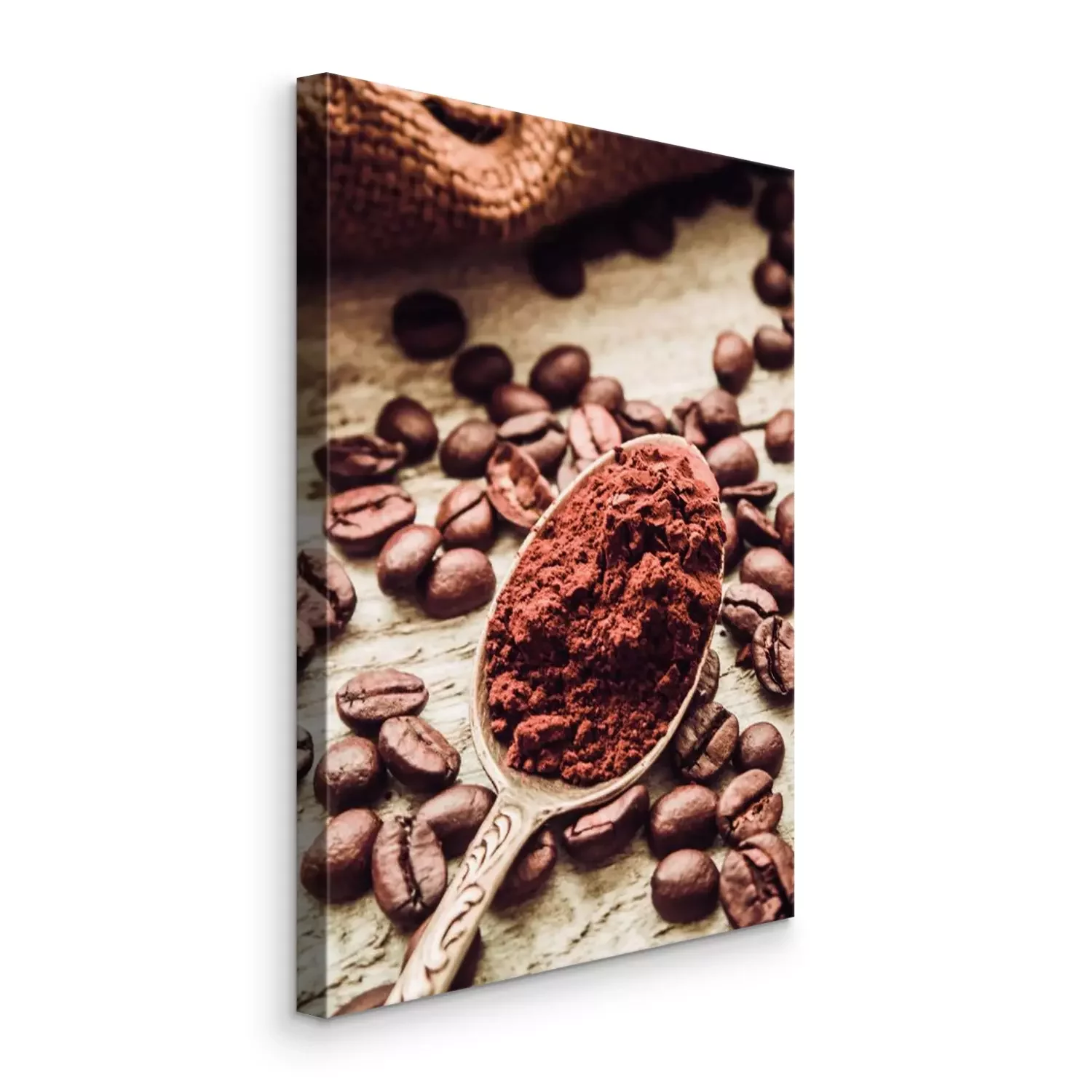 Canvas: Gemalen koffie vergezeld van verse koffiebonen