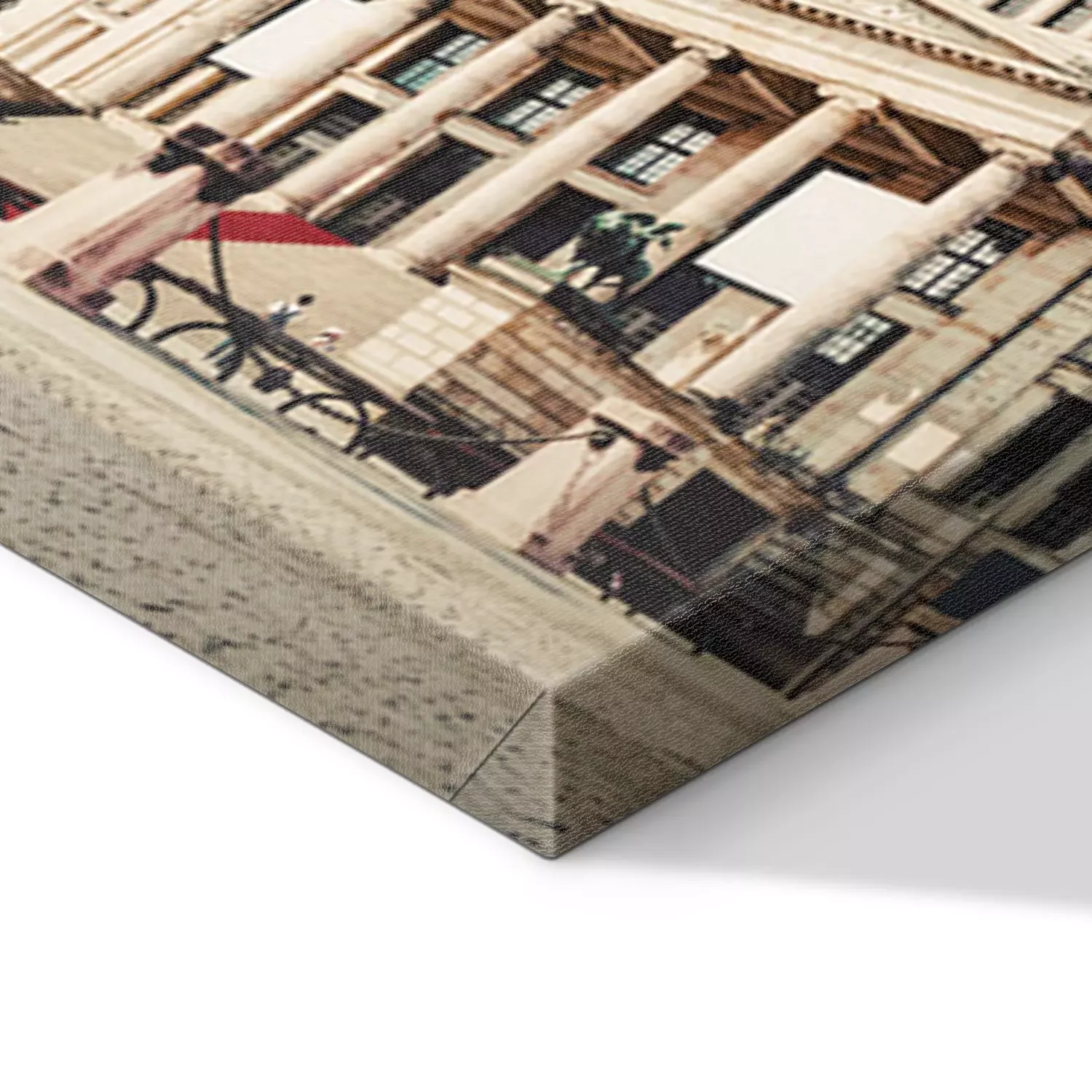 De print wordt aangebracht op hoogwaardig canvas dat op een schildersweefgetouw (spieraam) wordt gespannen. Omdat de print de zijranden bedekt, hoeft het ontwerp niet met een extra kader te worden omlijst. Wij raden ook composities aan die uit meerdere foto's bestaan en zo een coherente compositie vormen.