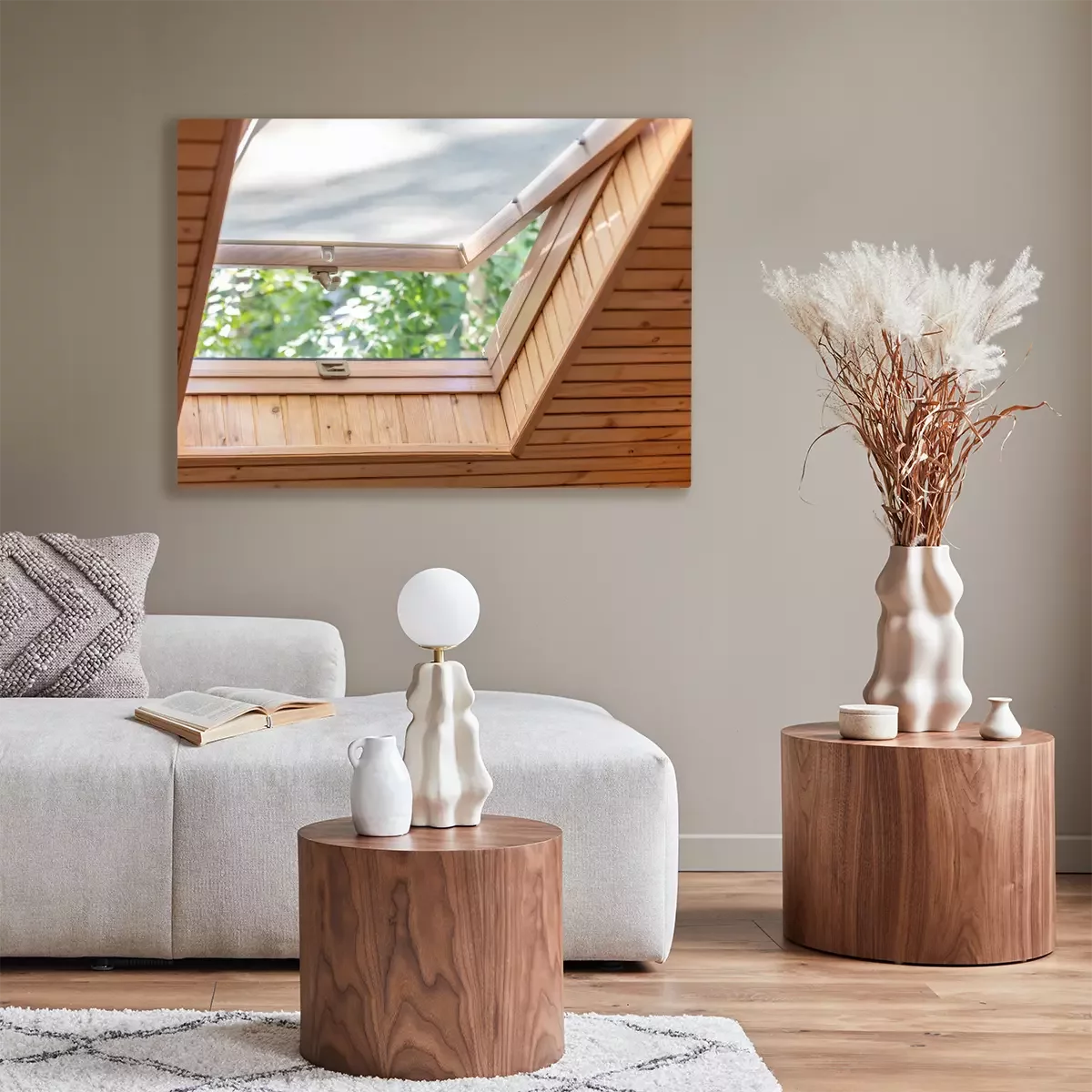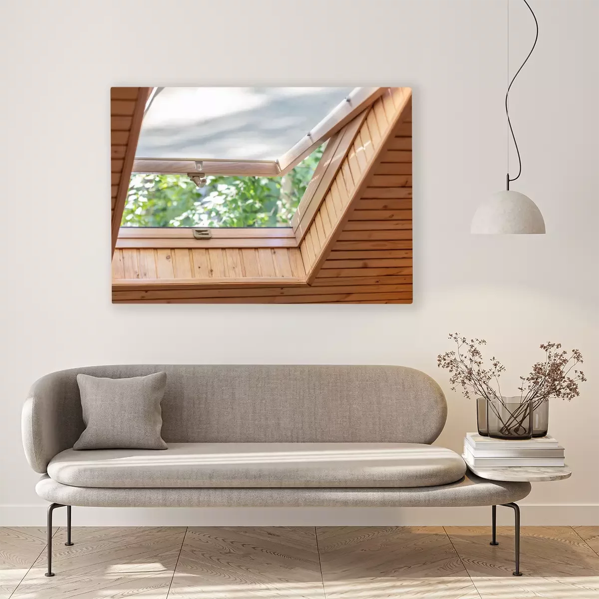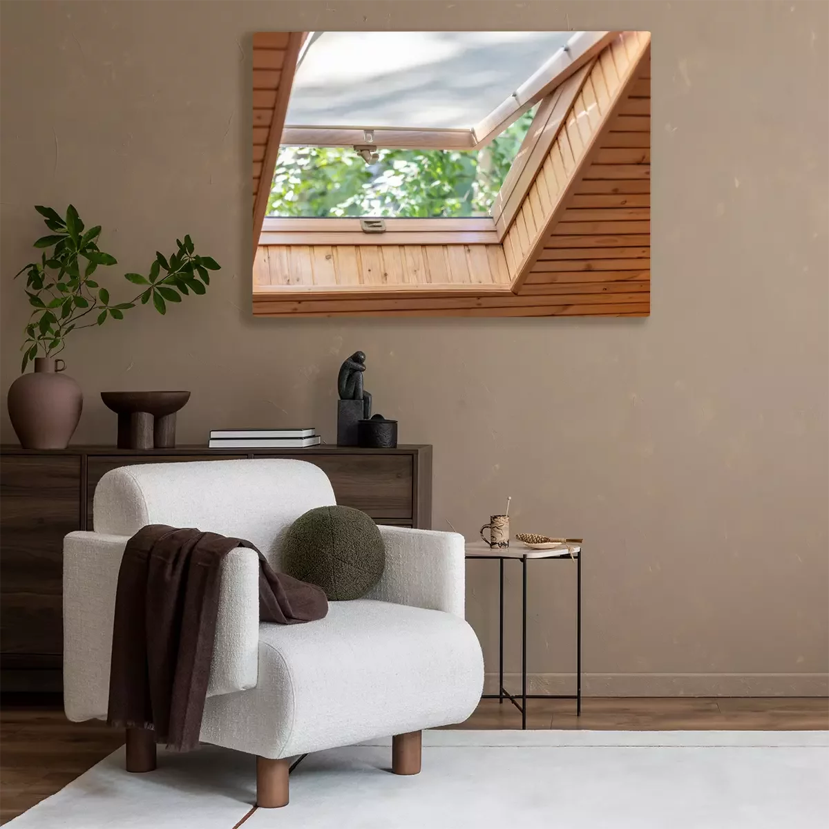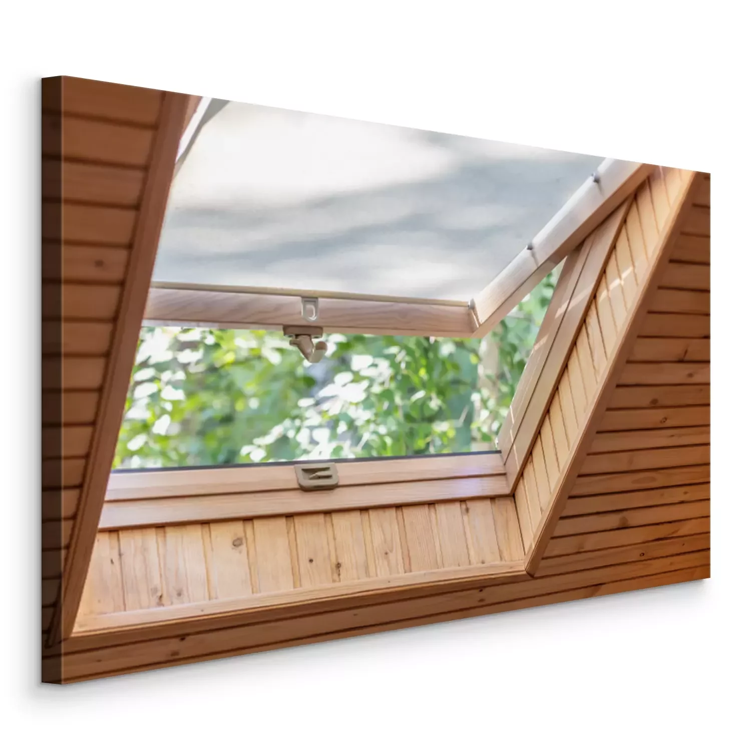 Canvas Geopend dakvenster met zonneblinden of gordijn in zolder. Kamer met schuin plafond gemaakt van natuurlijke eco-materialen en uitzicht op het park door een geopend raam. Milieuvriendelijk huis