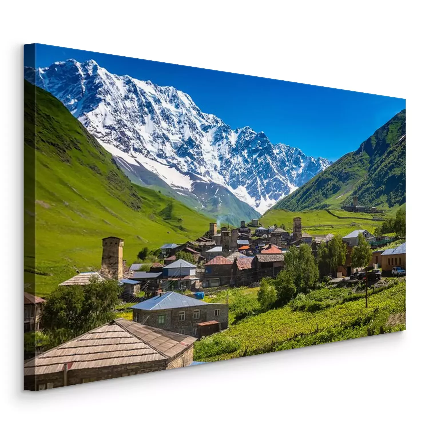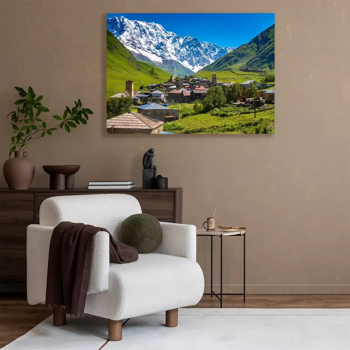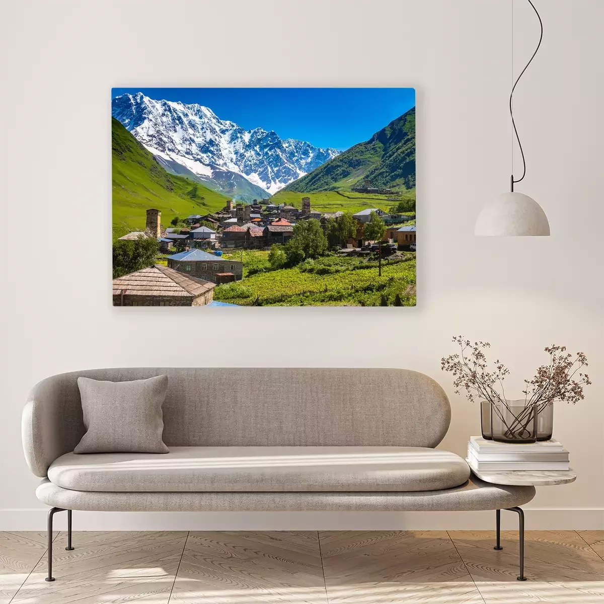 Canvas: Georgian Village Ushguli with stone defense towers in a valley next to the river in Svaneti region near Mestia in Caucasus mountains in Georgia.
