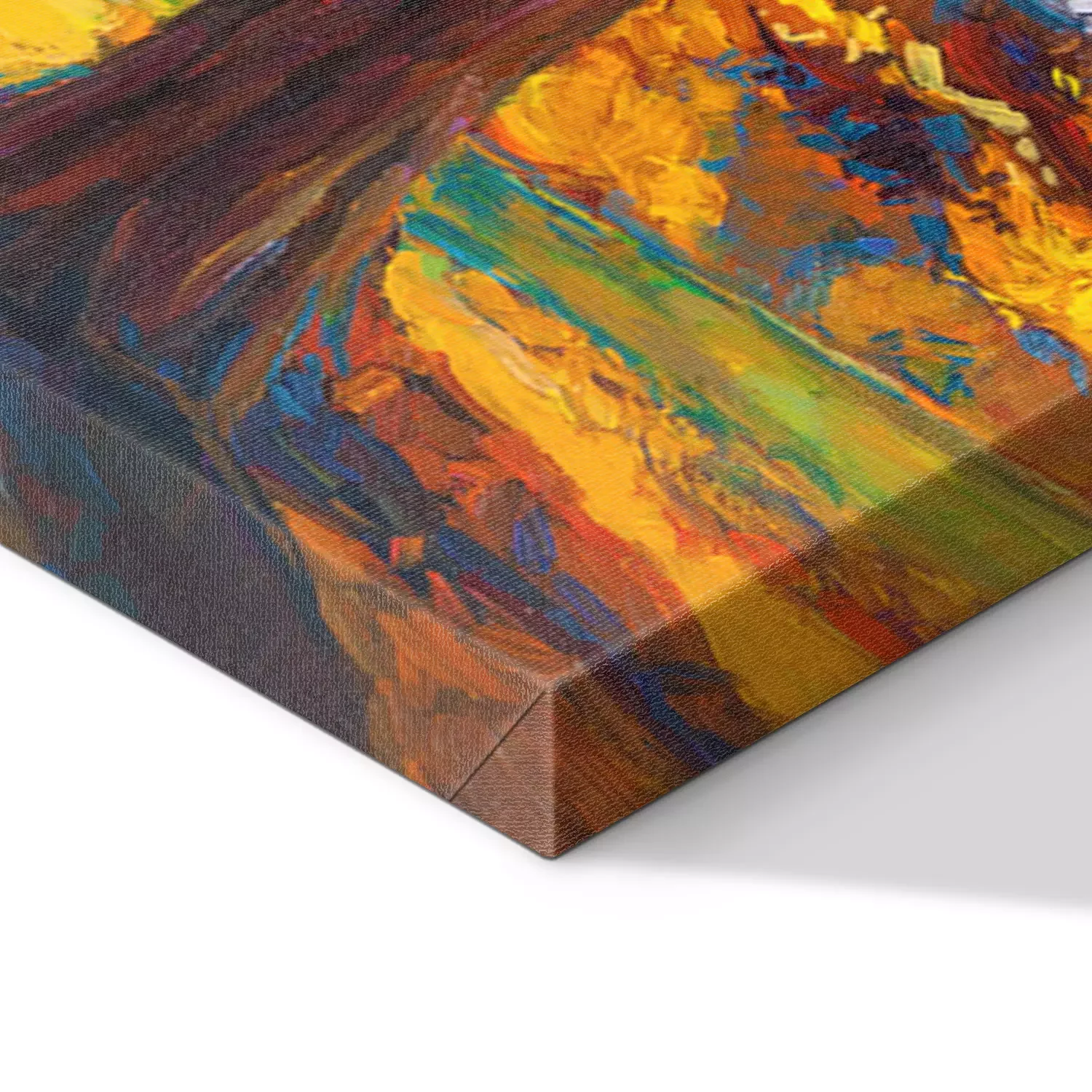 De print wordt aangebracht op hoogwaardig canvas dat op een schildersweefgetouw (spieraam) wordt gespannen. Omdat de print de zijranden bedekt, hoeft het ontwerp niet met een extra kader te worden omlijst. Wij raden ook composities aan die uit meerdere foto's bestaan en zo een coherente compositie vormen.