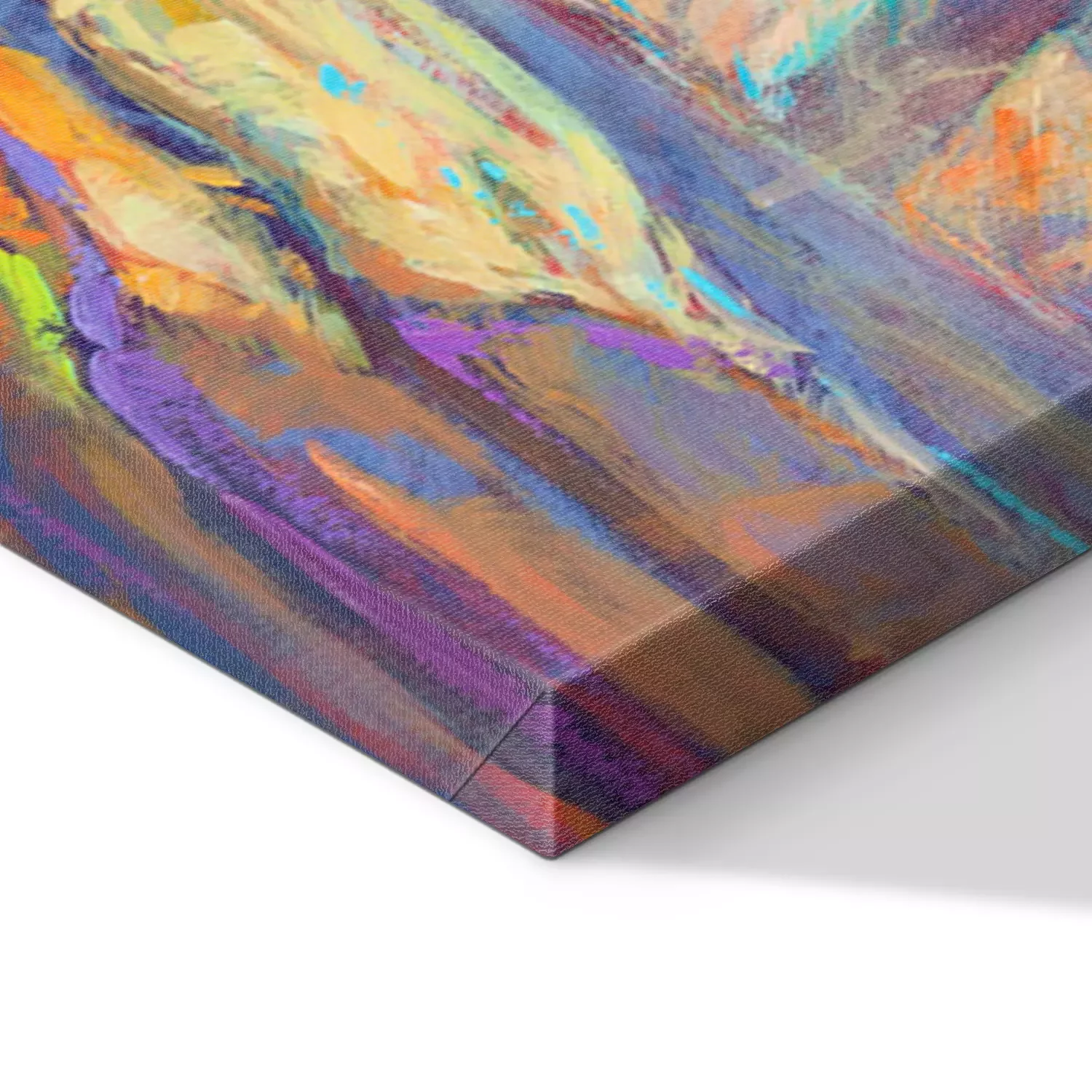 De print wordt aangebracht op hoogwaardig canvas dat op een schildersweefgetouw (spieraam) wordt gespannen. Omdat de print de zijranden bedekt, hoeft het ontwerp niet met een extra kader te worden omlijst. Wij raden ook composities aan die uit meerdere foto's bestaan en zo een coherente compositie vormen.