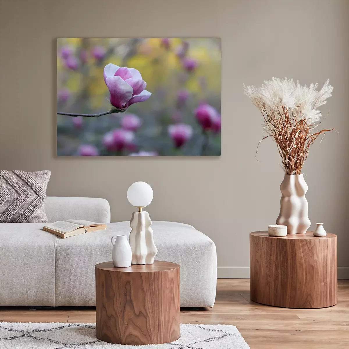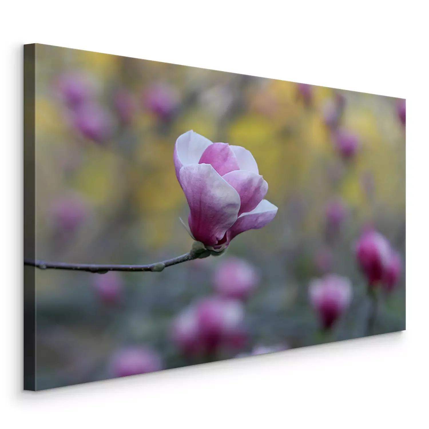Canvas: Gevoelige roze magnolia bloem op een onscherpe achtergrond