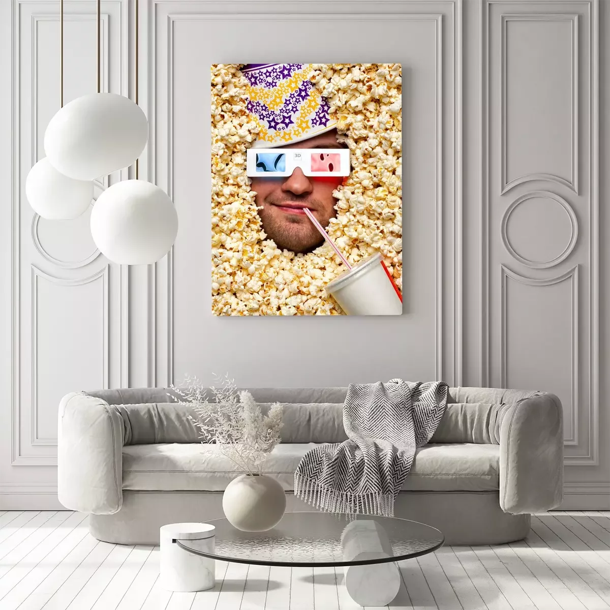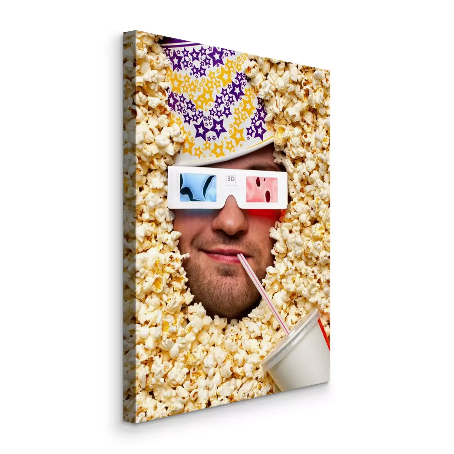 Canvas Gezicht in popcorn kijken naar 3D film
