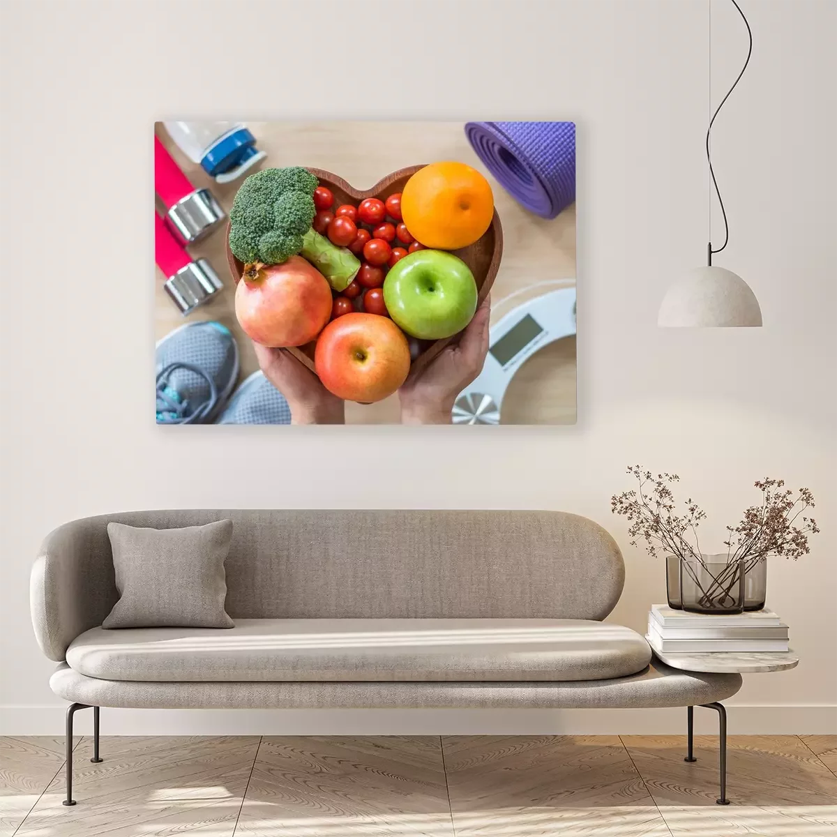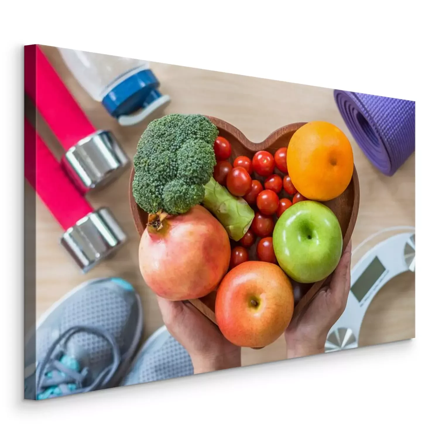 Canvas Gezond levensstijlconcept, schoon eten goed gezondheidsdiër in hartschotel met sportieve sportschool aerobic lichaamsbeweging training trainingsklasse apparatuur, gewichtskaart en sportschoenen in fit