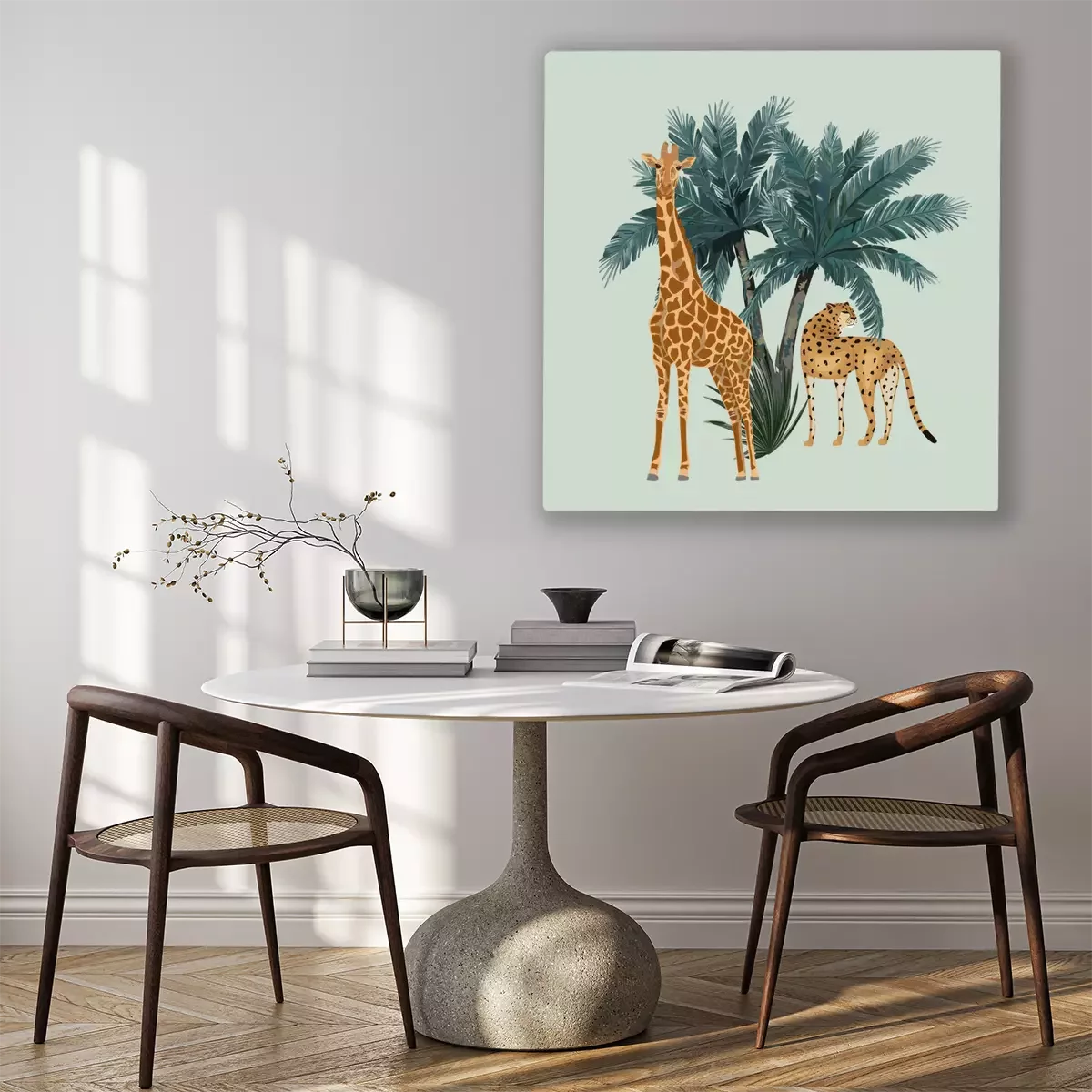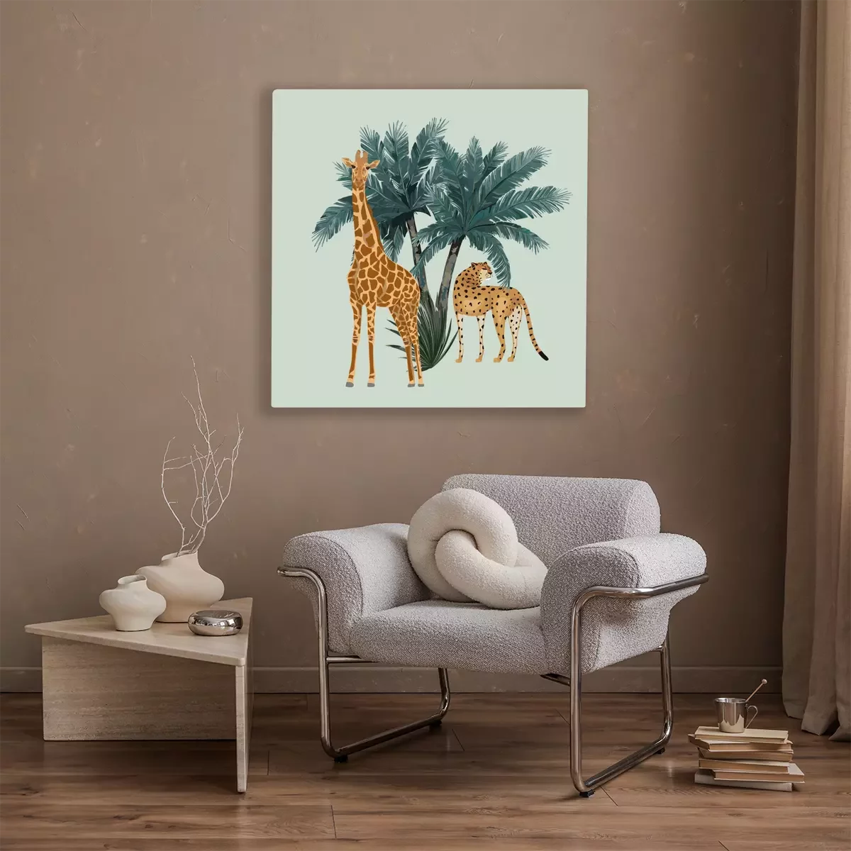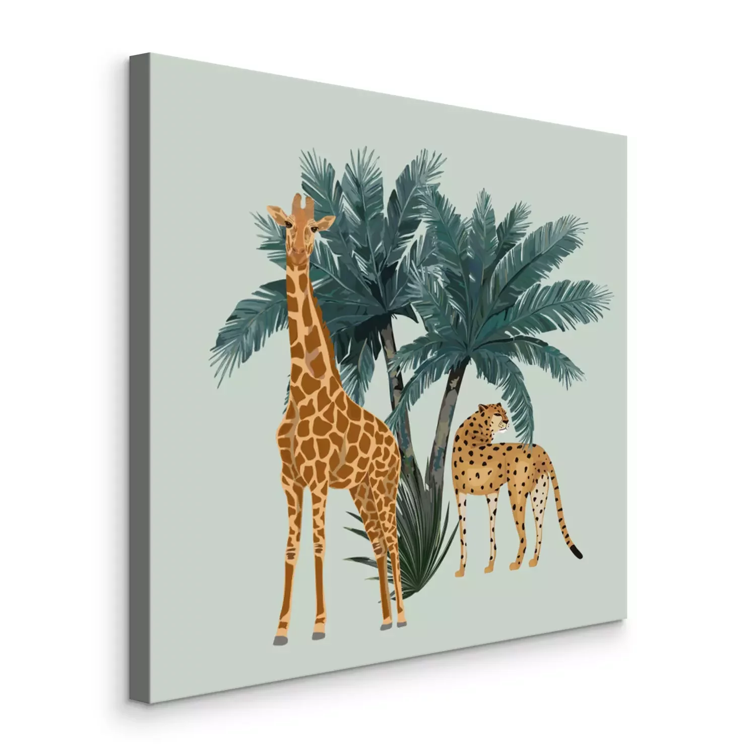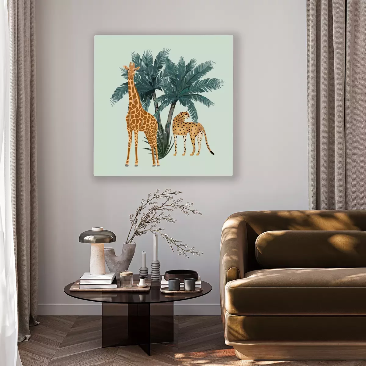 Papegaaiengiraffen en cheeta's op de achtergrond van palmbomen