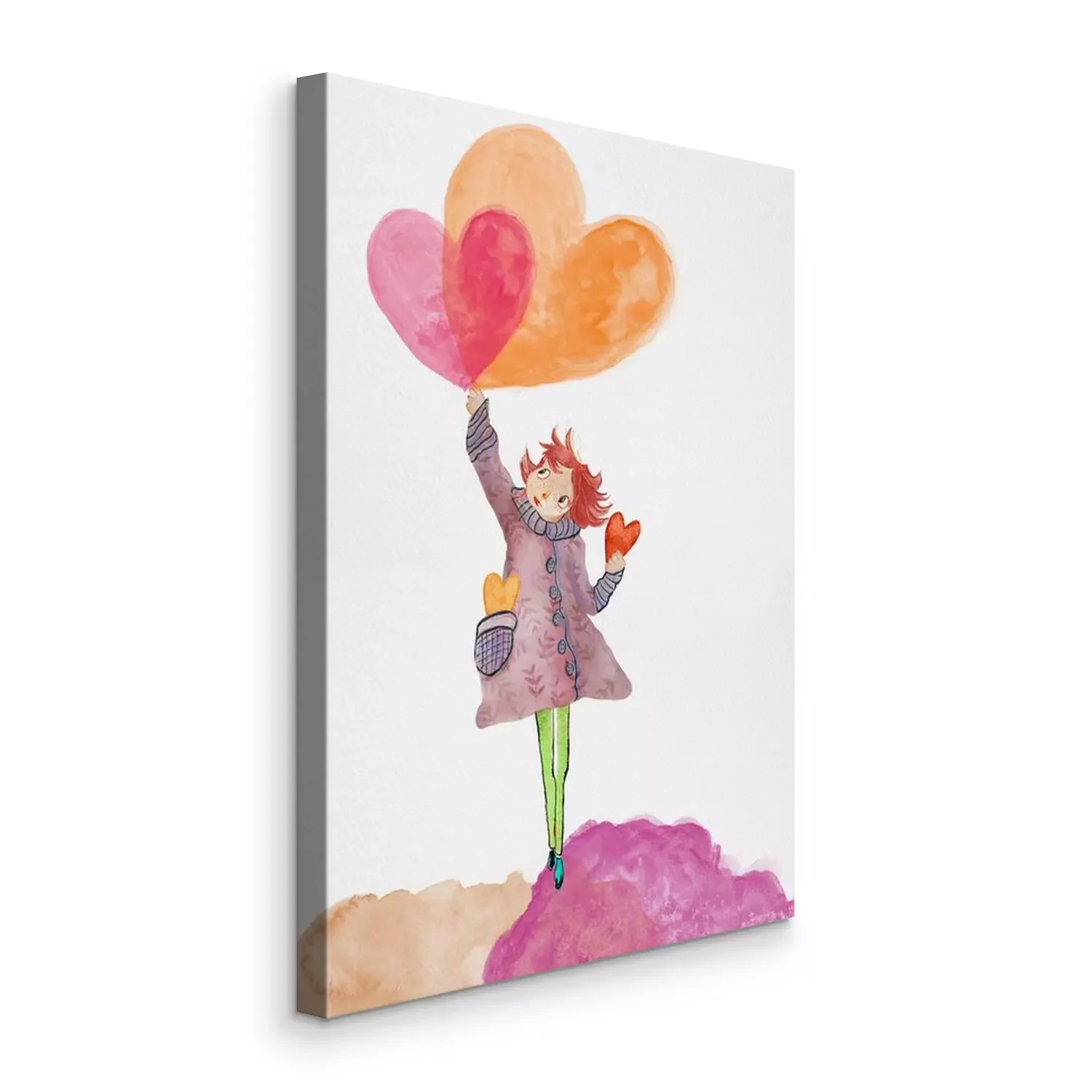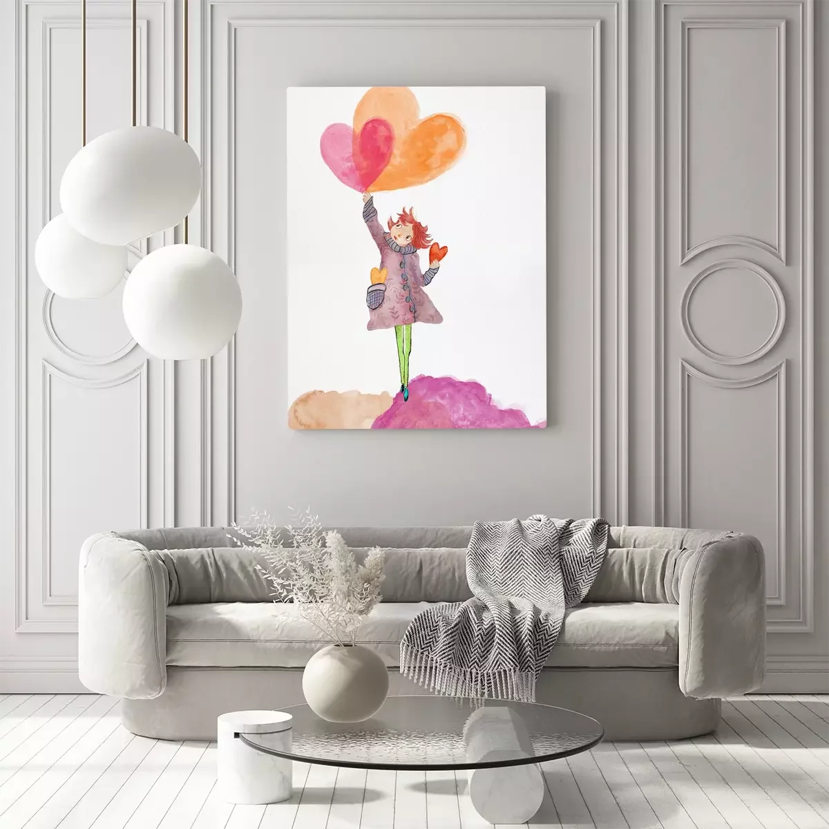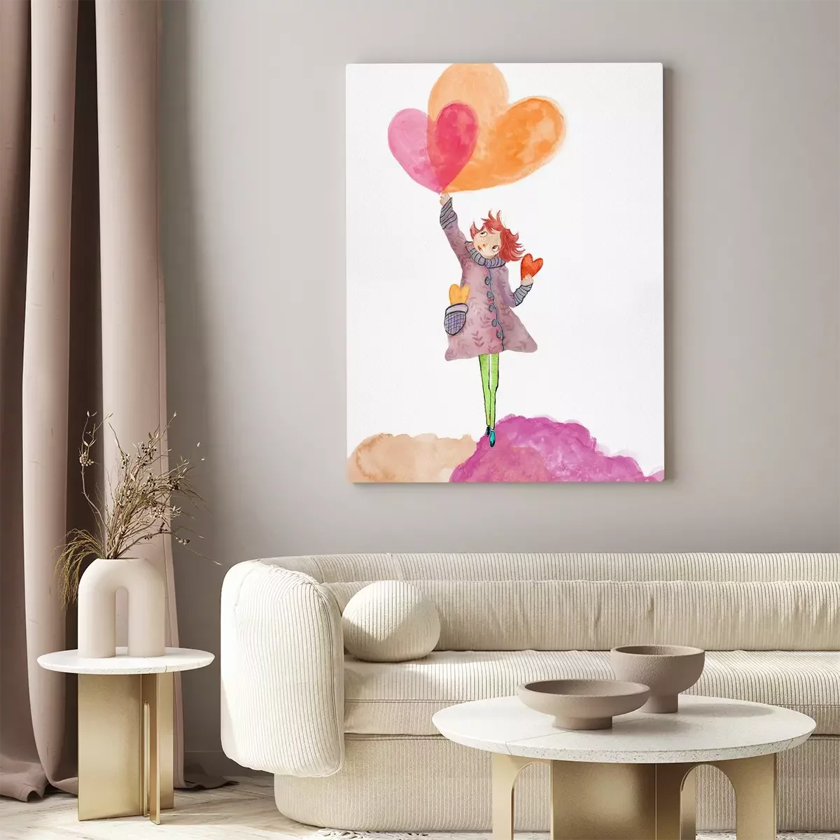 Canvas: Girl and hearts. Watercolor igreeting card. Love concept.