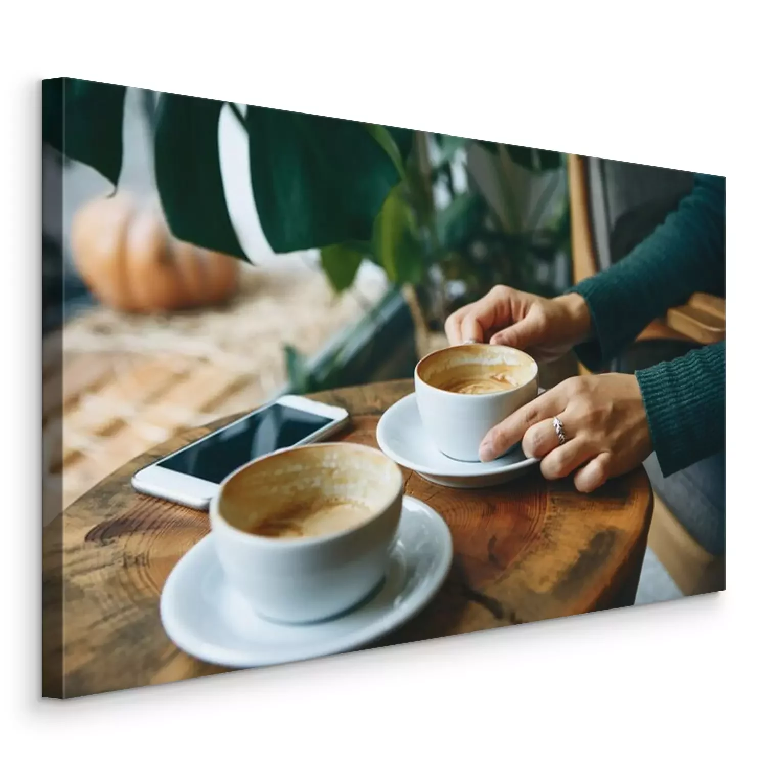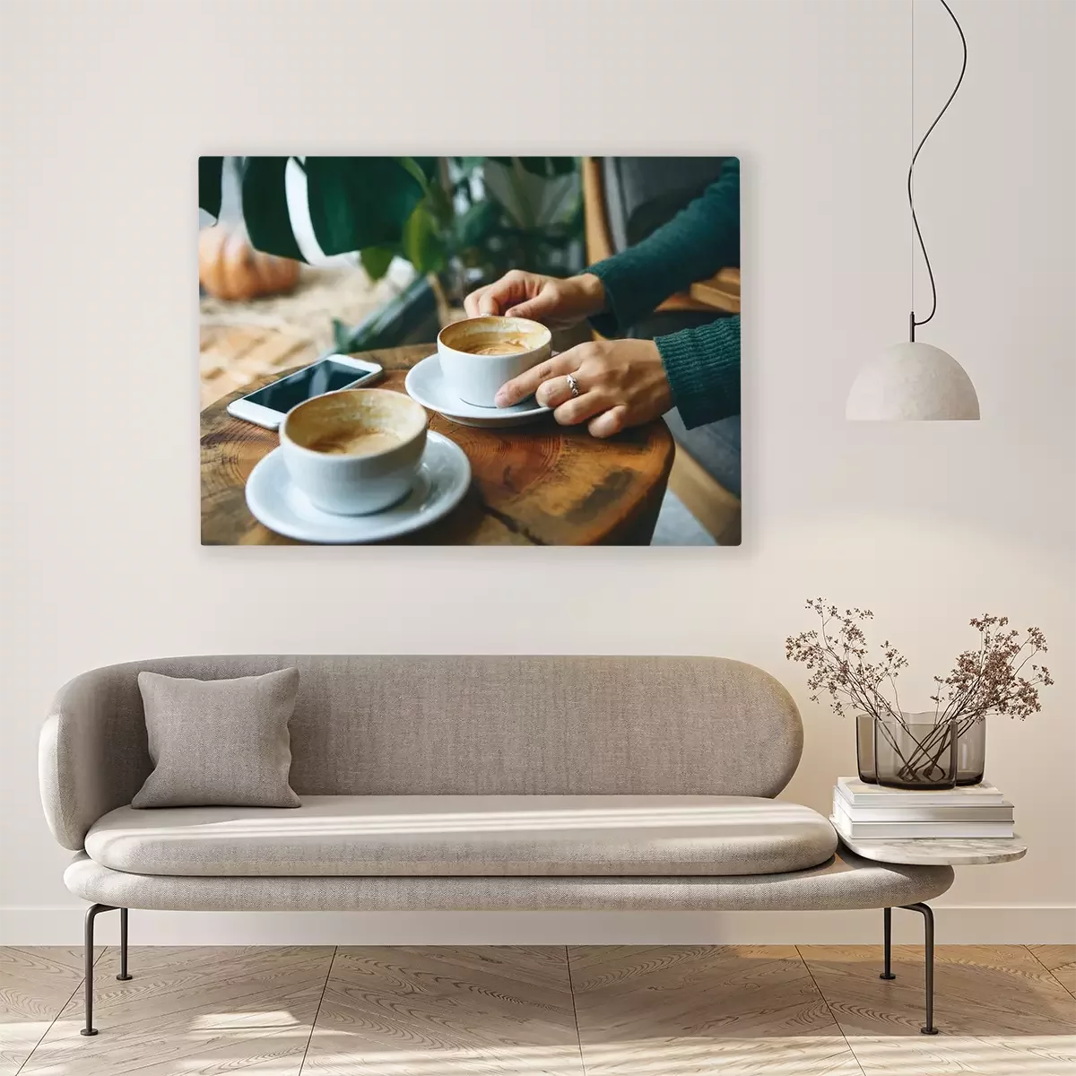 Canvas Girl drinks coffee in a cafe during a meeting. Nearby, a cell phone lies on a table.