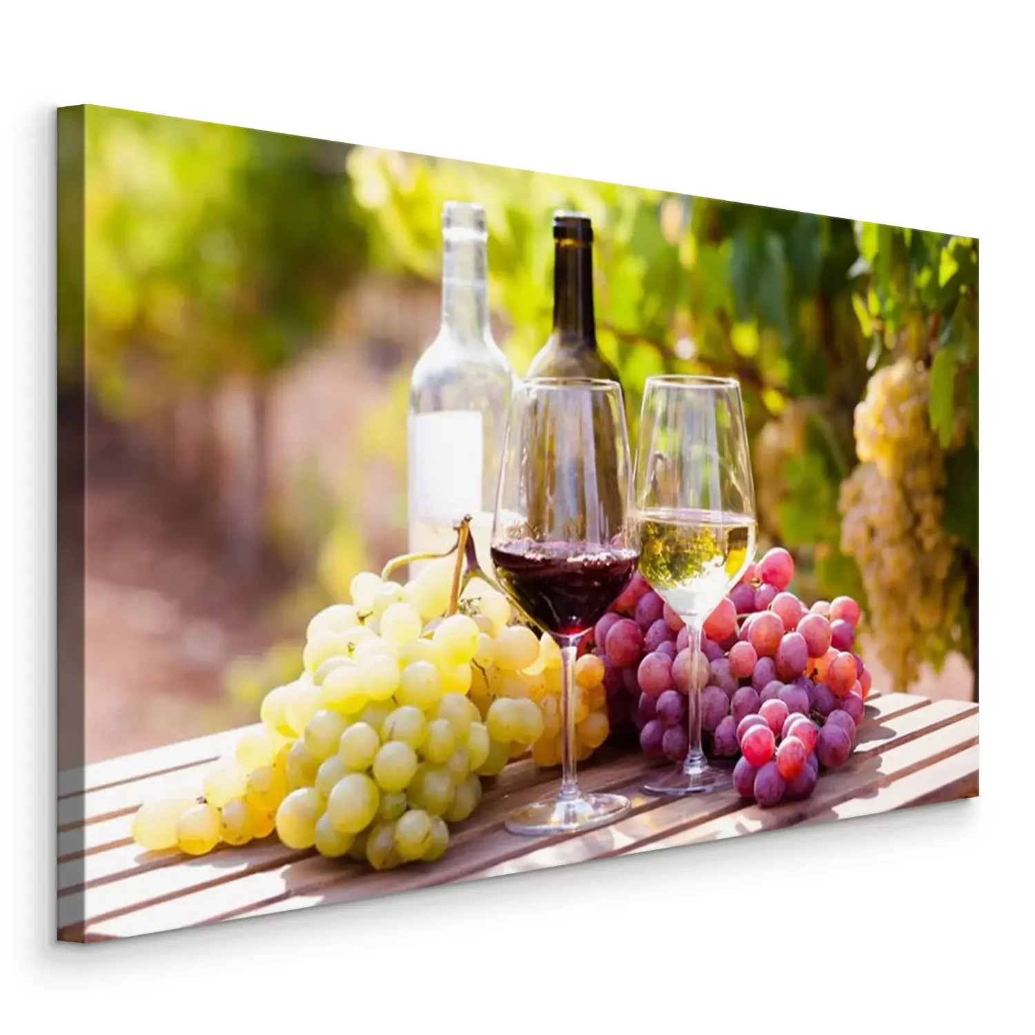 Canvas: glasses of red and white wine and ripe grapes on table in vineyard