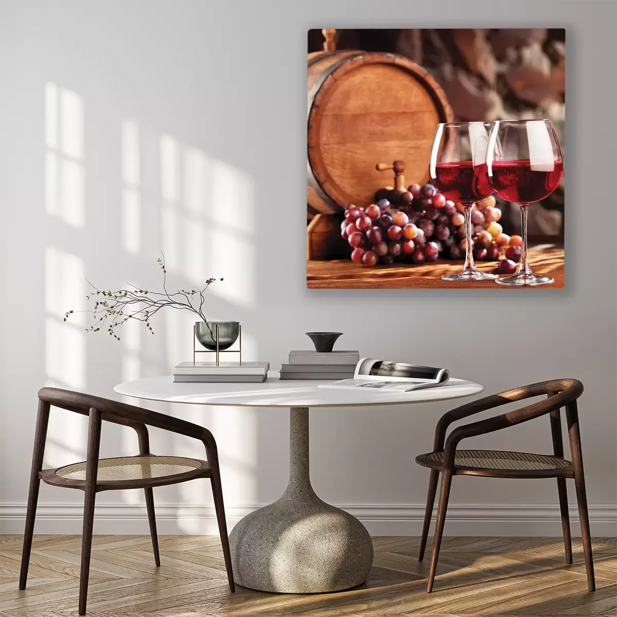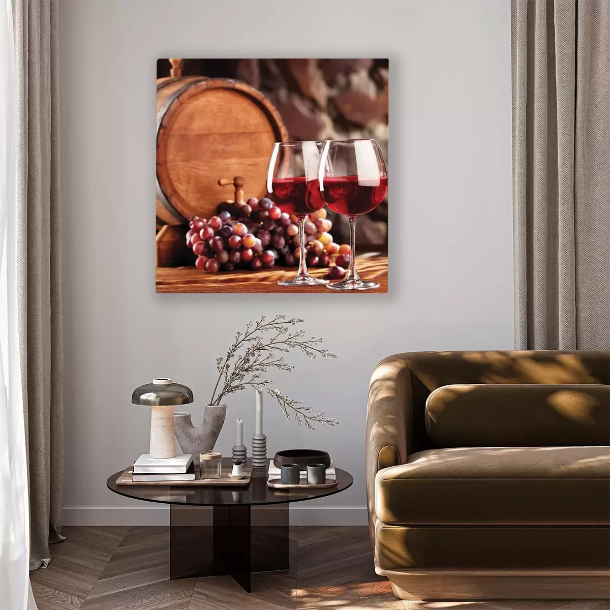 Glazen wijn tegen de achtergrond van druiven en een houten vat