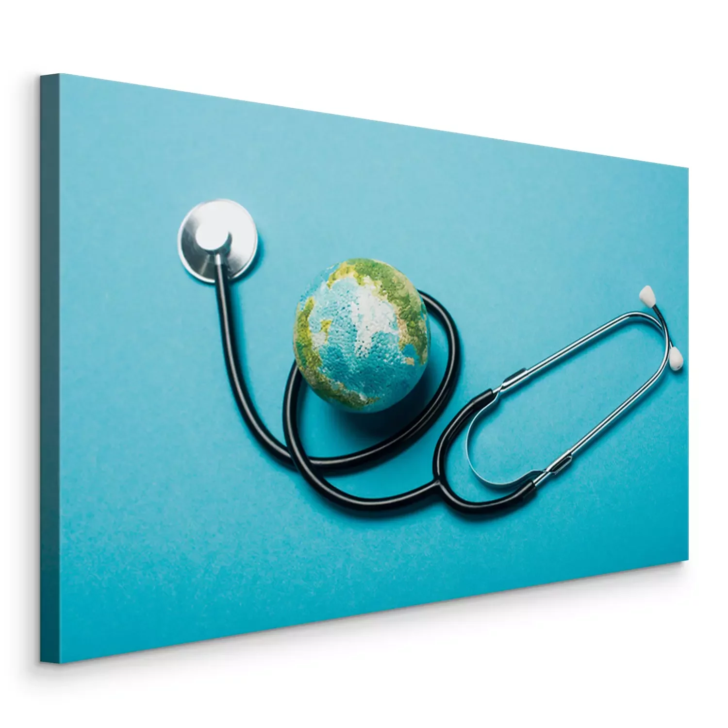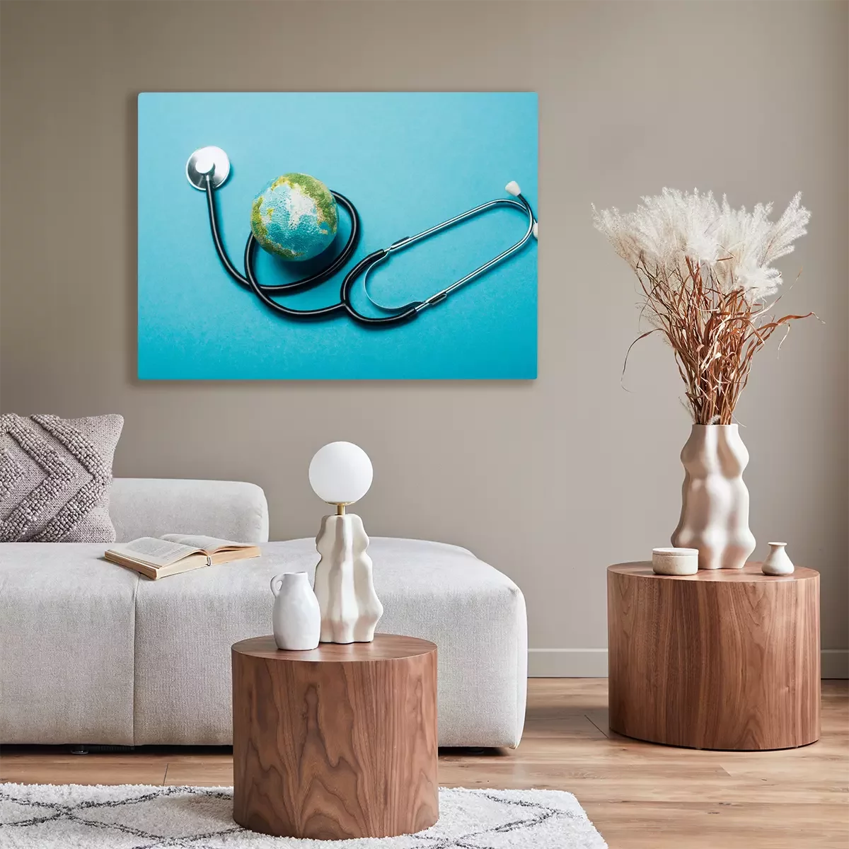 Canvas: Globe and stethoscope on blue background, world health day concept