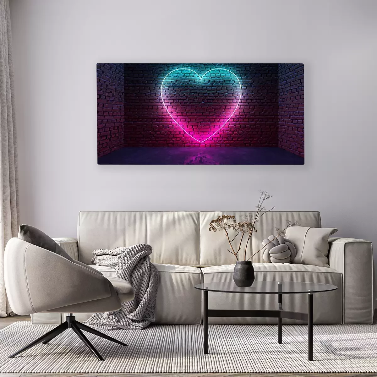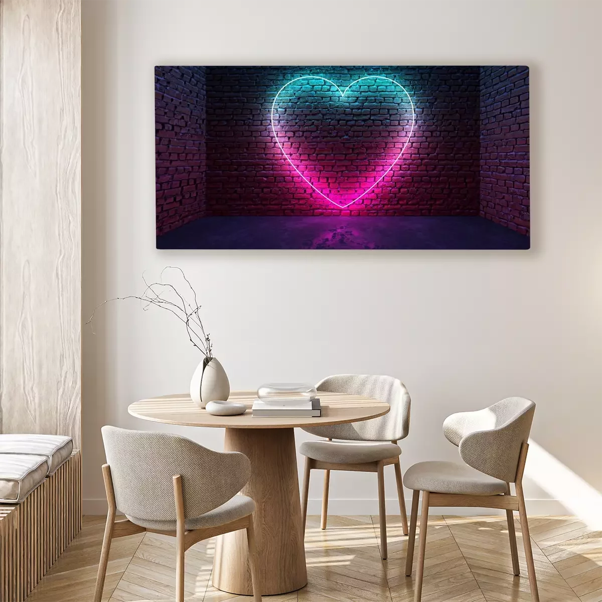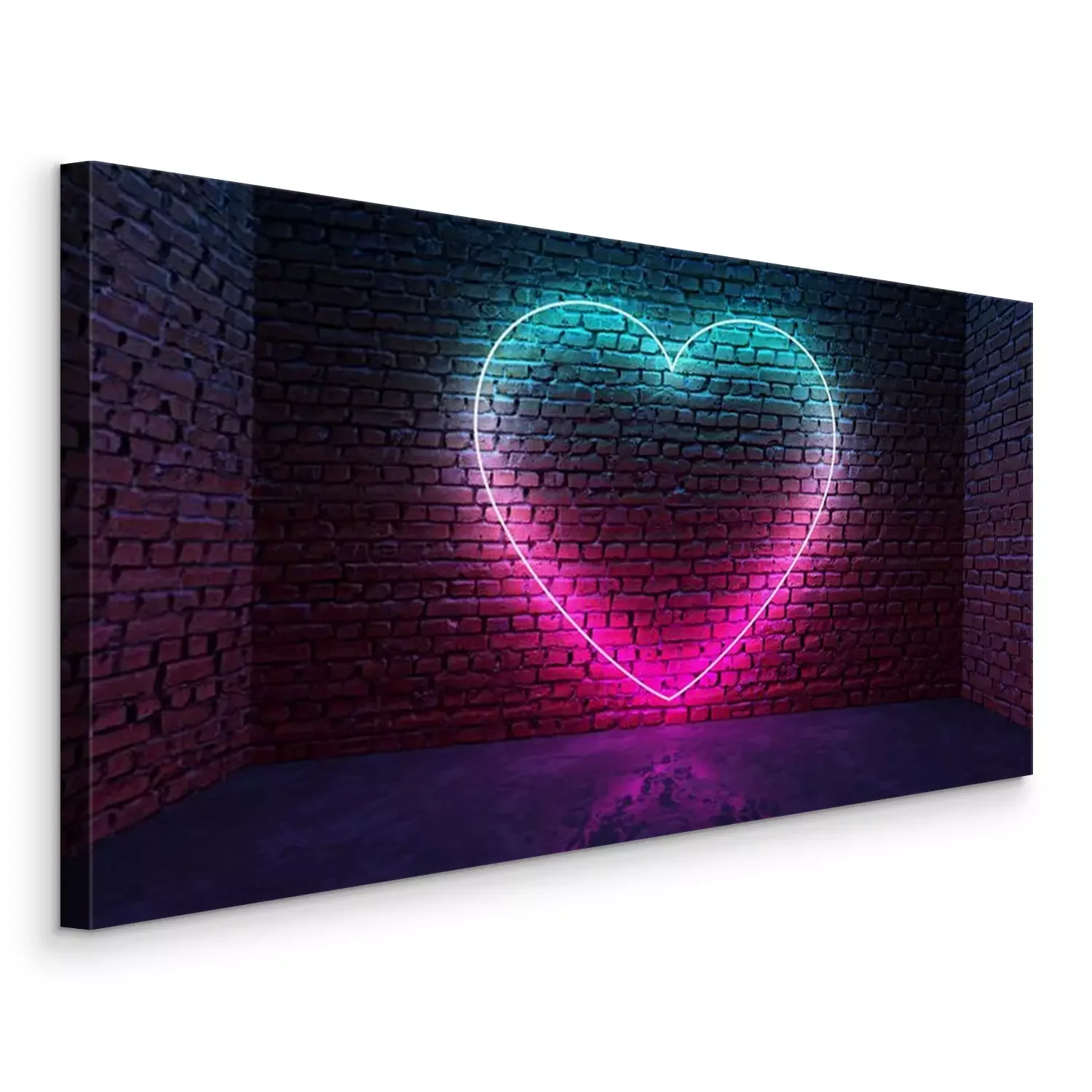 Canvas Glowing neon heart shaped like icon on brick wall in dark room