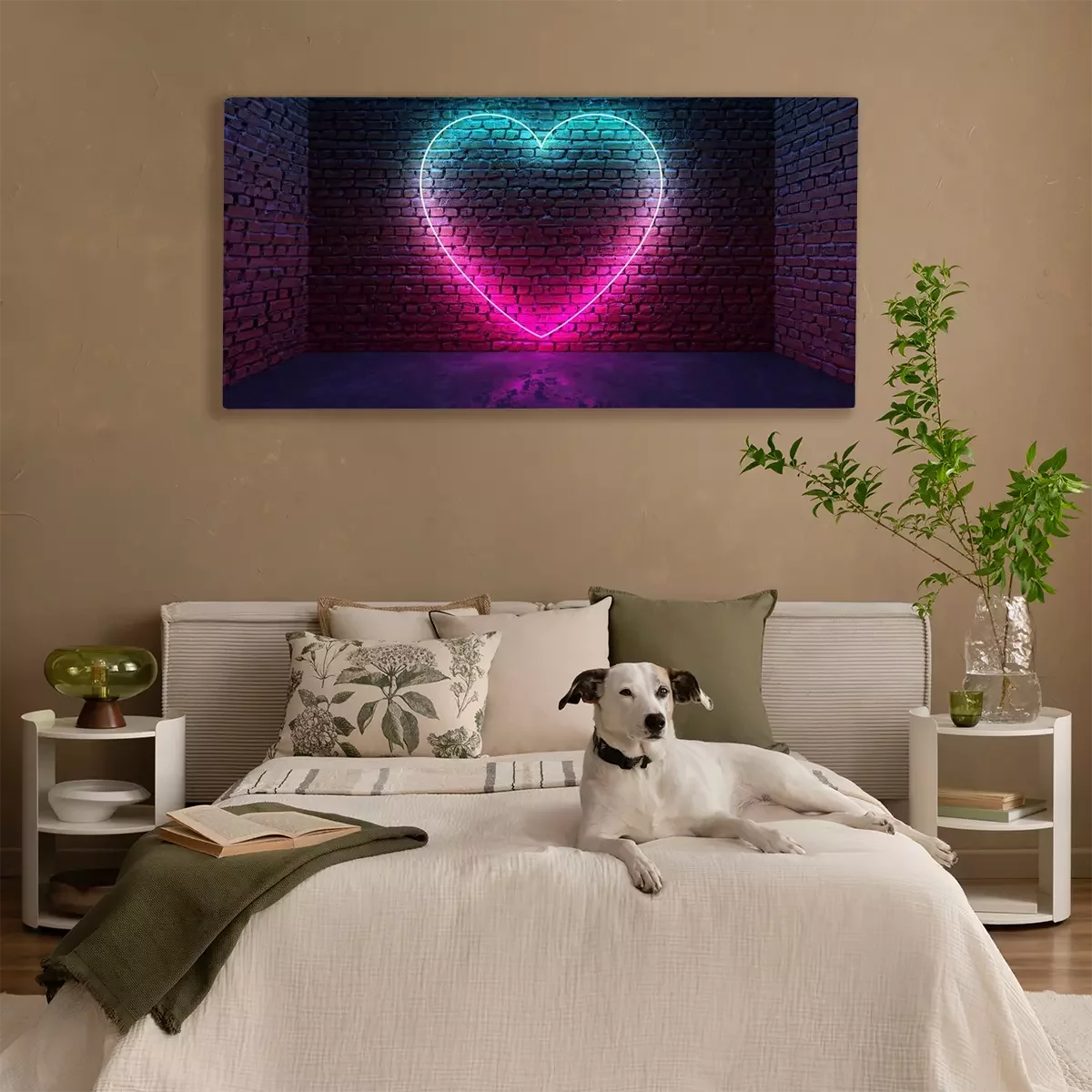 Canvas: Glowing neon heart shaped like icon on brick wall in dark room