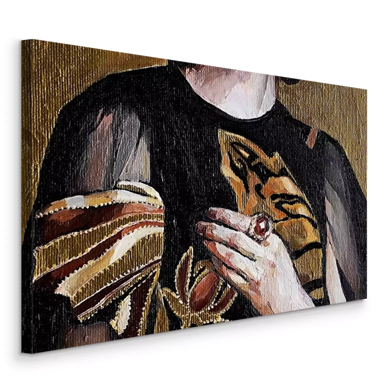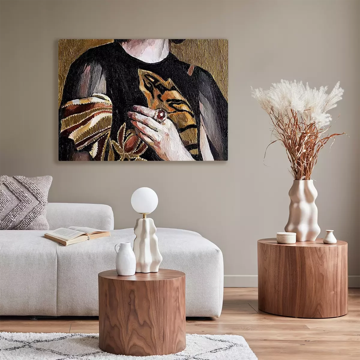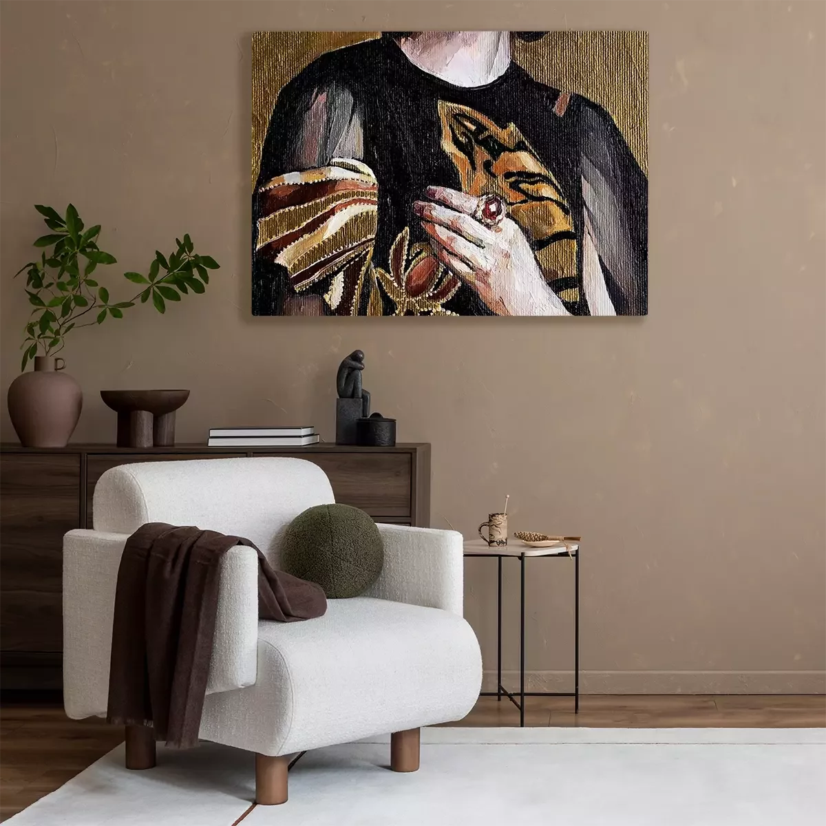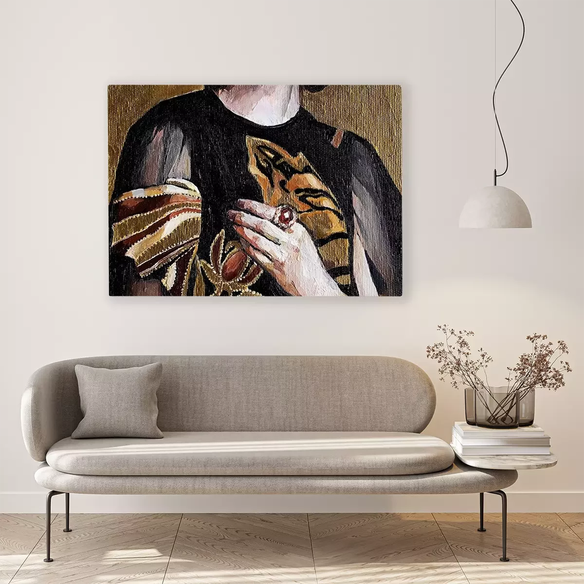 Canvas Golden elegance. Gentle female hand on the dark background of black clothes with gold ornament. The work fragment made in oil technique.