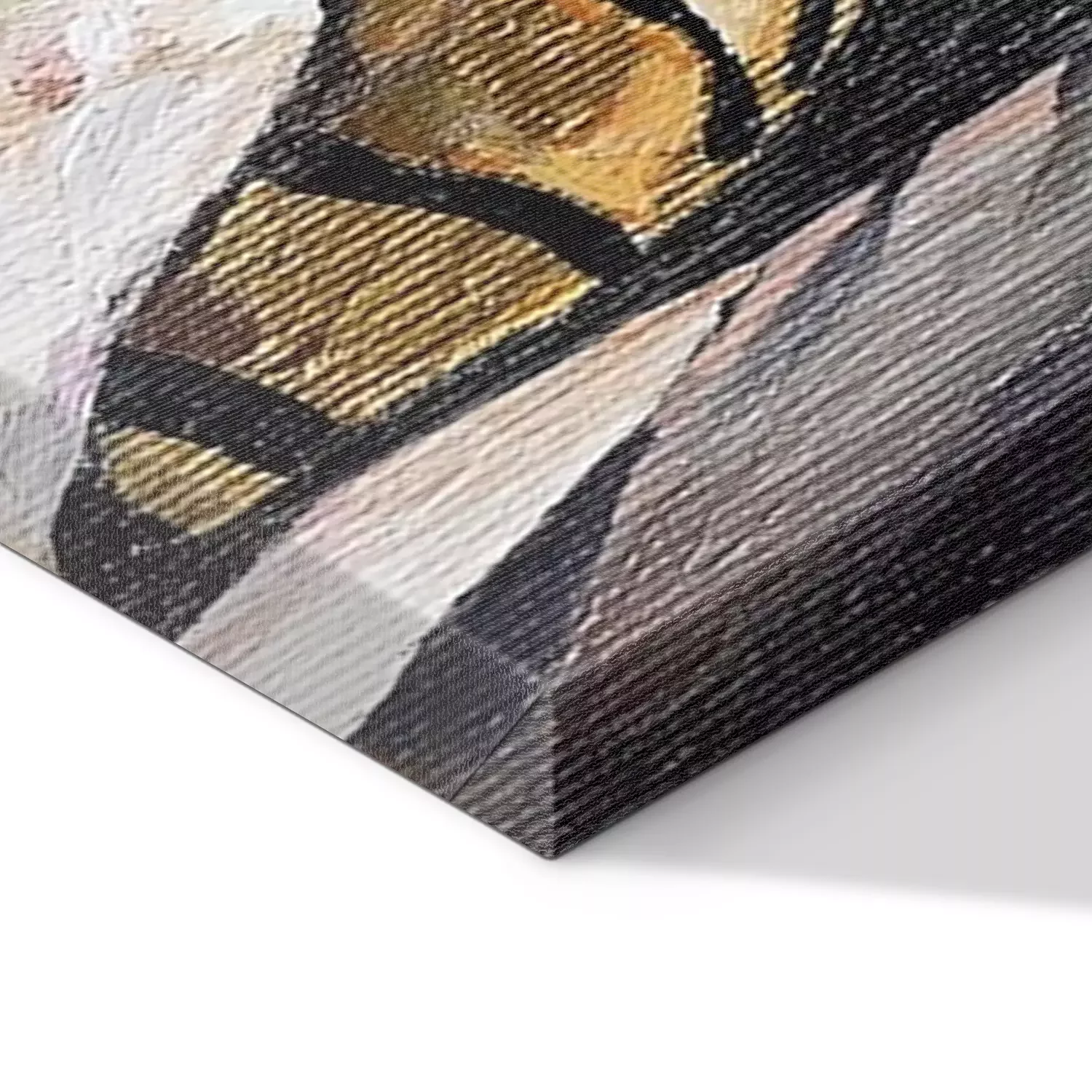 De print wordt aangebracht op hoogwaardig canvas dat op een schildersweefgetouw (spieraam) wordt gespannen. Omdat de print de zijranden bedekt, hoeft het ontwerp niet met een extra kader te worden omlijst. Wij raden ook composities aan die uit meerdere foto's bestaan en zo een coherente compositie vormen.