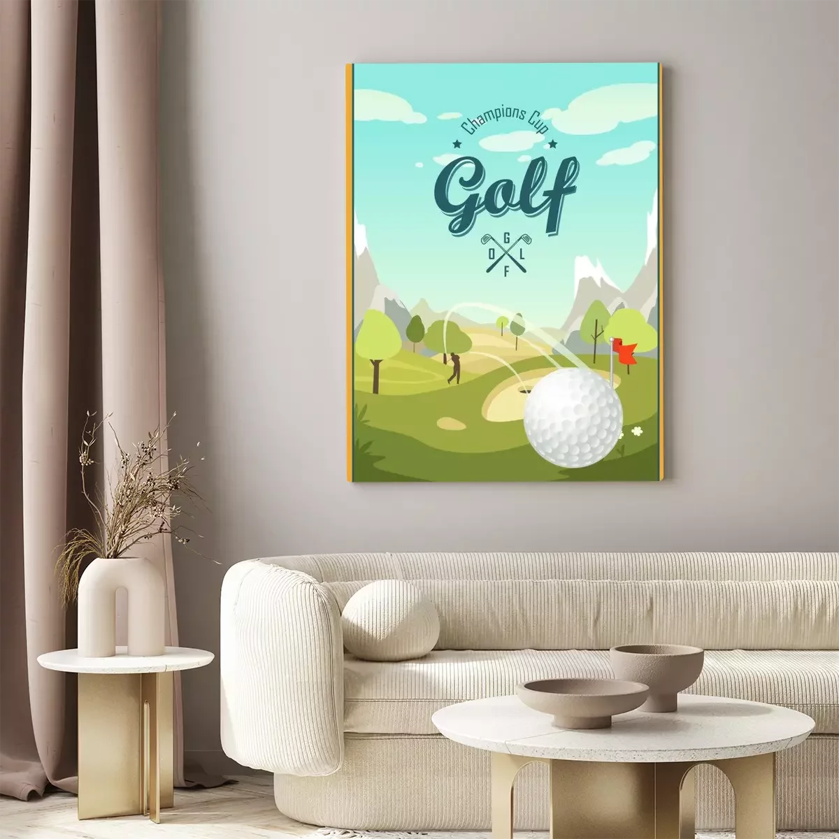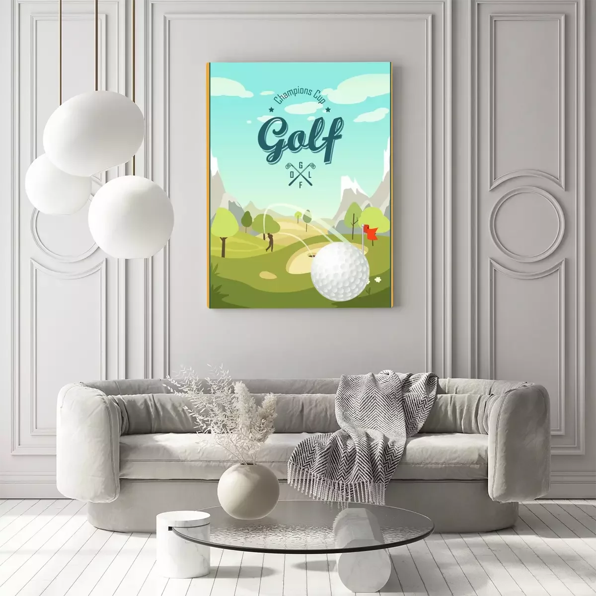 Canvas: Golfbal en een prachtig landschap. Golf Club. Affiche voor sport