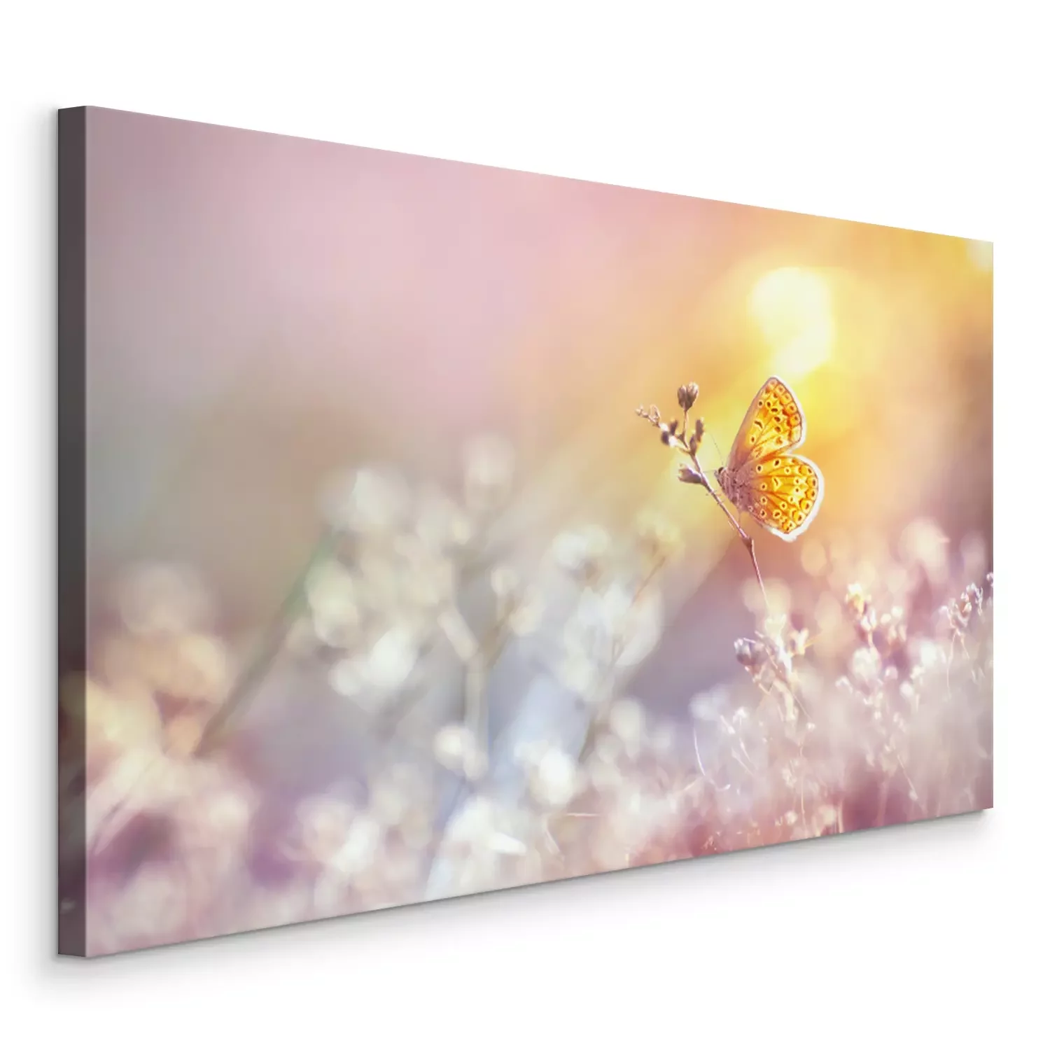 Canvas: Gouden vlinder gloeit in de zon bij zonsondergang, macro. Wild gras op een weide in de zomer in de stralen van de gouden zon. Romantisch zacht artistiek beeld van levende dieren in het wild.