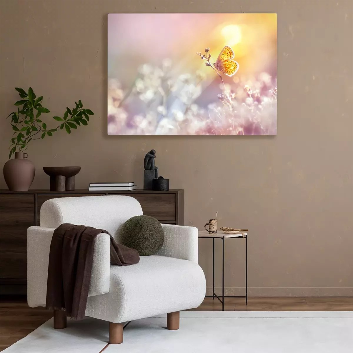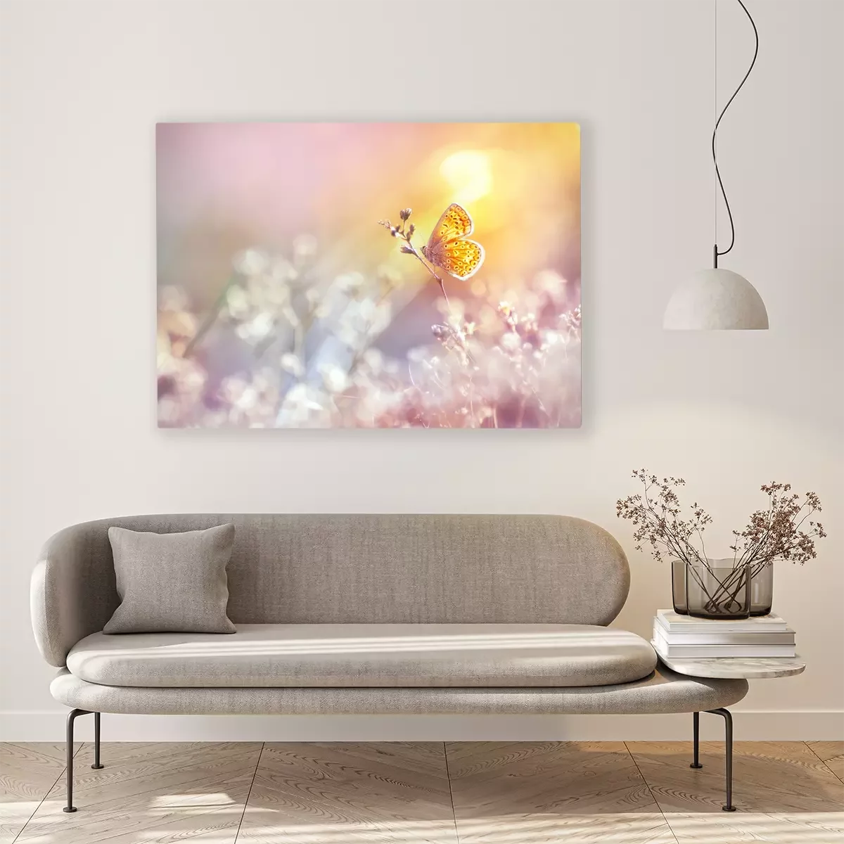 Canvas Gouden vlinder gloeit in de zon bij zonsondergang, macro. Wild gras op een weide in de zomer in de stralen van de gouden zon. Romantisch zacht artistiek beeld van levende dieren in het wild.