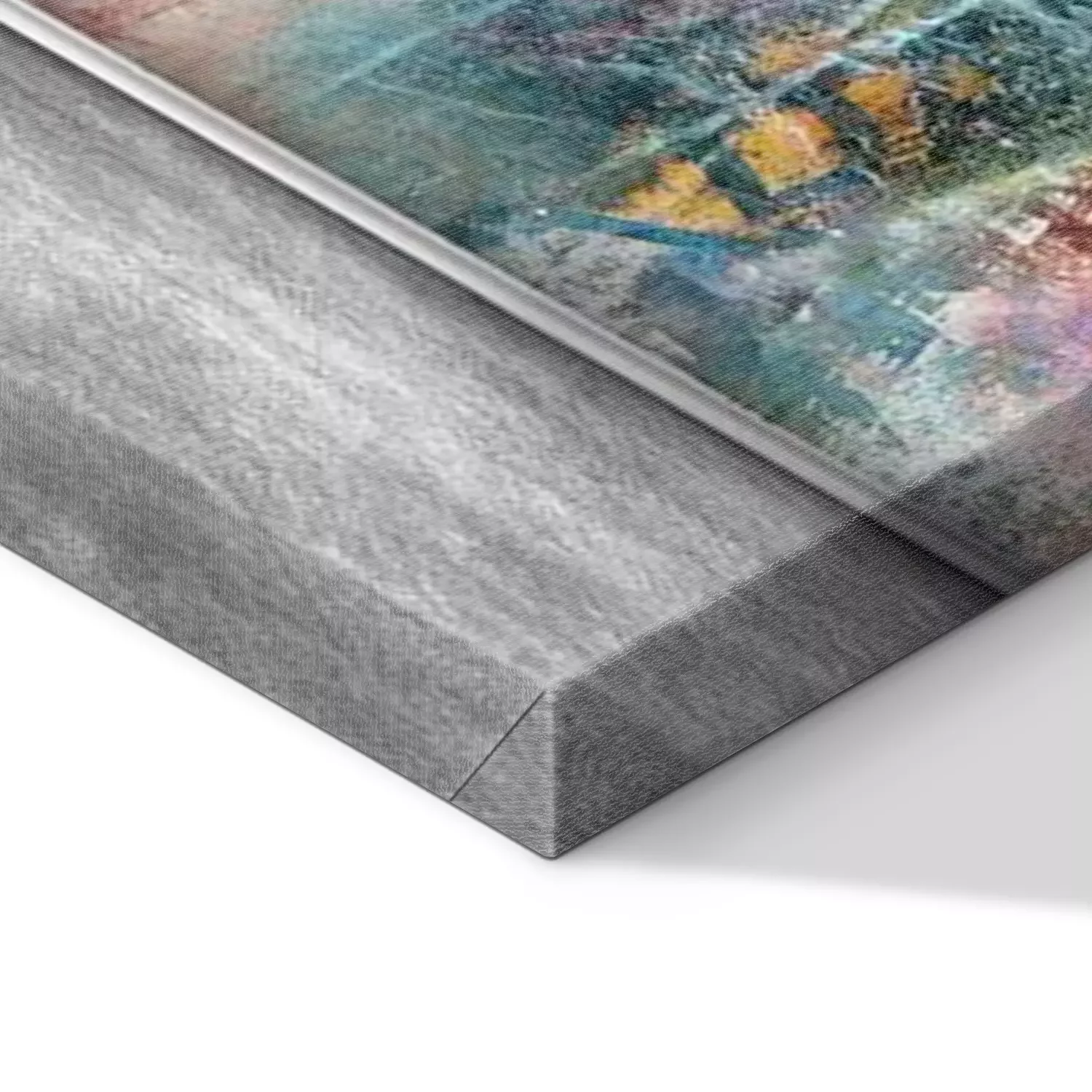 De print wordt aangebracht op hoogwaardig canvas dat op een schildersweefgetouw (spieraam) wordt gespannen. Omdat de print de zijranden bedekt, hoeft het ontwerp niet met een extra kader te worden omlijst. Wij raden ook composities aan die uit meerdere foto's bestaan en zo een coherente compositie vormen.