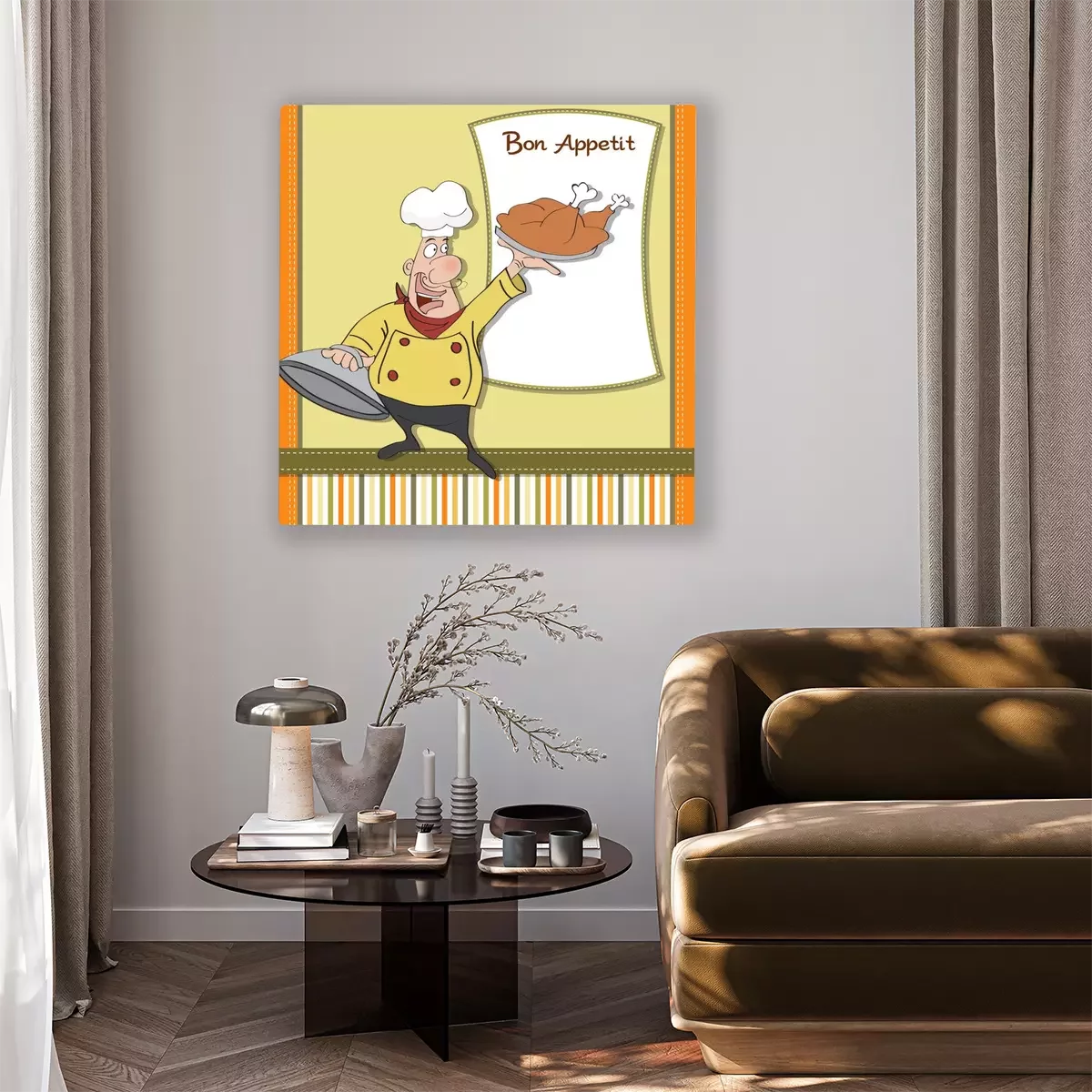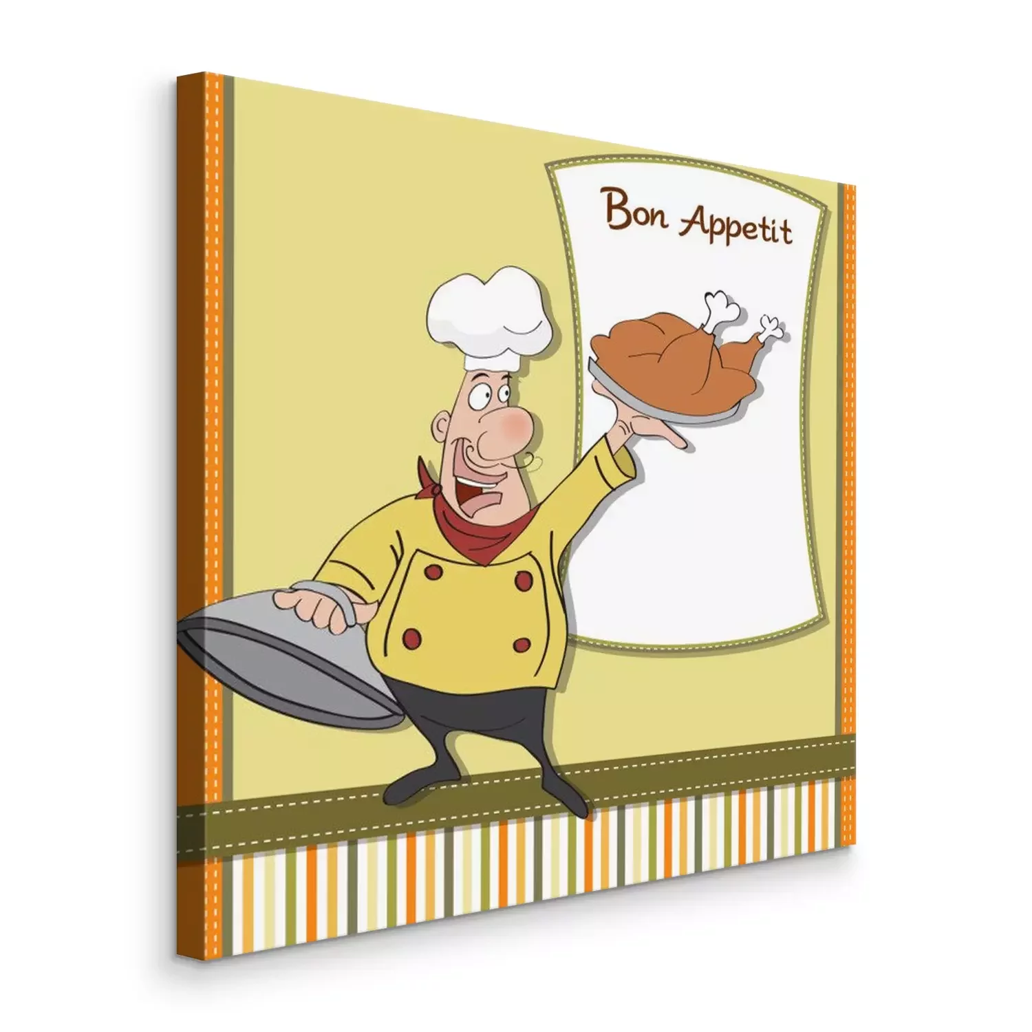 Canvas: grappige cartoon chef-kok met lade van voedsel in de hand