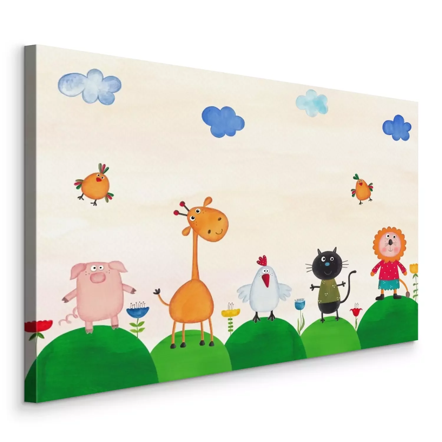 Canvas Grappige dieren op groene heuvels